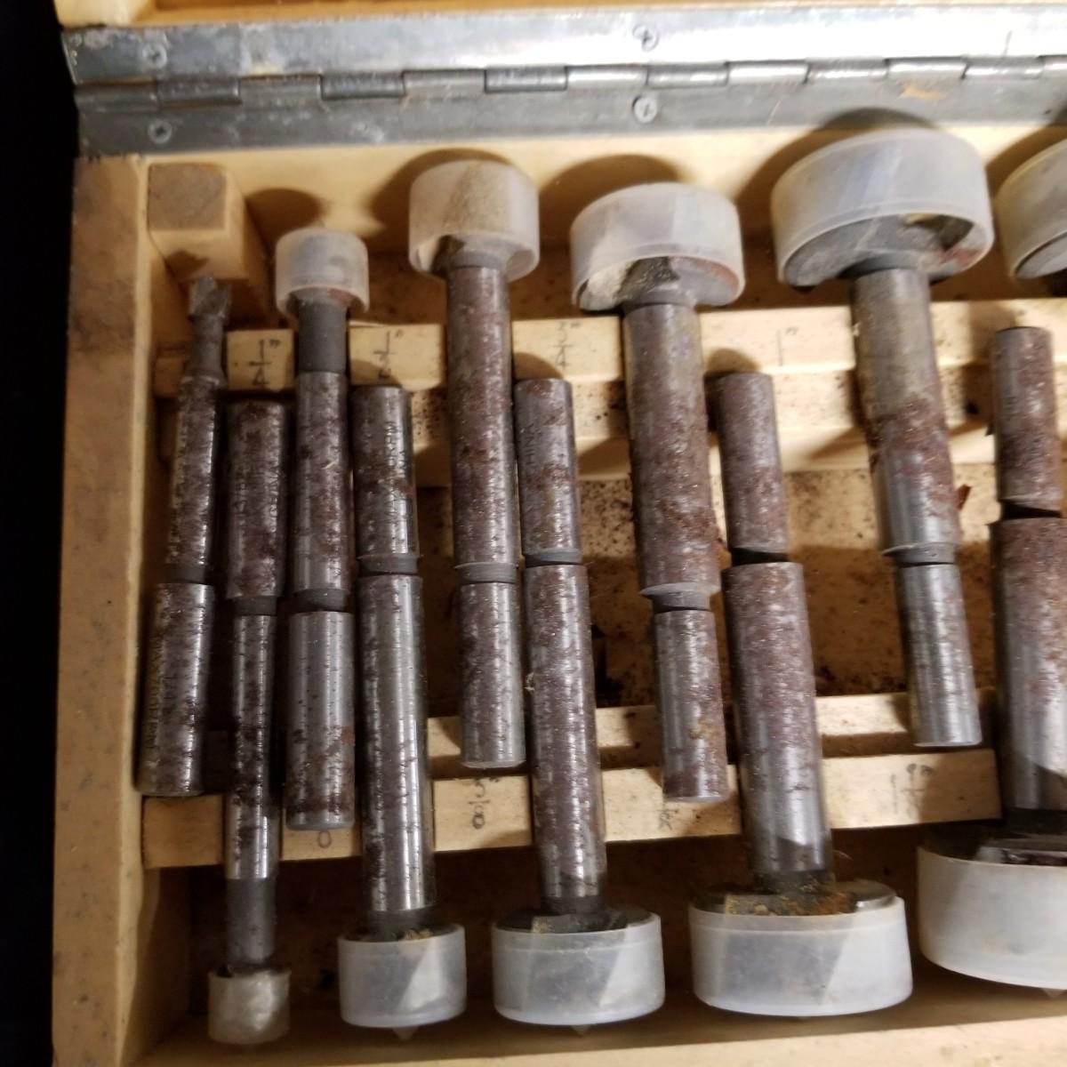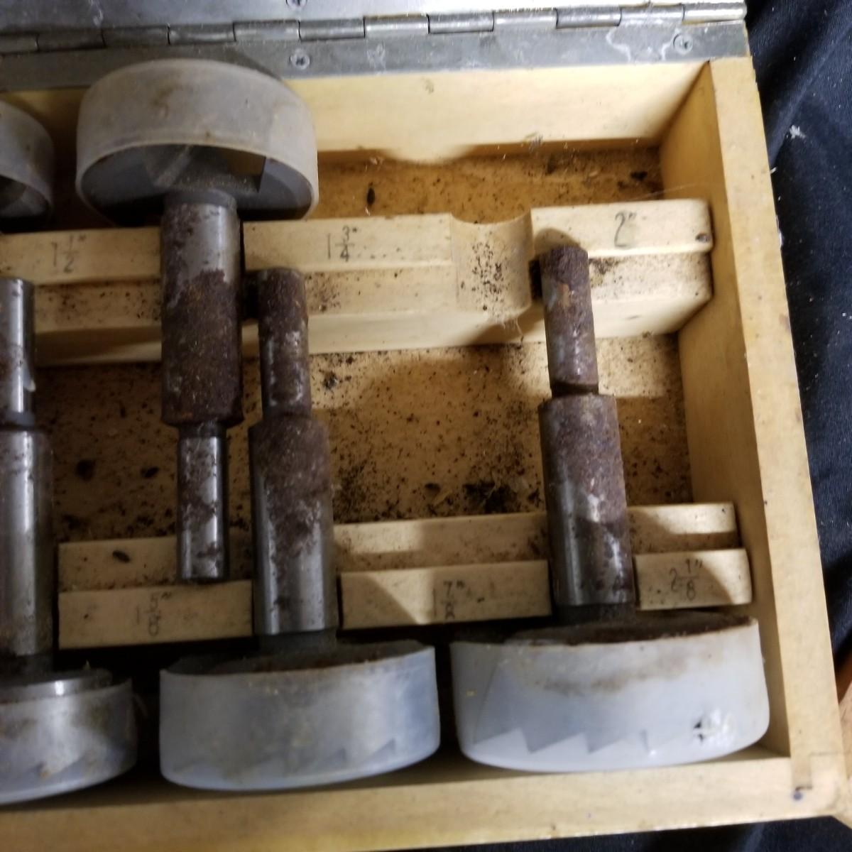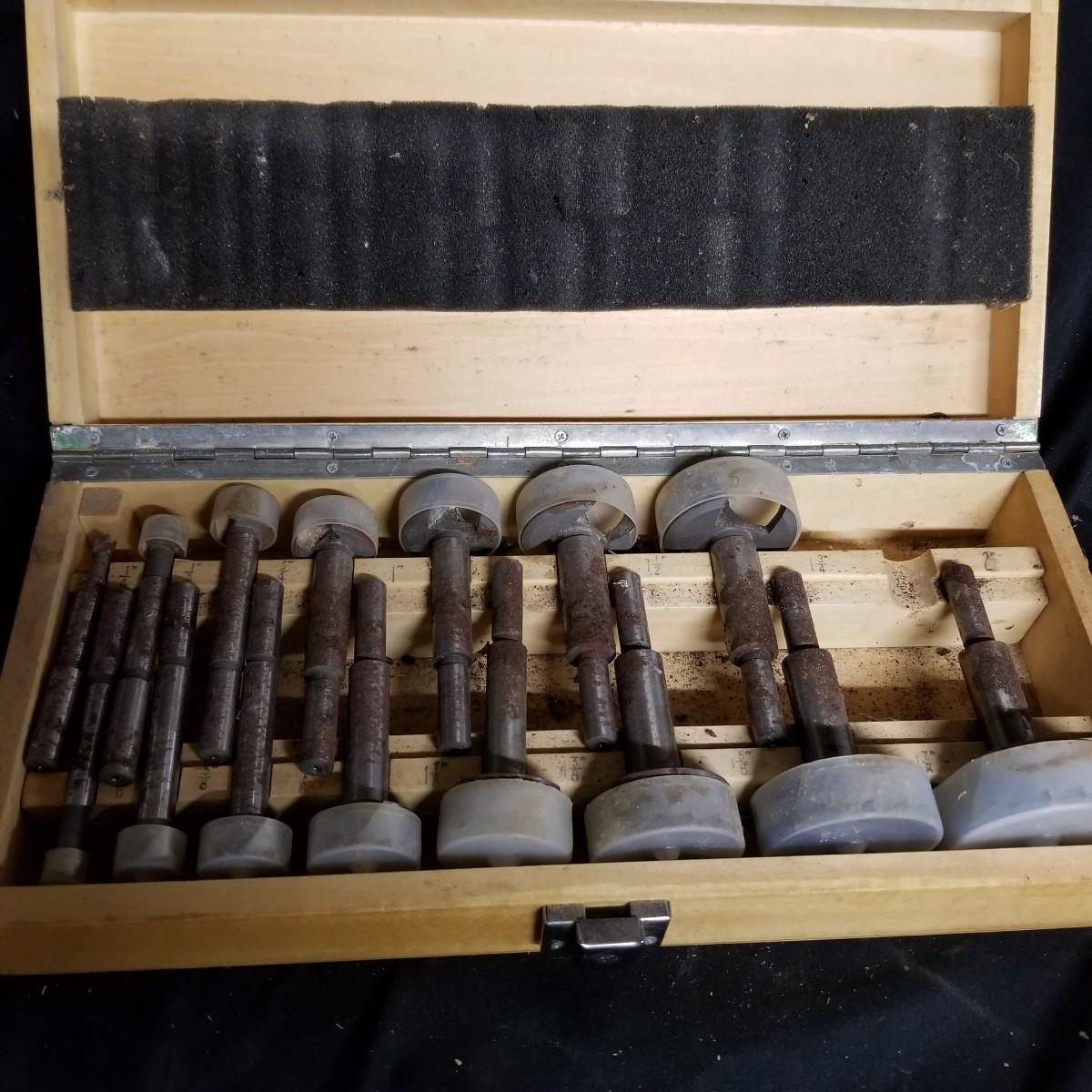 Three box sets of forstner bits.  Sizes range from 1/4" to 2" d.  Plastic safety caps on some.  Some duplication of sizes across the three sets. Twenty-seven total pieces. Some items show minor wear and rust, see photos. Shipping available.