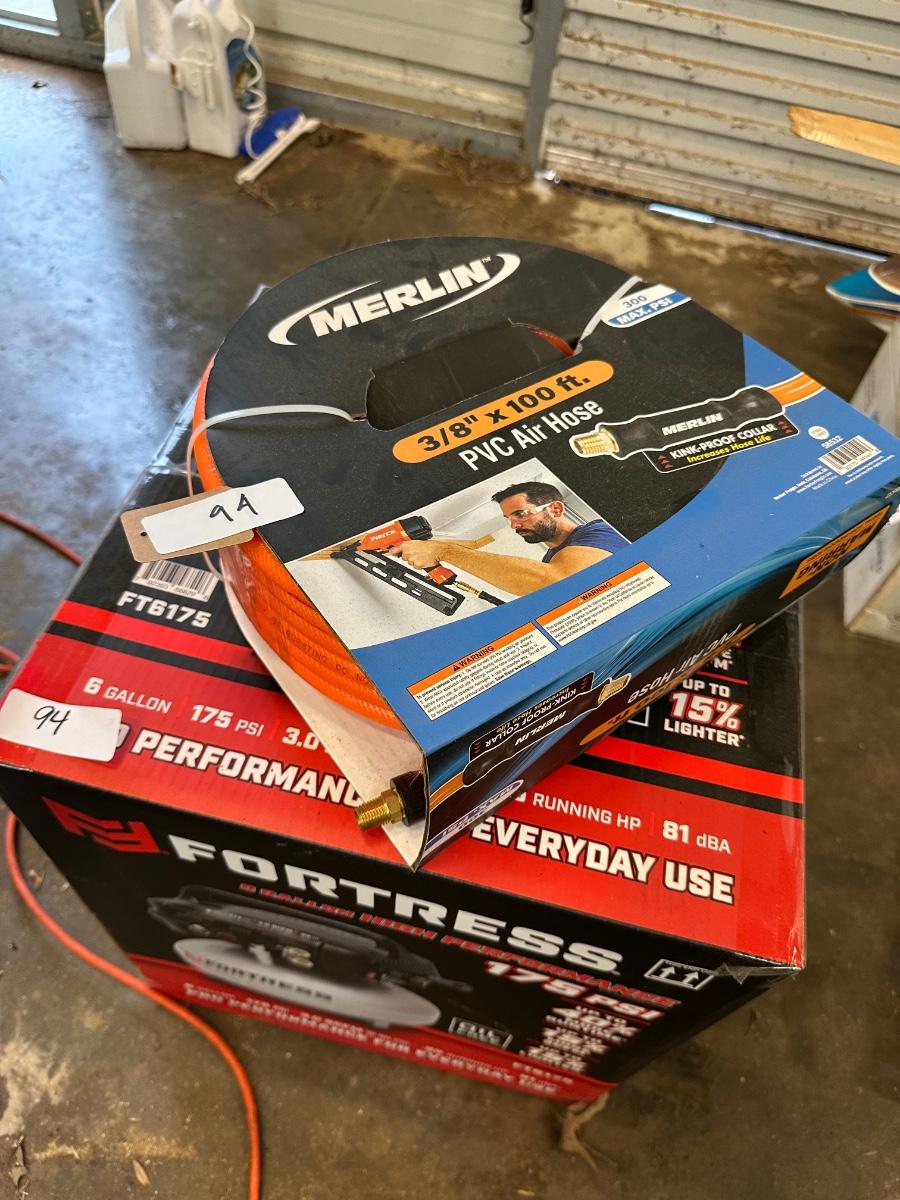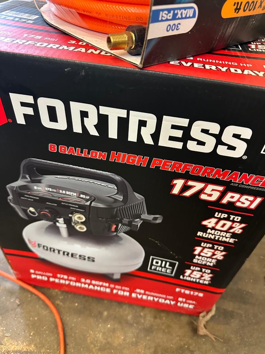 FORTRESS 6 GALLON AIR COMPRESSOR NEW IN BOX, W/ 100 FT HOSE AS PICTURED
