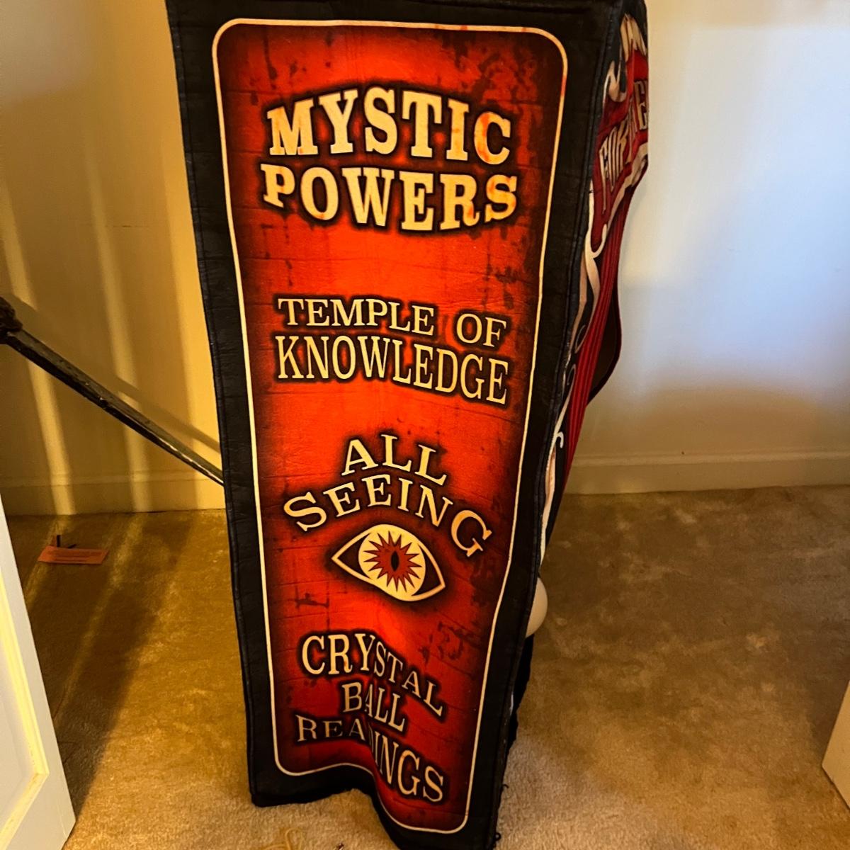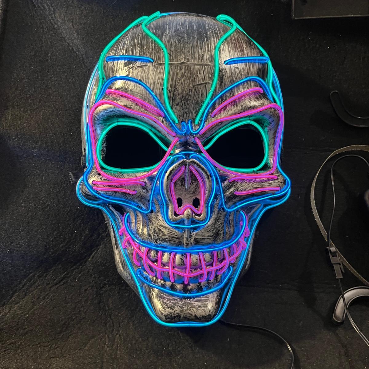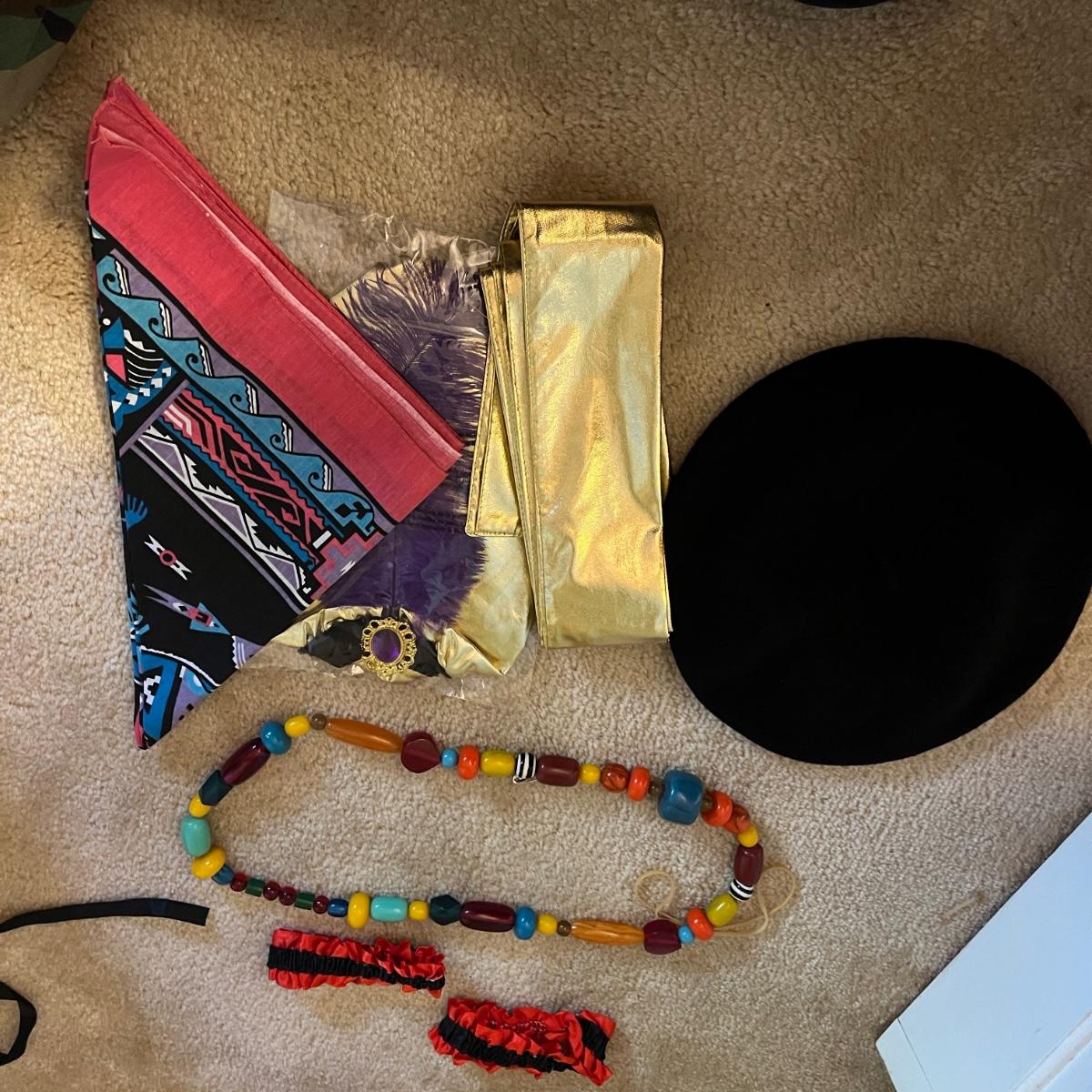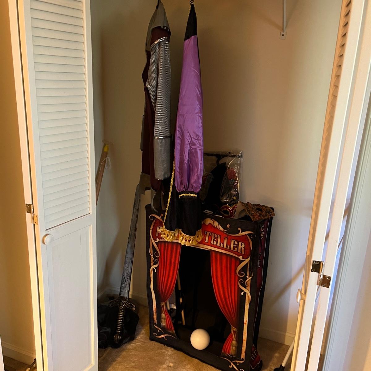 Lot includes a Fortune Teller’s costume, two Renaissance Fair type costumes with accessories and a light up mask. Costumes appear to be size large. Fortune Teller costume measures 12” x 24” x 34”H.