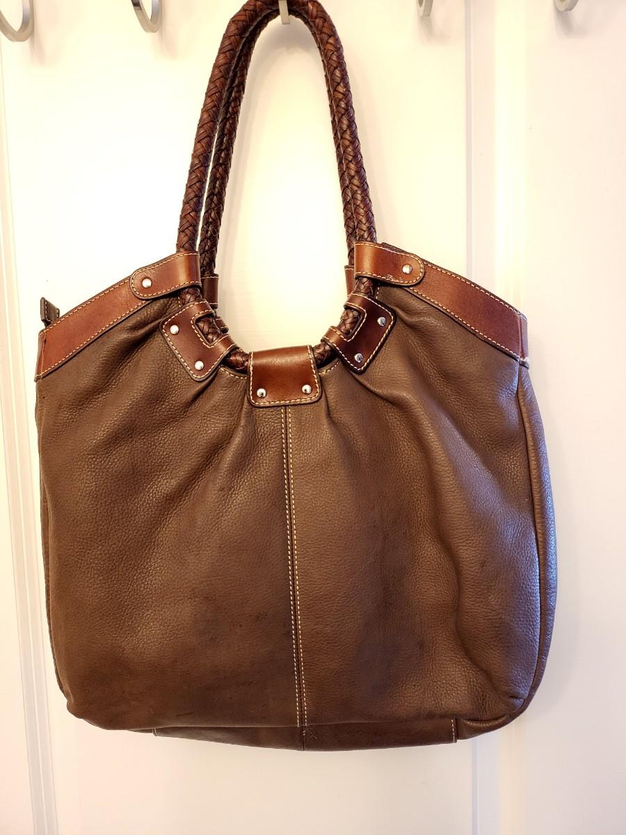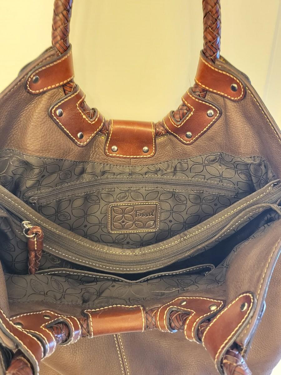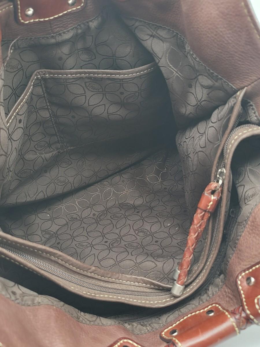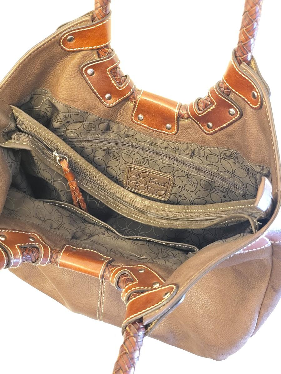 Fossil brand brown pebbled leather shoulder bag, measures 14" x 11" x 3". Double braided leather straps. Center zipper compartment & open compartment on either side. Lots of room in this stylish bag.
