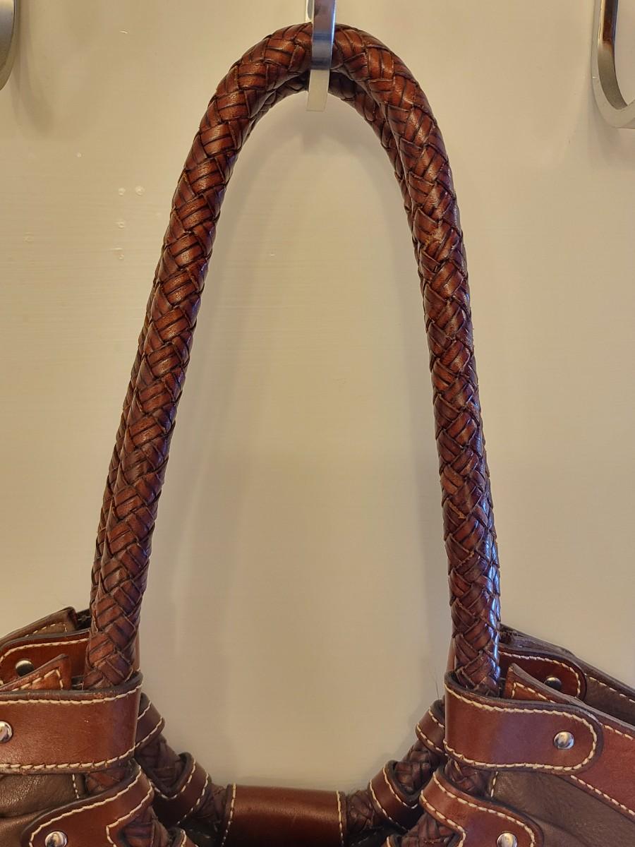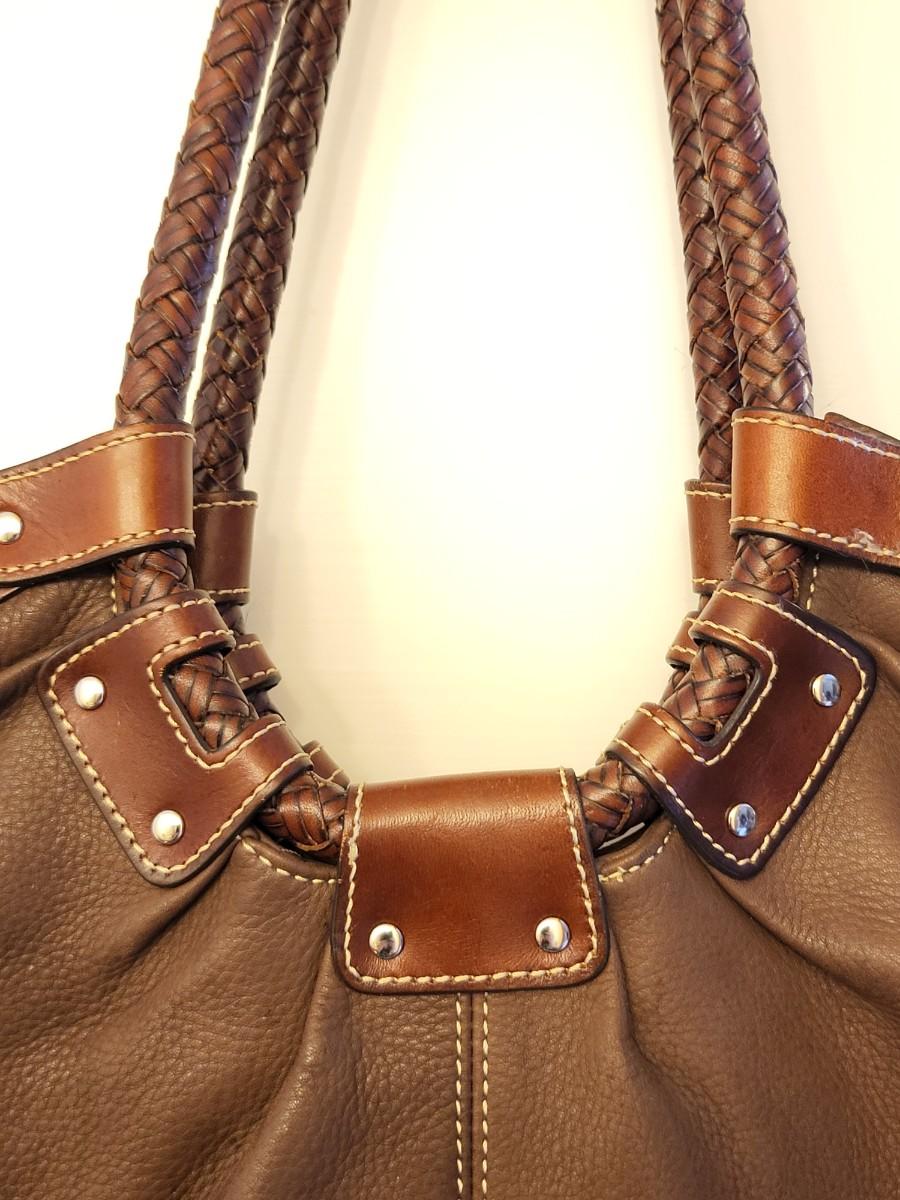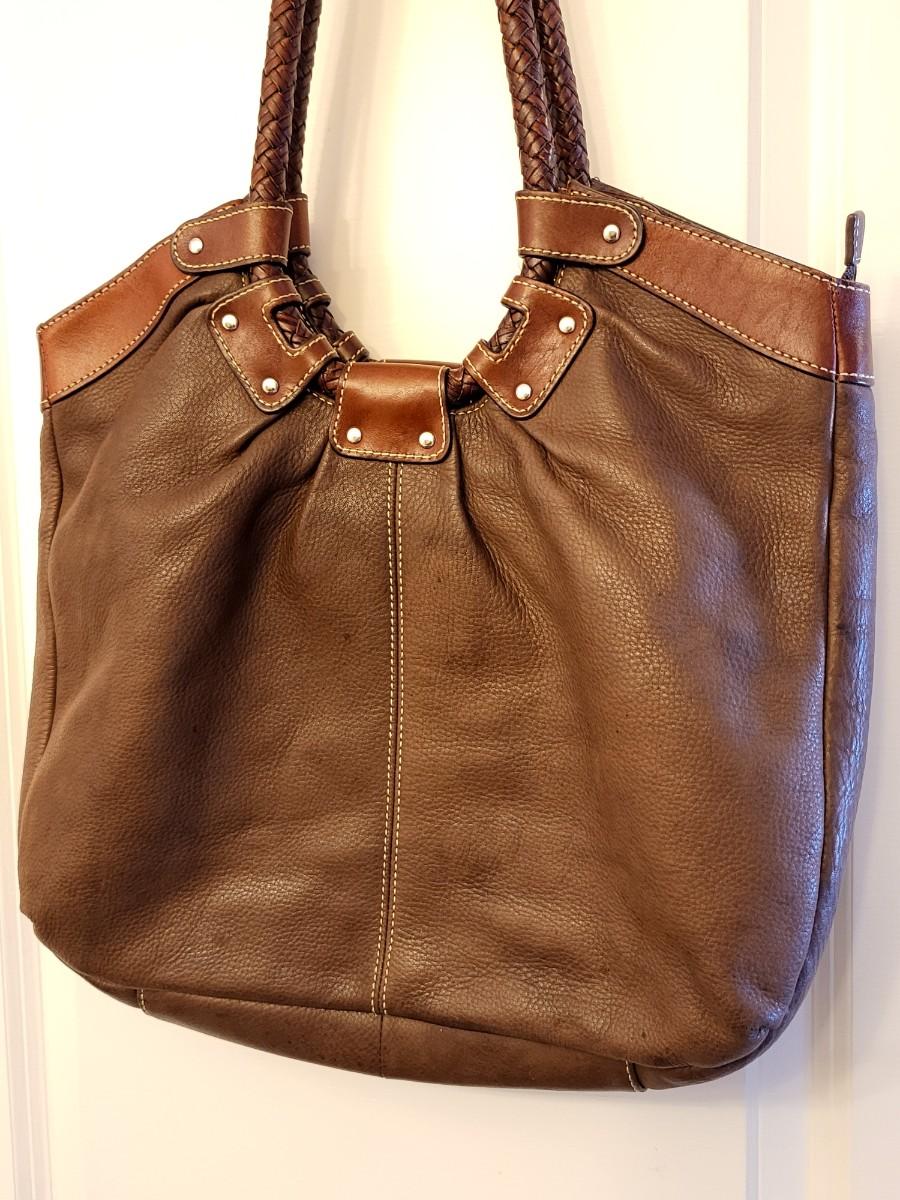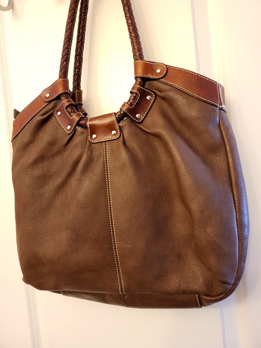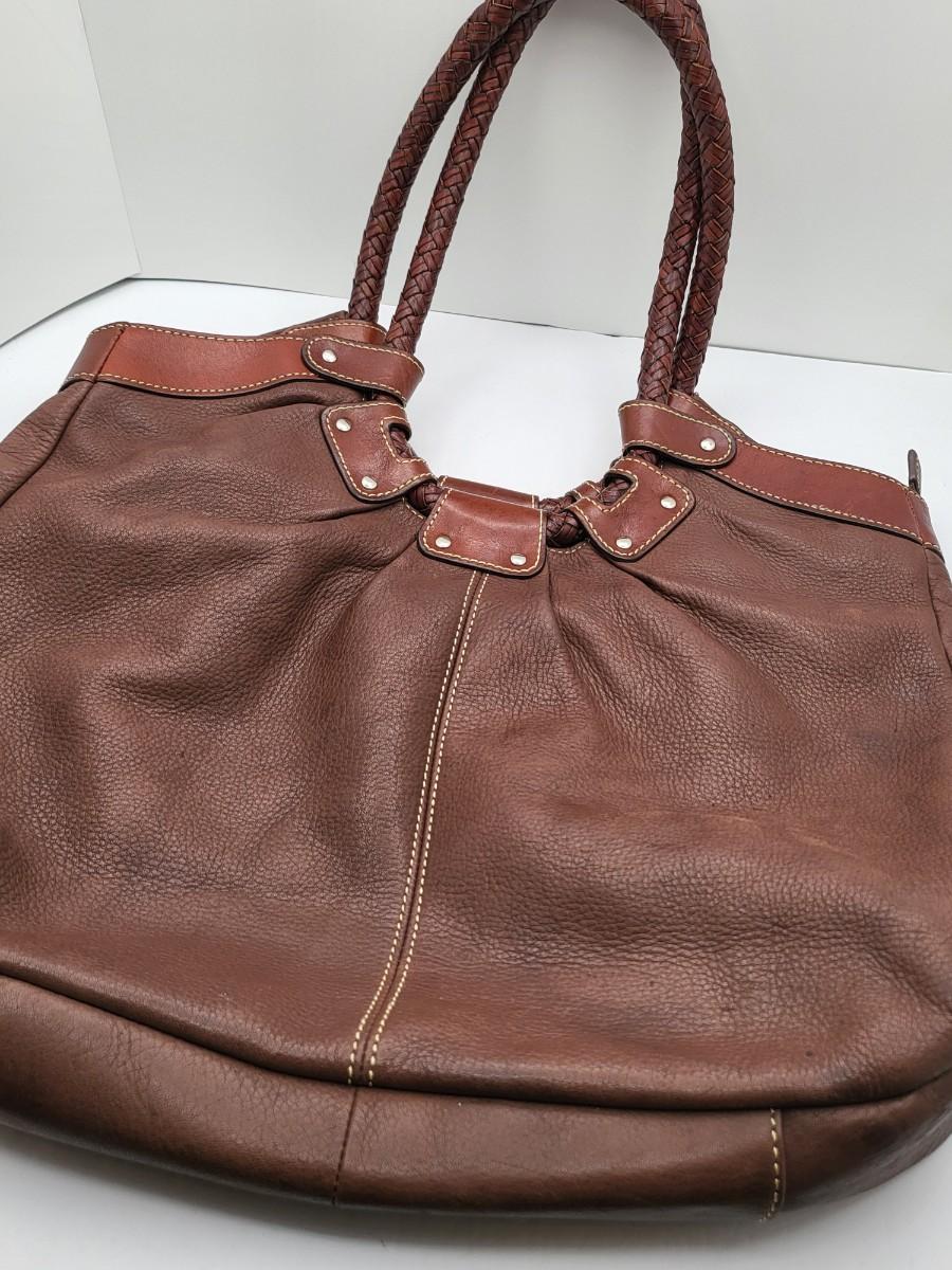 Fossil brand brown pebbled leather shoulder bag, measures 14" x 11" x 3". Double braided leather straps. Center zipper compartment & open compartment on either side. Lots of room in this stylish bag.