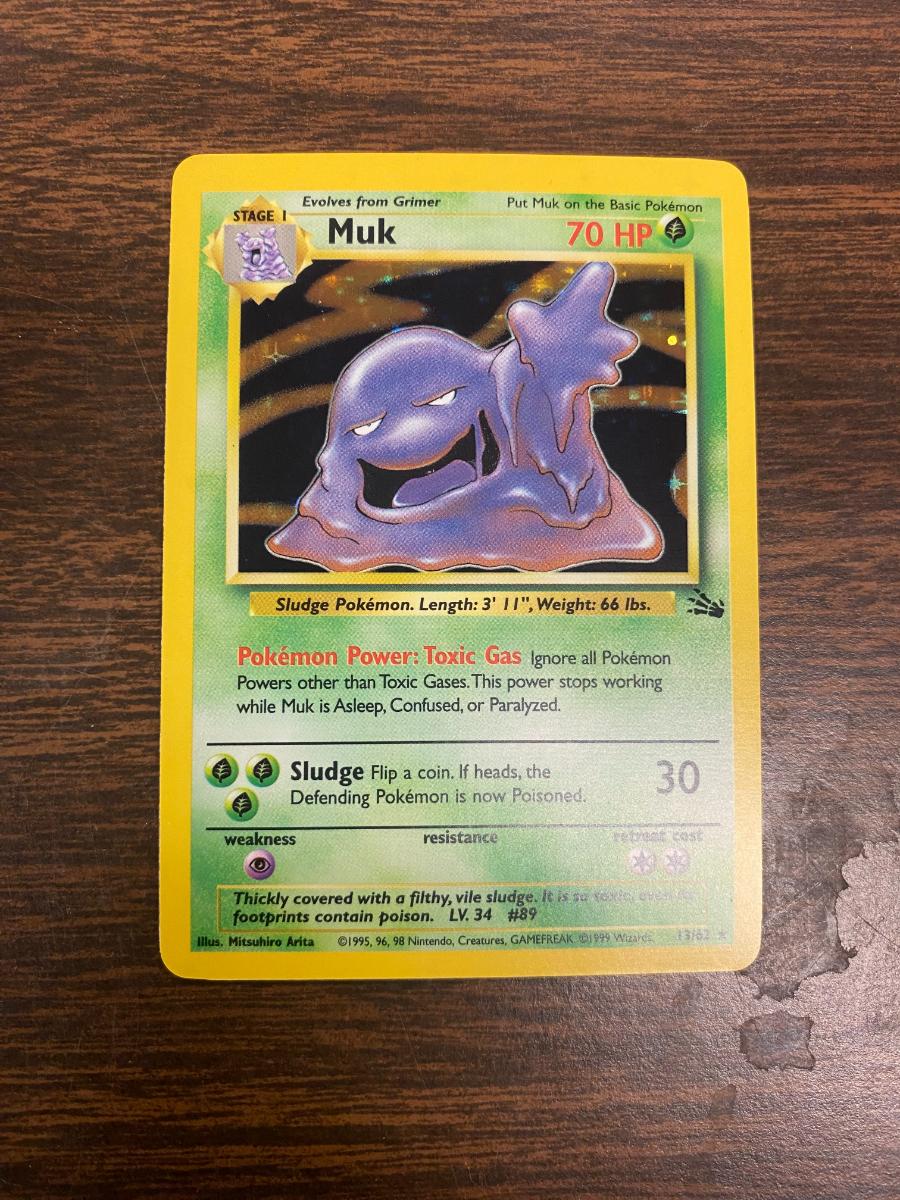 Fossil edition Muk holographic Pokemon card. Light play condition with visible signs of handling. Features 70 HP and includes moves such as Toxic Gas and Sludge Flip. Card is marked with the Fossil expansion set symbol.
