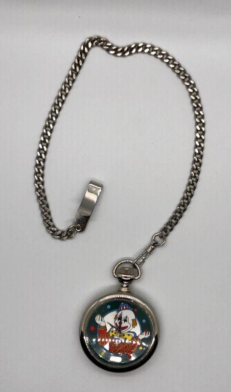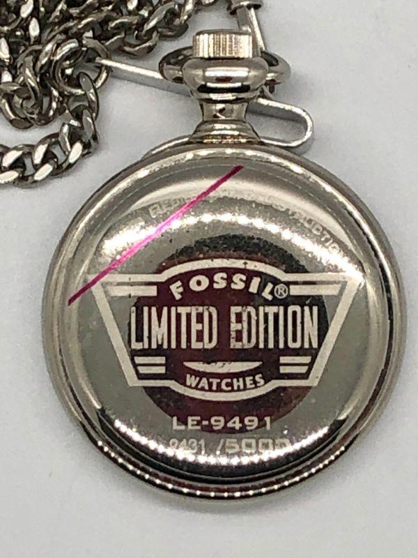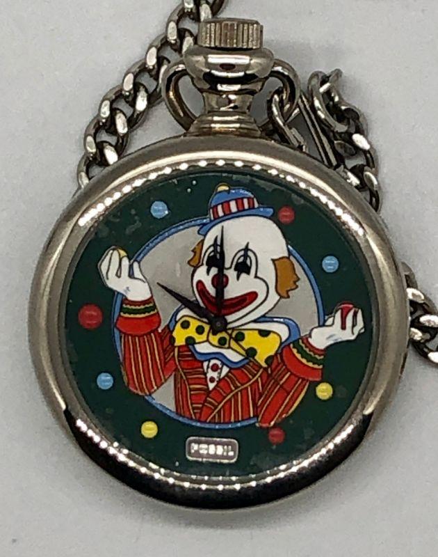Limited edition FOSSIL brand pocket watch. Features a circus clown on the face. Currently not running, but in good condition, it still has the protective plastic on the front and back. Limited edition # 2431/5000. About 2" size. Comes on a 12" chain.