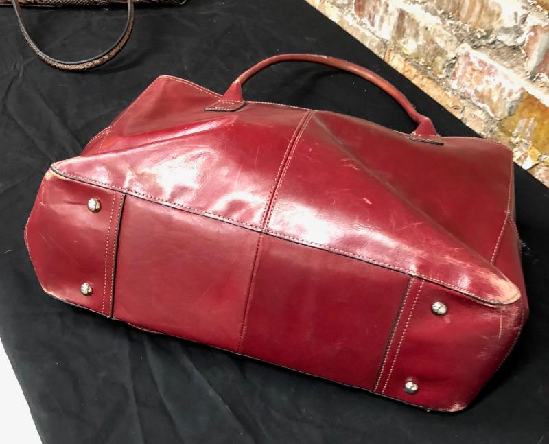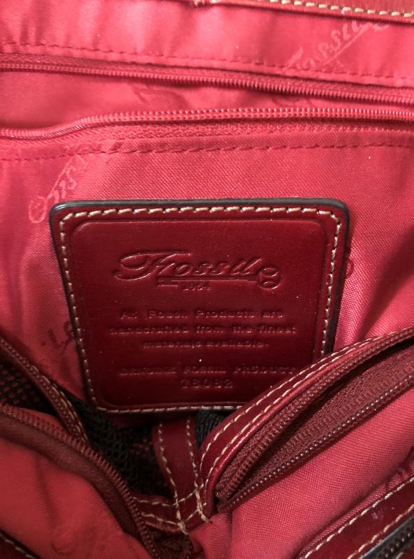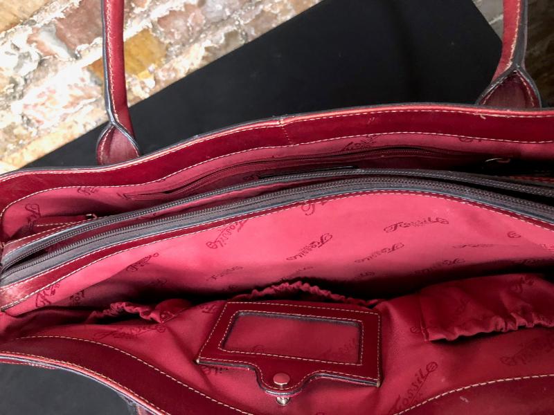 Fossil designer handbag..red Leather...Locking with key included...16 x 12 x 5"...Overall condition is good..some corner wear on color(pictured)...