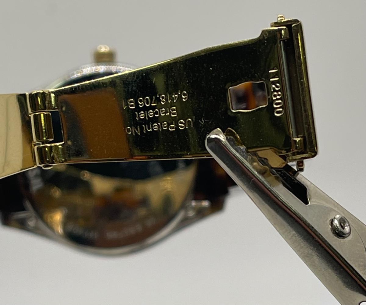 Luminous Hour and Minute hands. Also has a sweep second hand. 3 small inset dials: Day of week, date of month, and 24-hour counter. Gold-tone bejeweled bezel. Stainless Steel casebook, water resistant to 5 ATM. Stem pulls out to allow adjustment of hands, clicks solidly into place. Not running, most likely needs a new battery.
