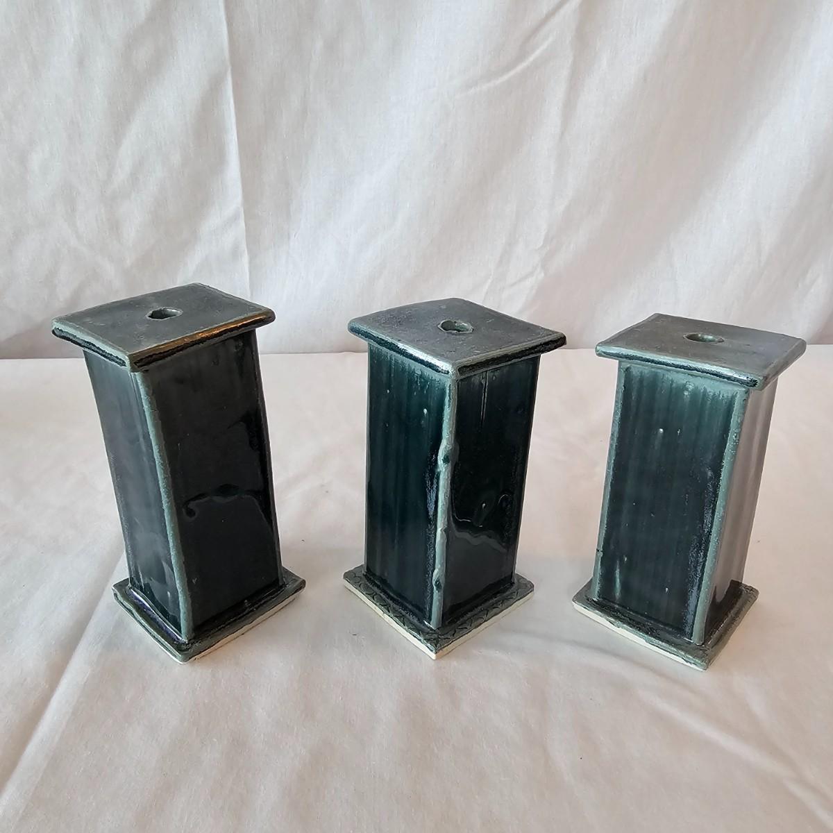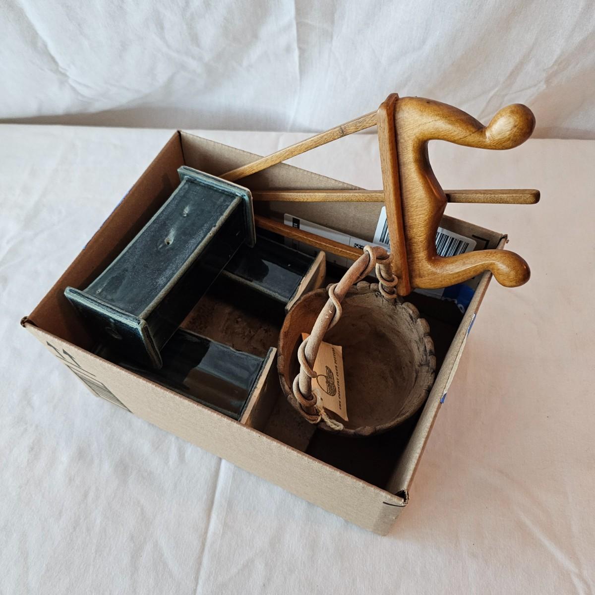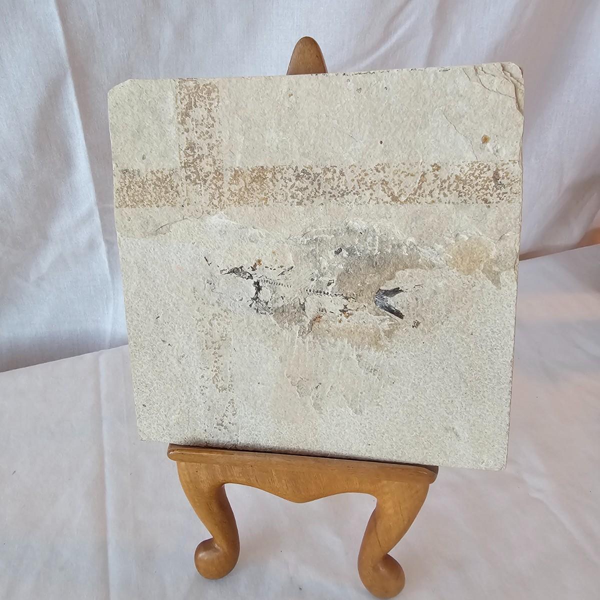 Beautiful preservation of a fish skeleton encased in flat stone. Item measures 8" x 8"H, has folding stand. Also one clay basket with carved designs and vining handle, 5"D x 7"H. Three blue glazed candle holders with lipped tops & bottoms. Each measures 2.75" x 2.75" x 5.5"H. See photos for details. Shipping available.