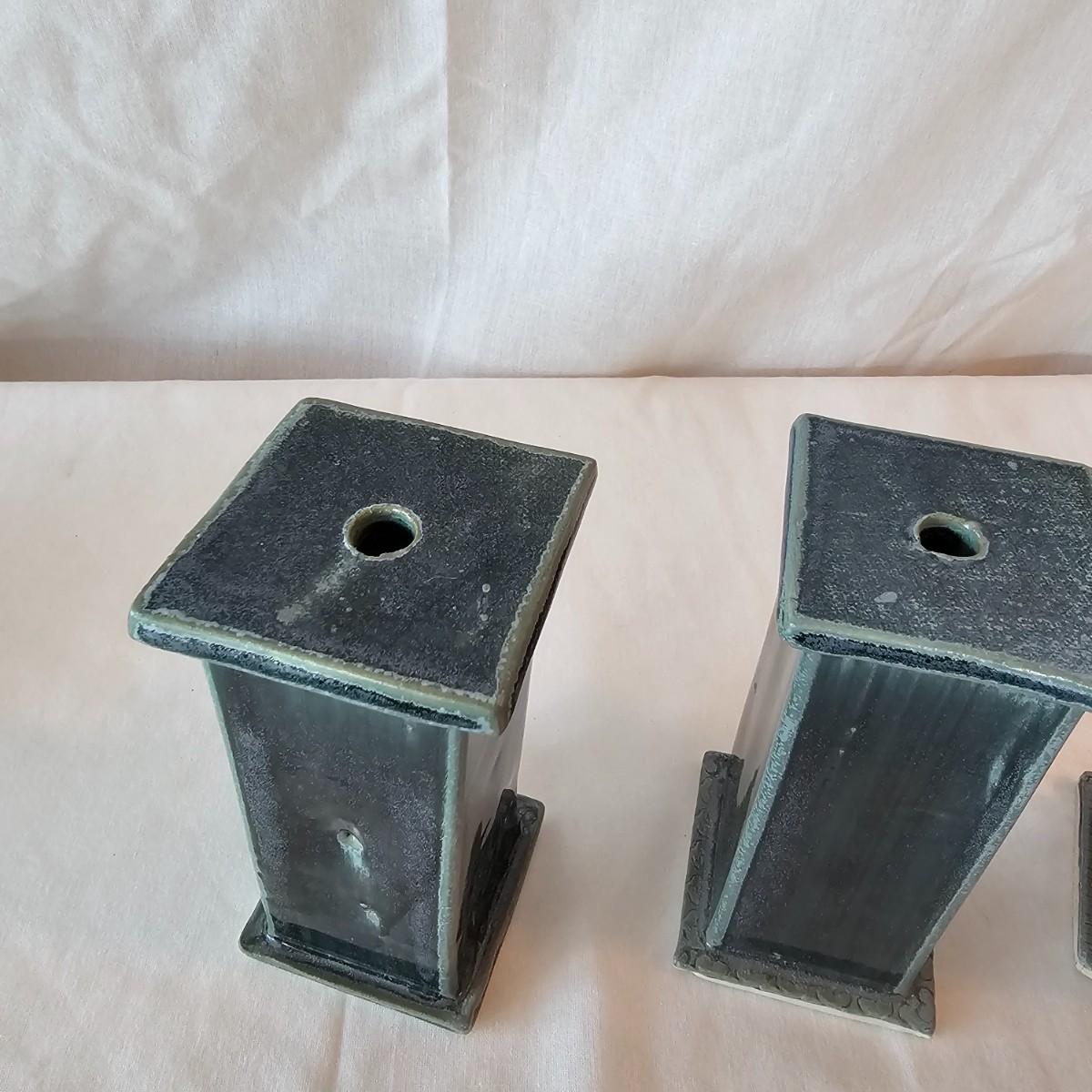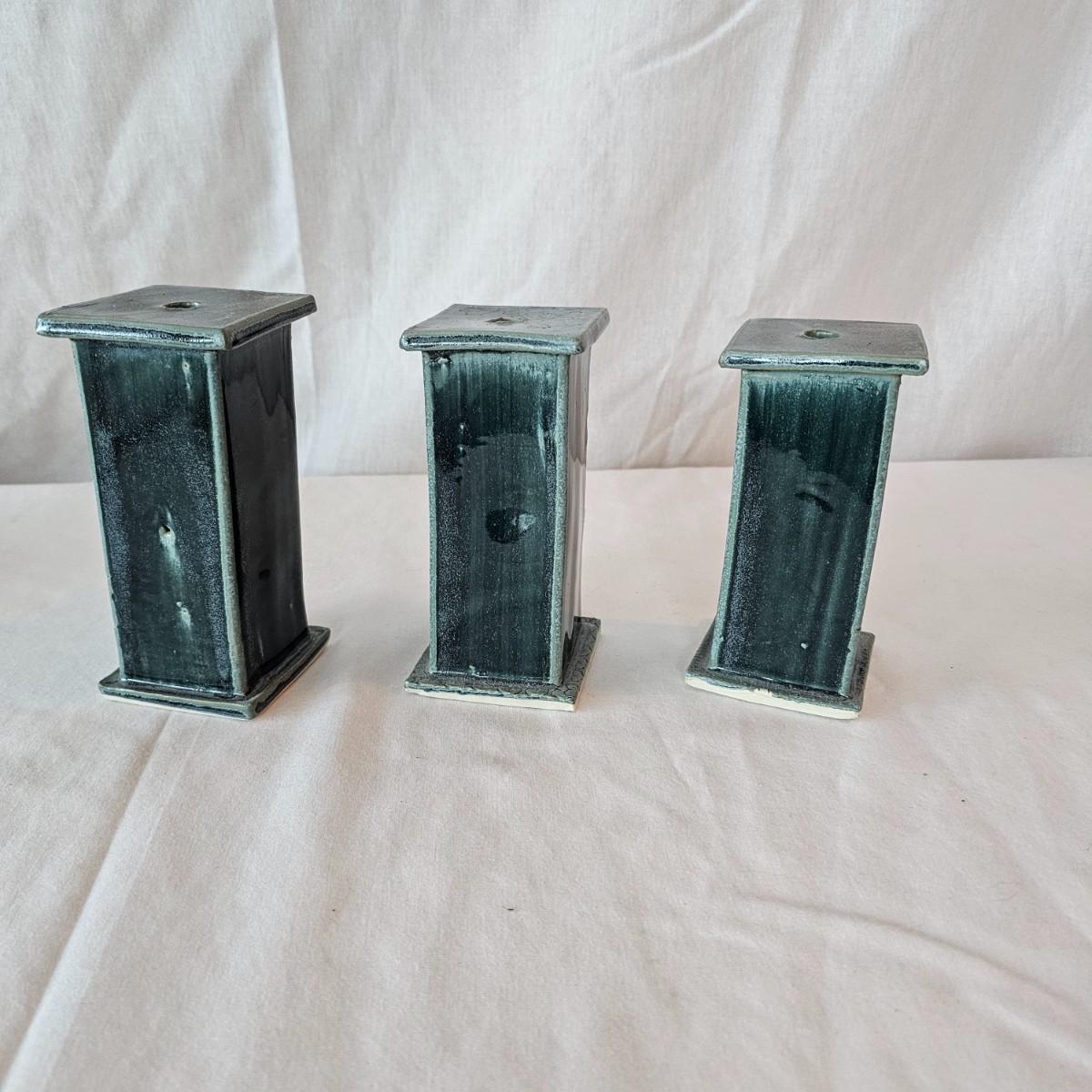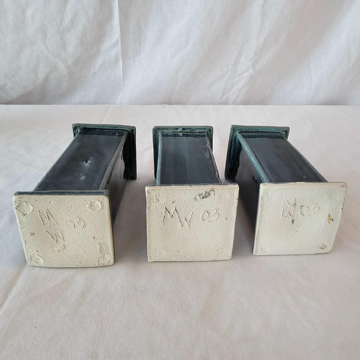 Beautiful preservation of a fish skeleton encased in flat stone. Item measures 8" x 8"H, has folding stand. Also one clay basket with carved designs and vining handle, 5"D x 7"H. Three blue glazed candle holders with lipped tops & bottoms. Each measures 2.75" x 2.75" x 5.5"H. See photos for details. Shipping available.