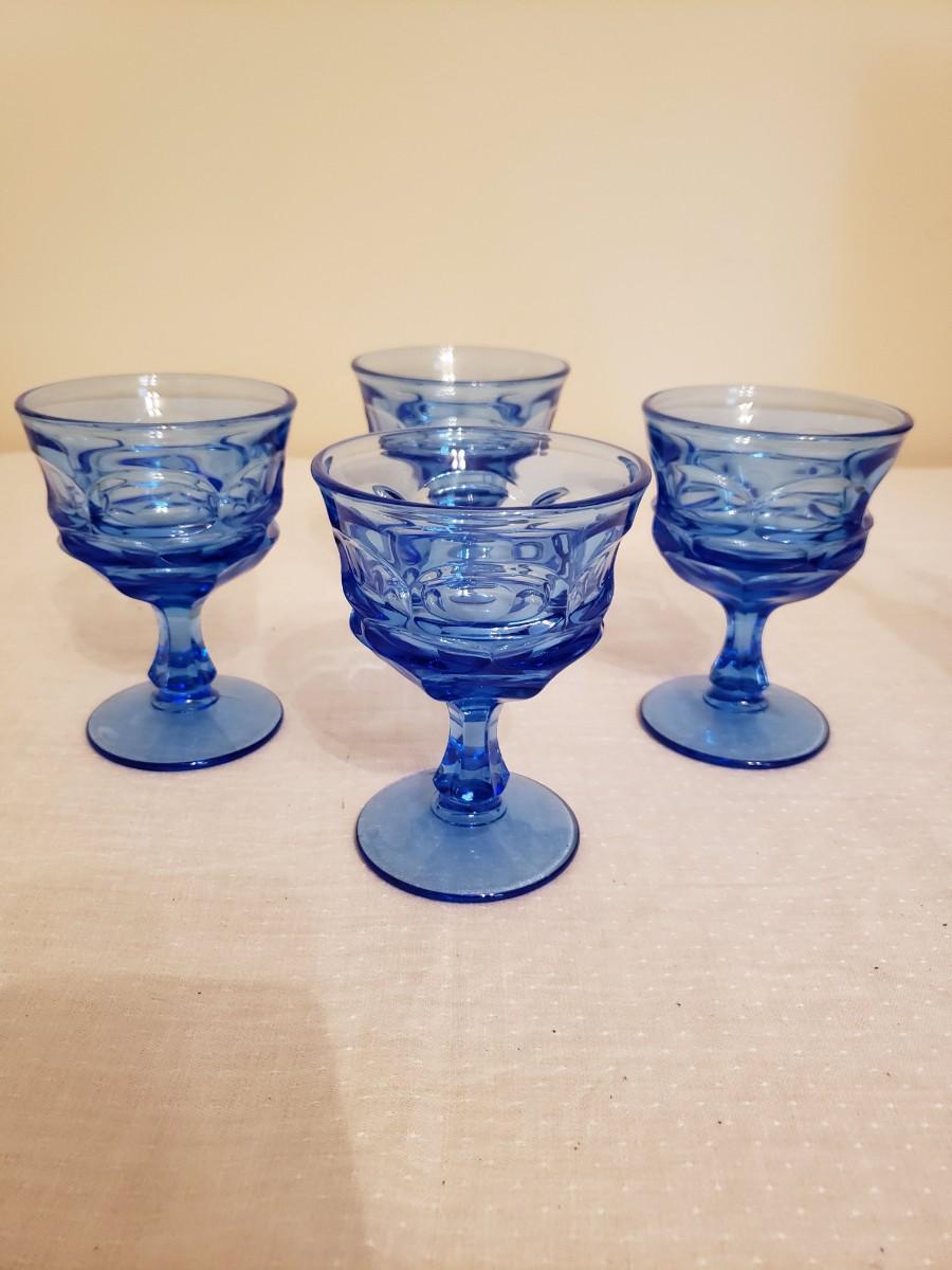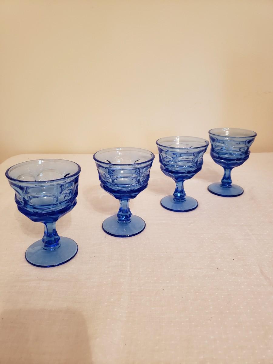 Set of 4 Fostoria Argus HFM Henry Ford Museum sherbet glasses. 5-1/4" tall. Colbolt blue. Excellent condition.