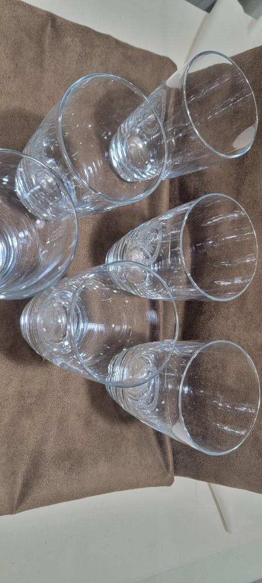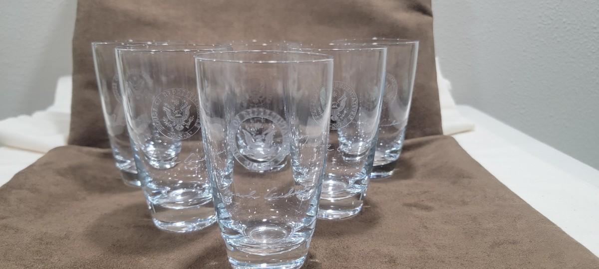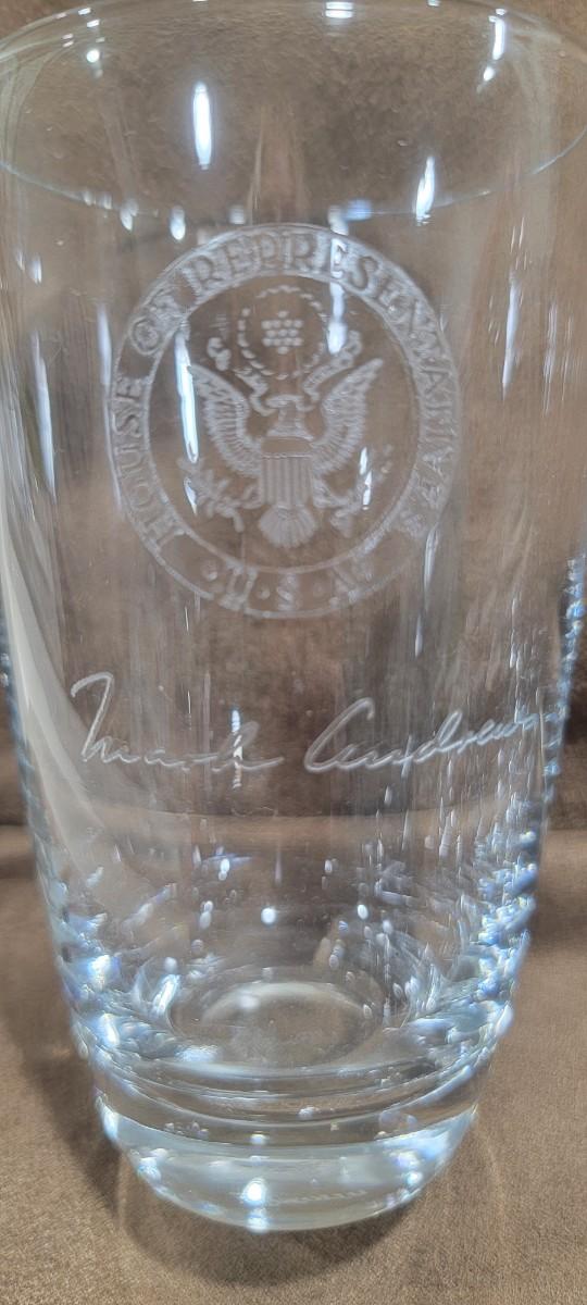 Set of six Fostoria beverage glasses. 5" H. Each are inscribed with the signature if Mark Andrews and the House of Representatives USA seal. Mark Andrews served from 1963-1981 in the House if Representatives. Great collector's item.