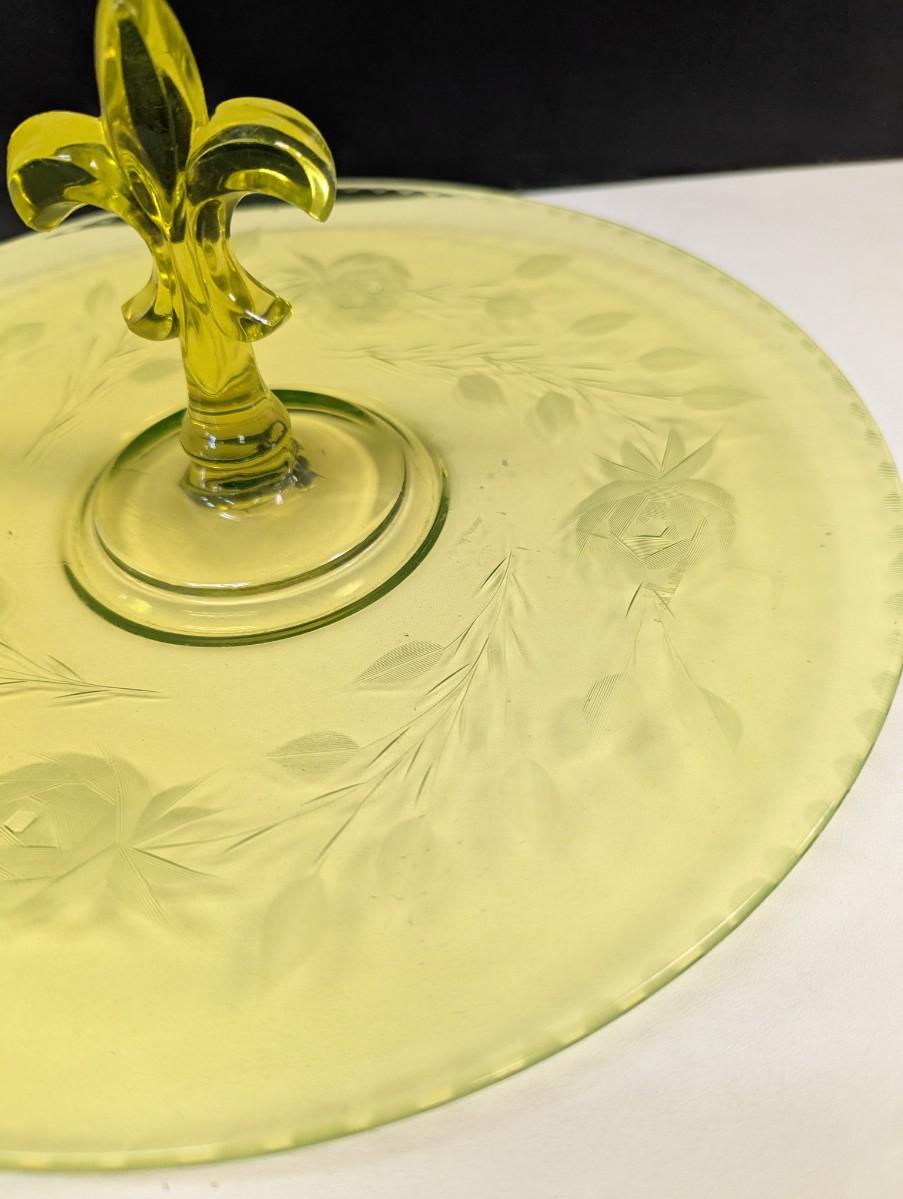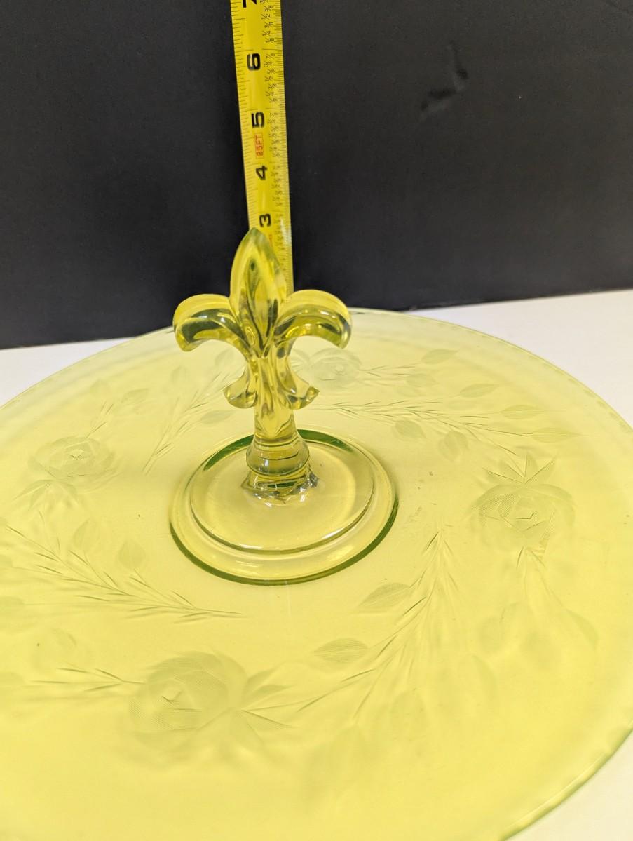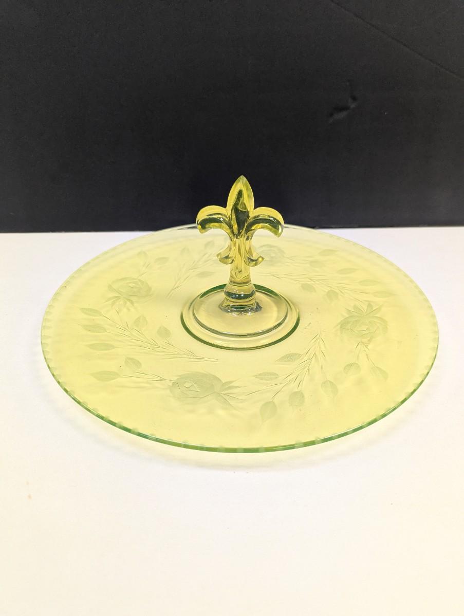 Fostoria Canary Yellow Vaseline Fleur De Lis Center Handled Server