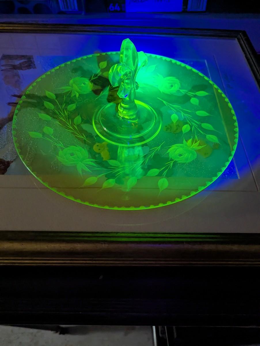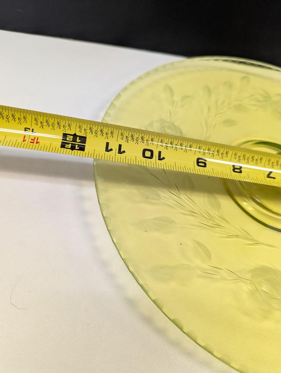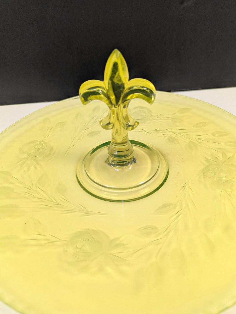 Fostoria Canary Yellow Vaseline Fleur De Lis Center Handled Server