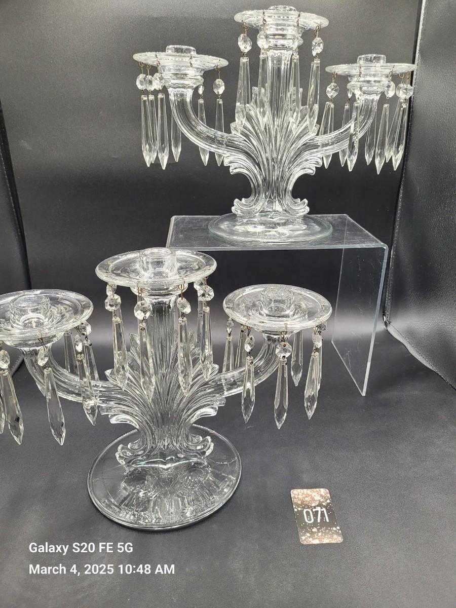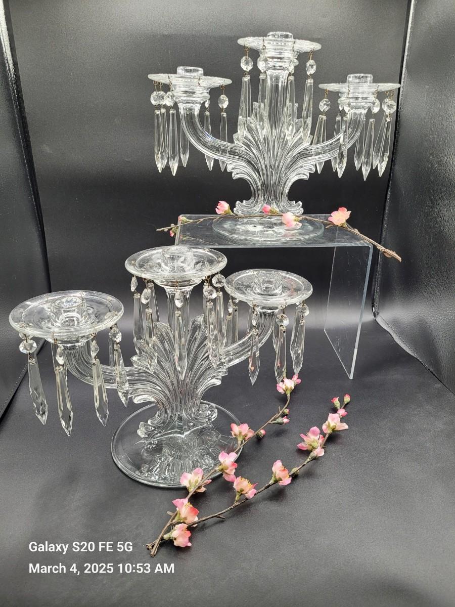 3 arm elegant Candelabra, each one has 3 Bobeches holding 6 crystal pendants.