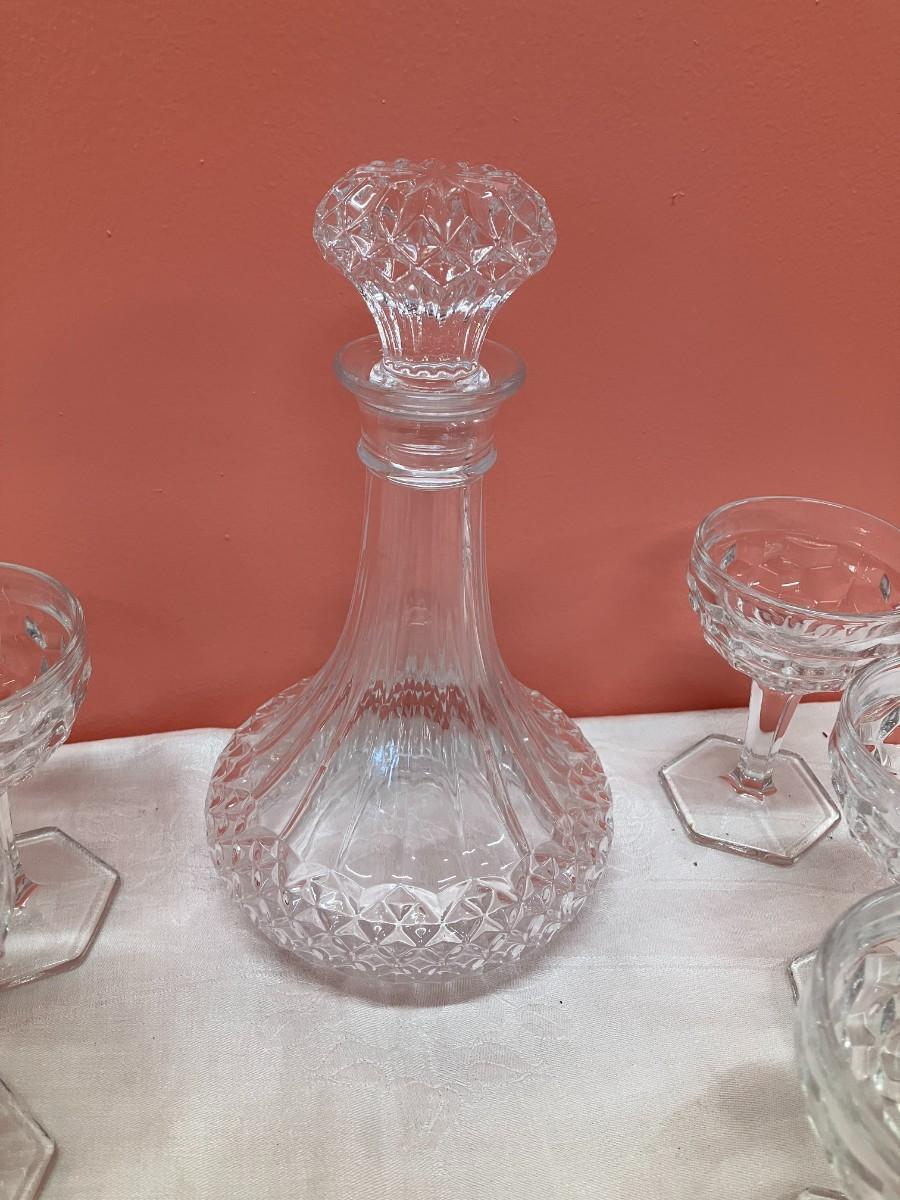 Vintage glass decanter and set of 7 Fostoria champagne glasses