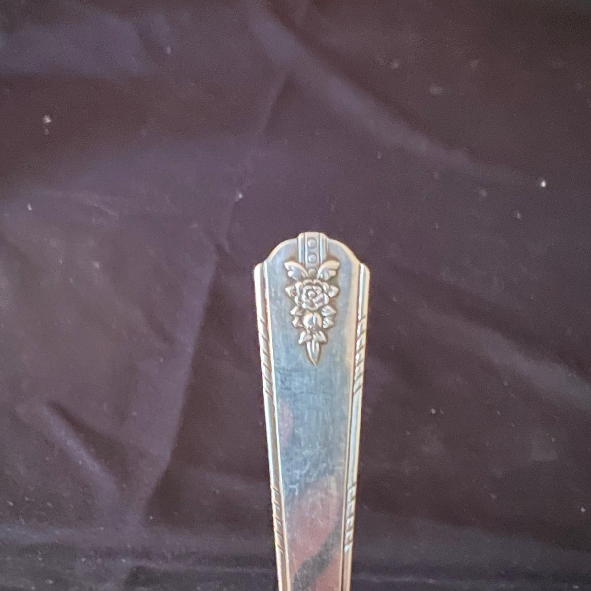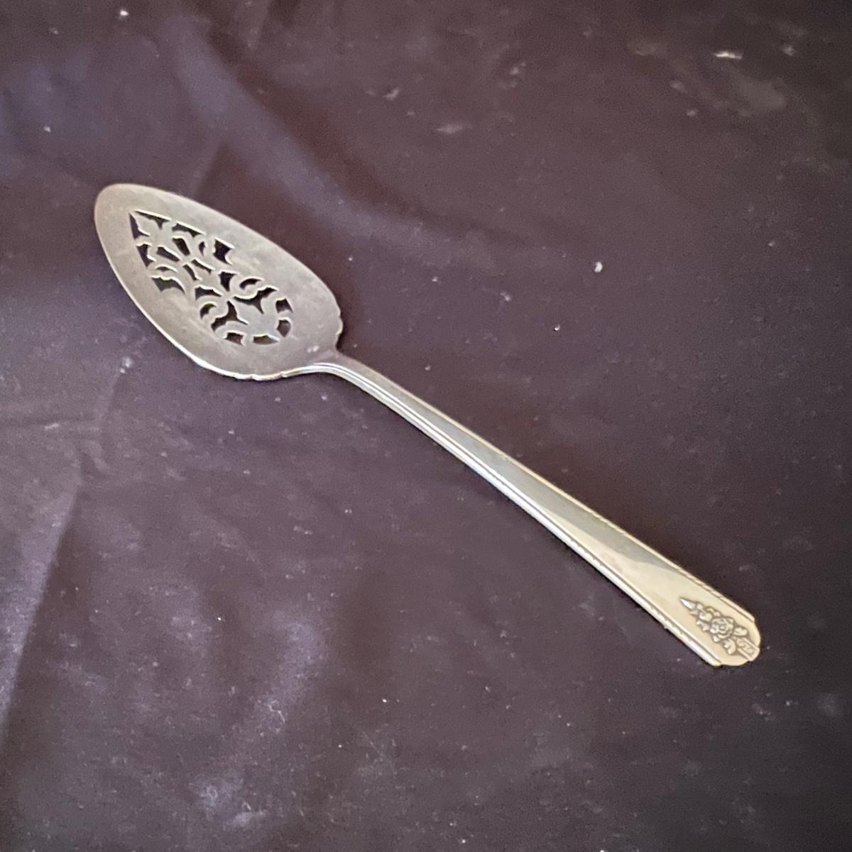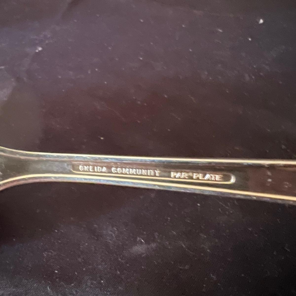 Six white glass dessert plates measure 8” diameter and are accompanied by a Fostoria cake stand and a silver plated Oneida Community pie knife. We did find a sticker near but not on the cake stand so we cannot guarantee its authenticity, it measures 10” square x 7” H.