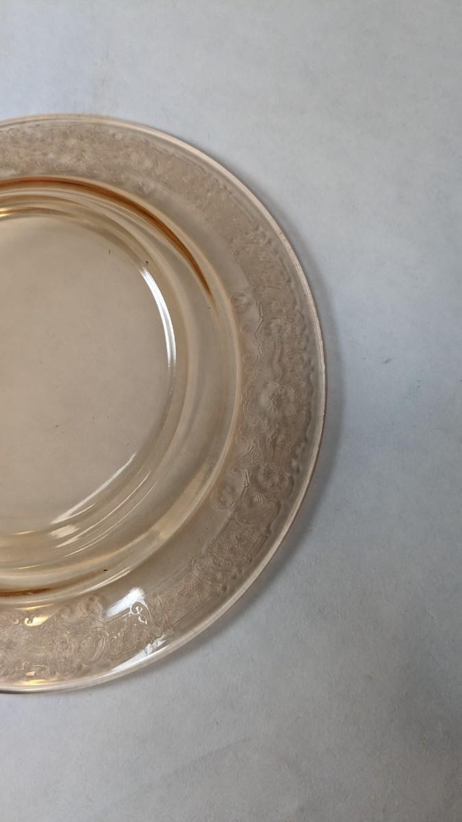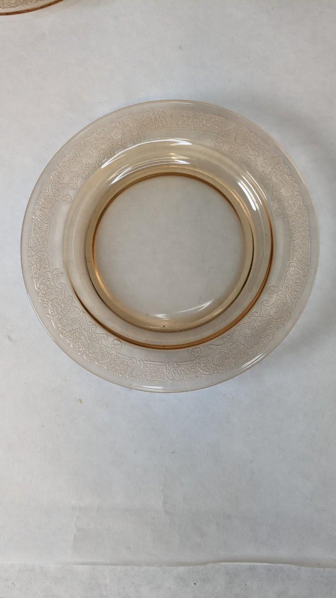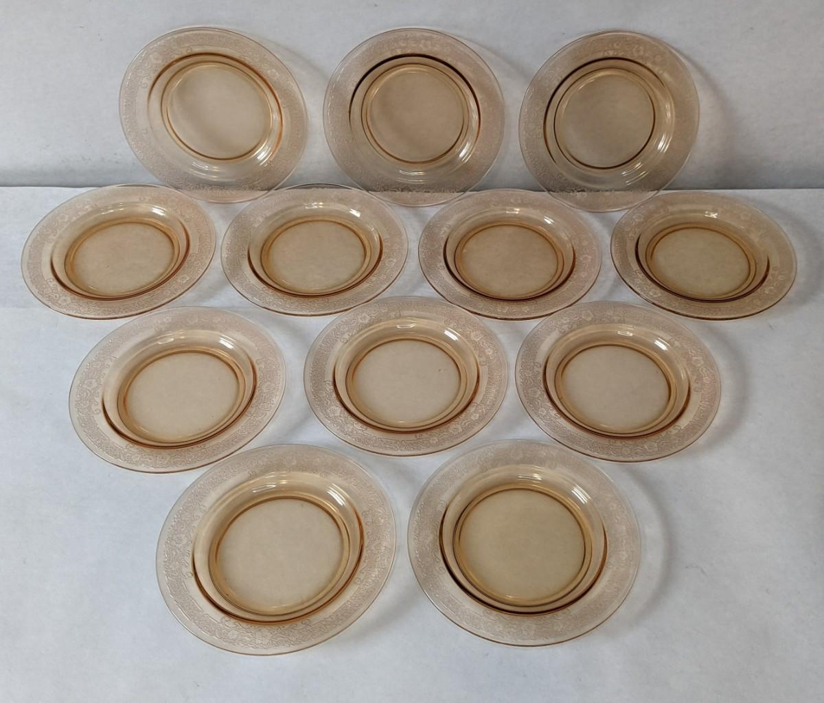 (12) Vesper Amber pattern bread plates by Fostoria. These beautiful late 1920's-early 30's dinner plates feature timeless depression around rim with elegant cherry blossoms intentionally placed. Each piece is in wonderful condition for age with no chips or cracks present and exceptionally little wear.
