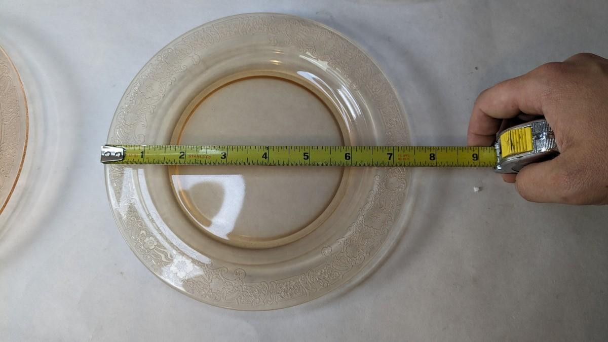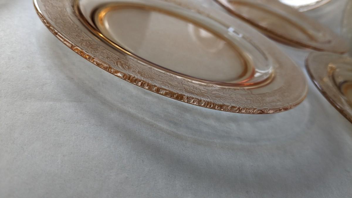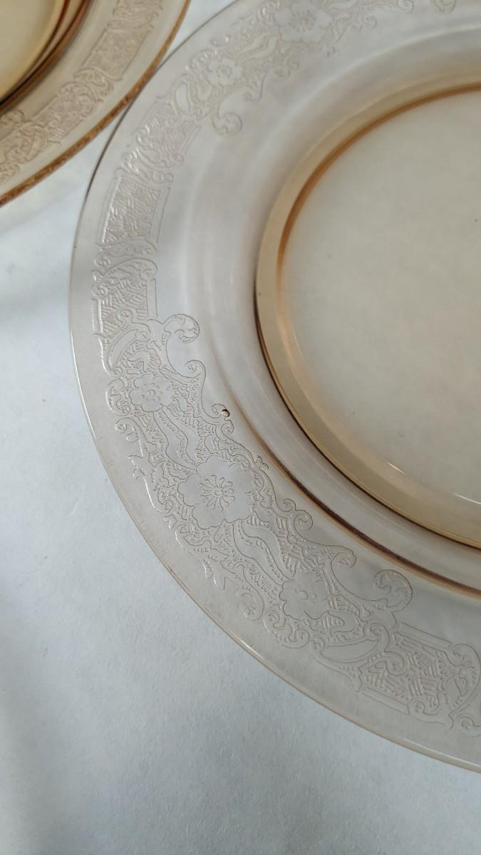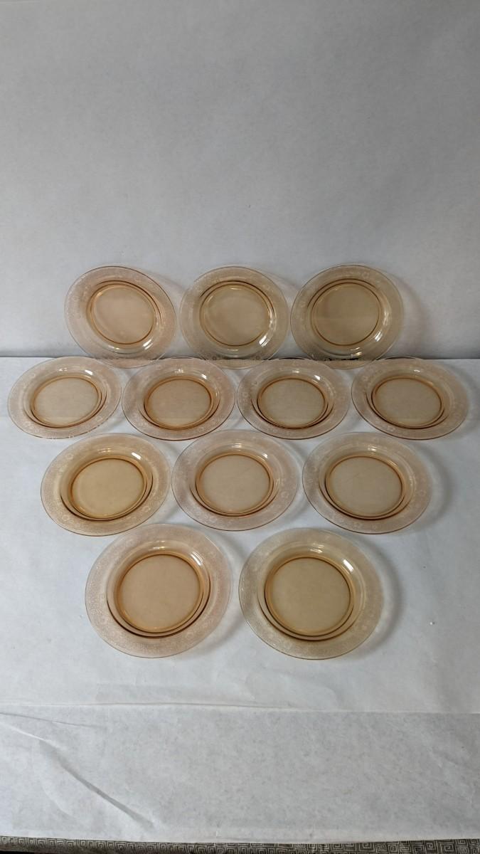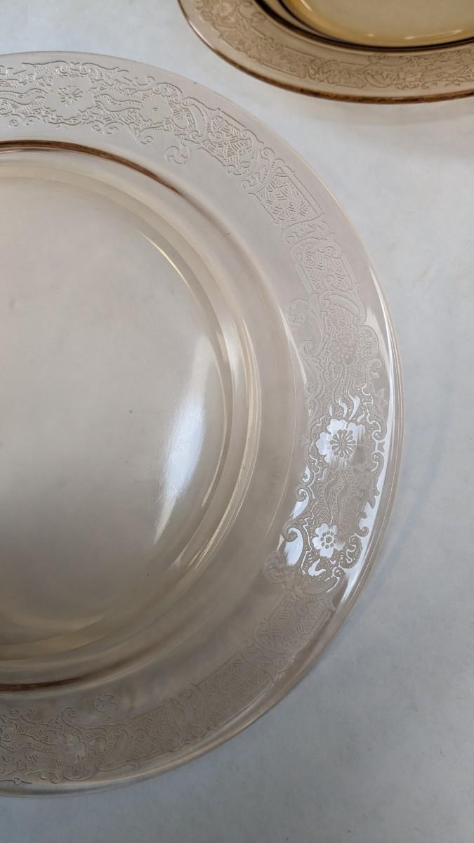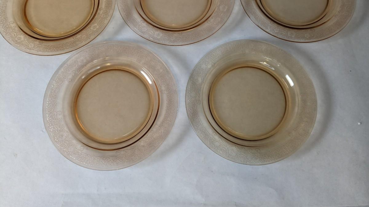 (12) Vesper Amber pattern salad plates by Fostoria. These beautiful late 1920's-early 30's dinner plates feature timeless depression around rim with elegant cherry blossoms intentionally placed. Each plate is in wonderful condition for age with no chips or cracks present and with exceptionally little wear. Extra plates can be found in lot 74