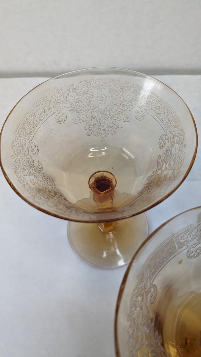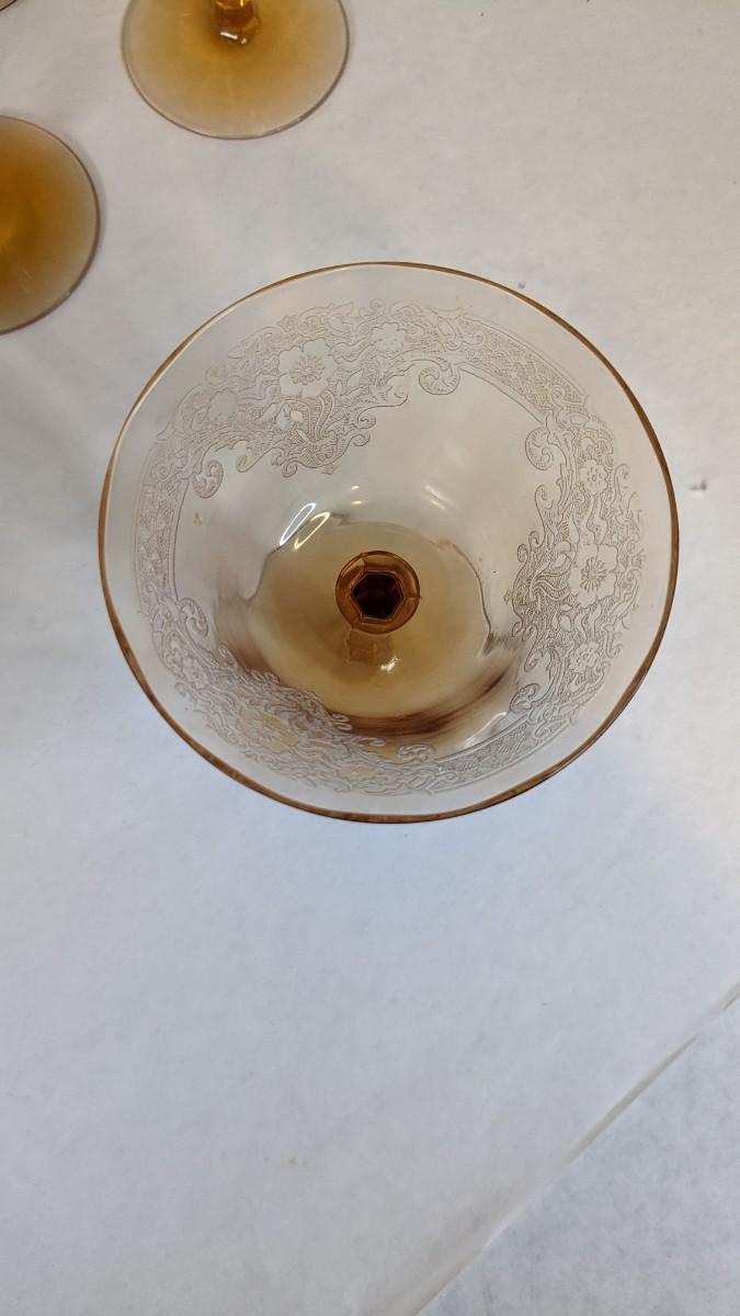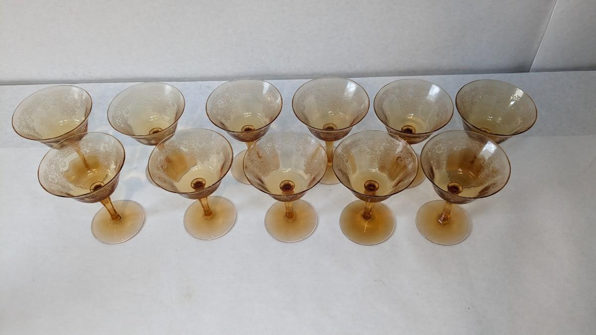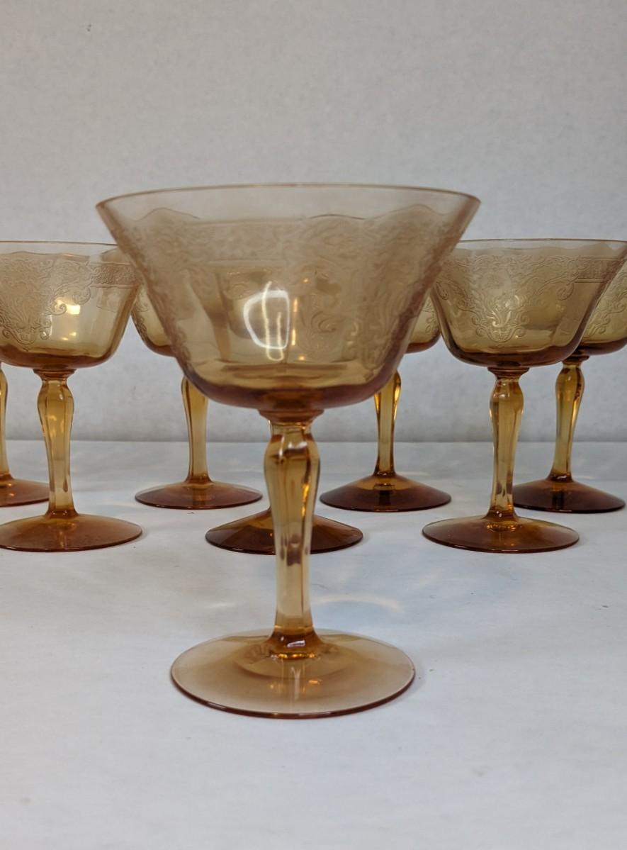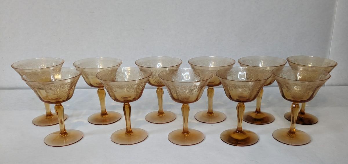 (11) Vesper Amber cocktail glasses by Fostoria. These beautiful late 1920's-early 30's glasses feature timeless depression around rim with elegant cherry blossoms intentionally placed. Each piece is in wonderful condition for age with no chips or cracks present and with exceptionally little wear. A fantastic set! Extra handling fees will apply.
