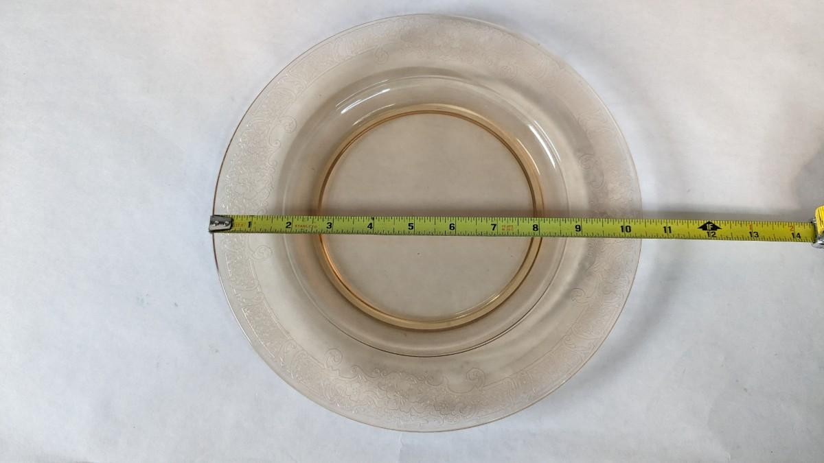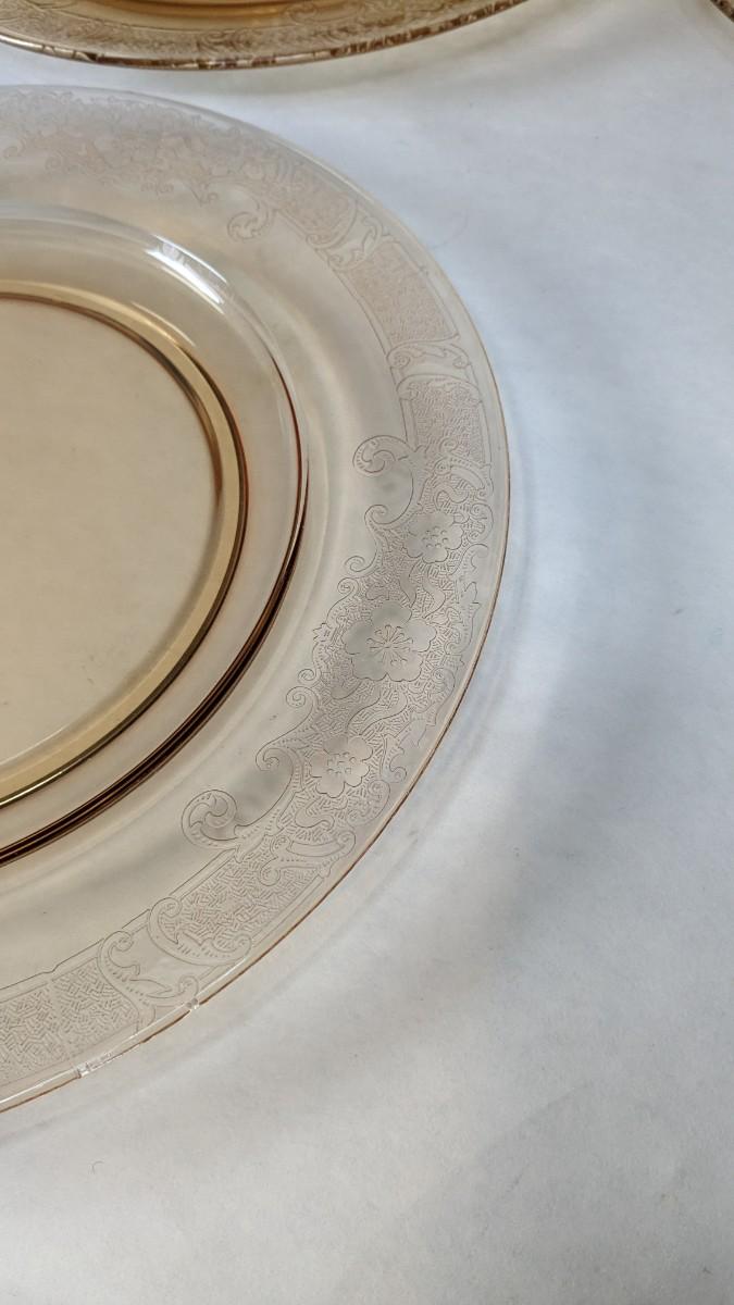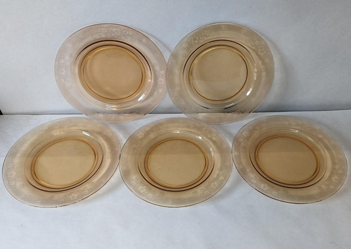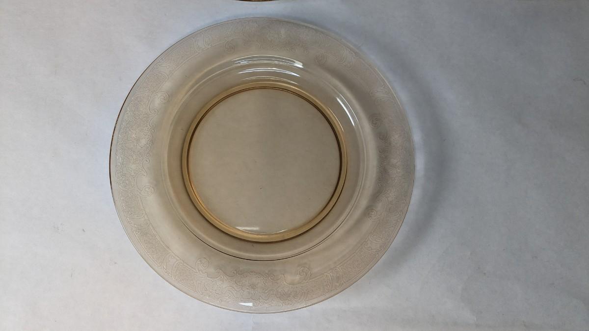 (5) Vesper Amber 10.5" dinner plates by Fostoria. These beautiful late 1920's-early 30's dinner plates feature timeless depression around rim with elegant cherry blossoms intentionally placed. Each plate is in wonderful condition for age with no chips or cracks present and with exceptionally little wear. A fantastic set with extras found in lot 26