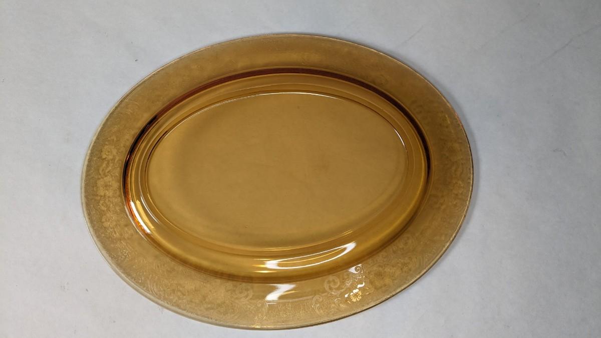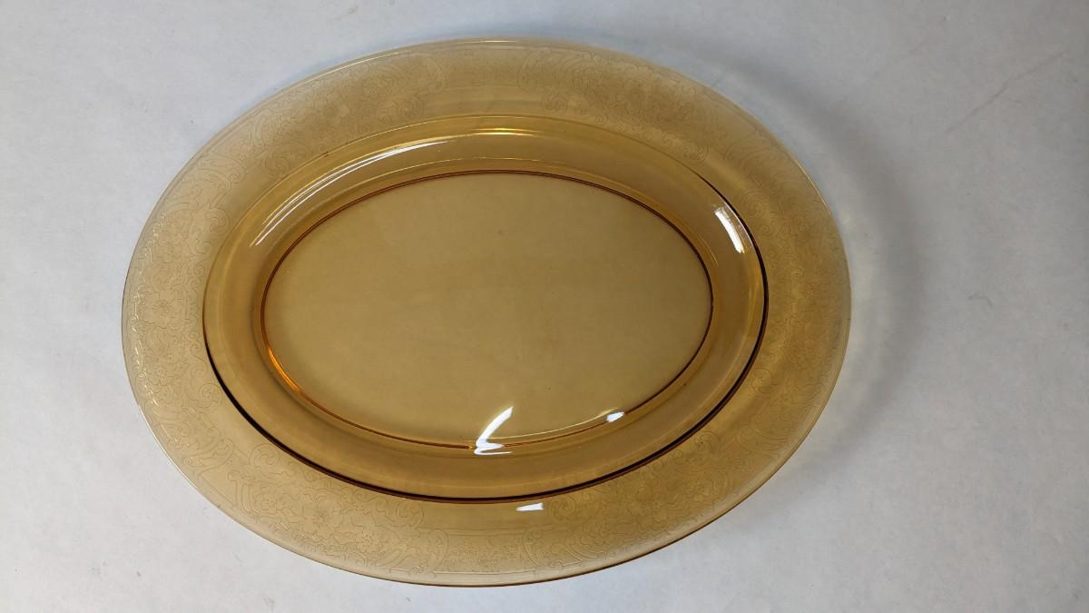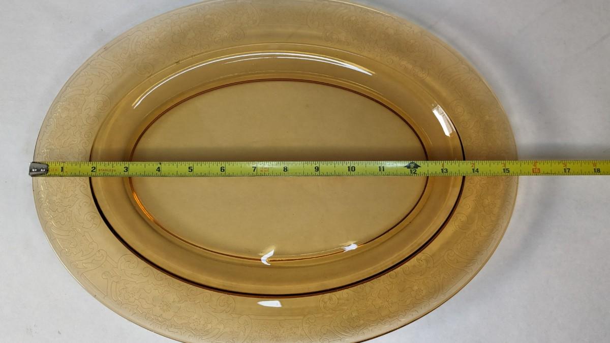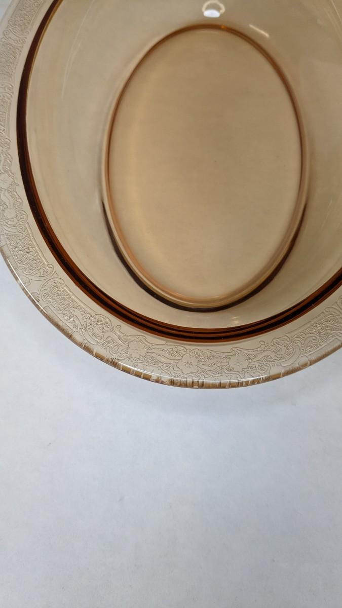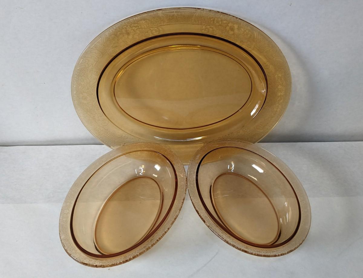 (2) Vesper Amber 10.25" oval serving bowls by Fostoria as well as 15.25" oval serving platter. These beautiful late 1920's-early 30's serving pieces feature timeless depression around rim with elegant cherry blossoms intentionally placed. Each piece is in wonderful condition for age with no chips or cracks present and with exceptionally little wear.