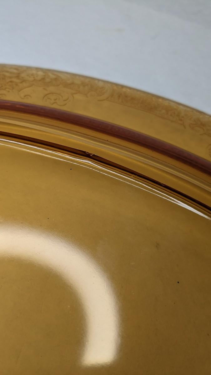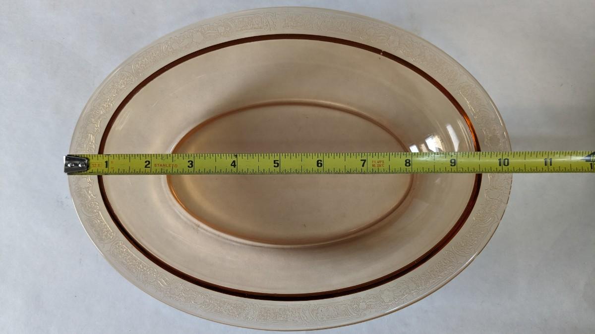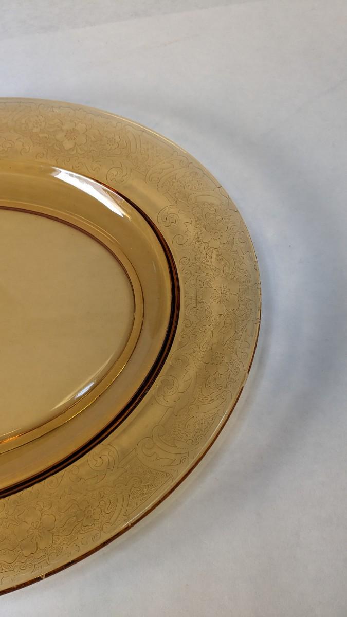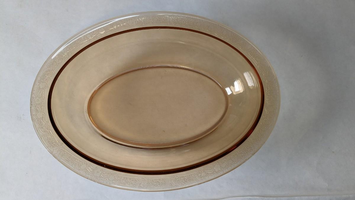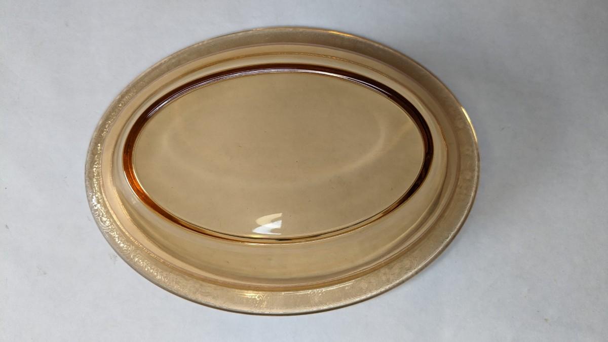 (2) Vesper Amber 10.25" oval serving bowls by Fostoria as well as 15.25" oval serving platter. These beautiful late 1920's-early 30's serving pieces feature timeless depression around rim with elegant cherry blossoms intentionally placed. Each piece is in wonderful condition for age with no chips or cracks present and with exceptionally little wear.