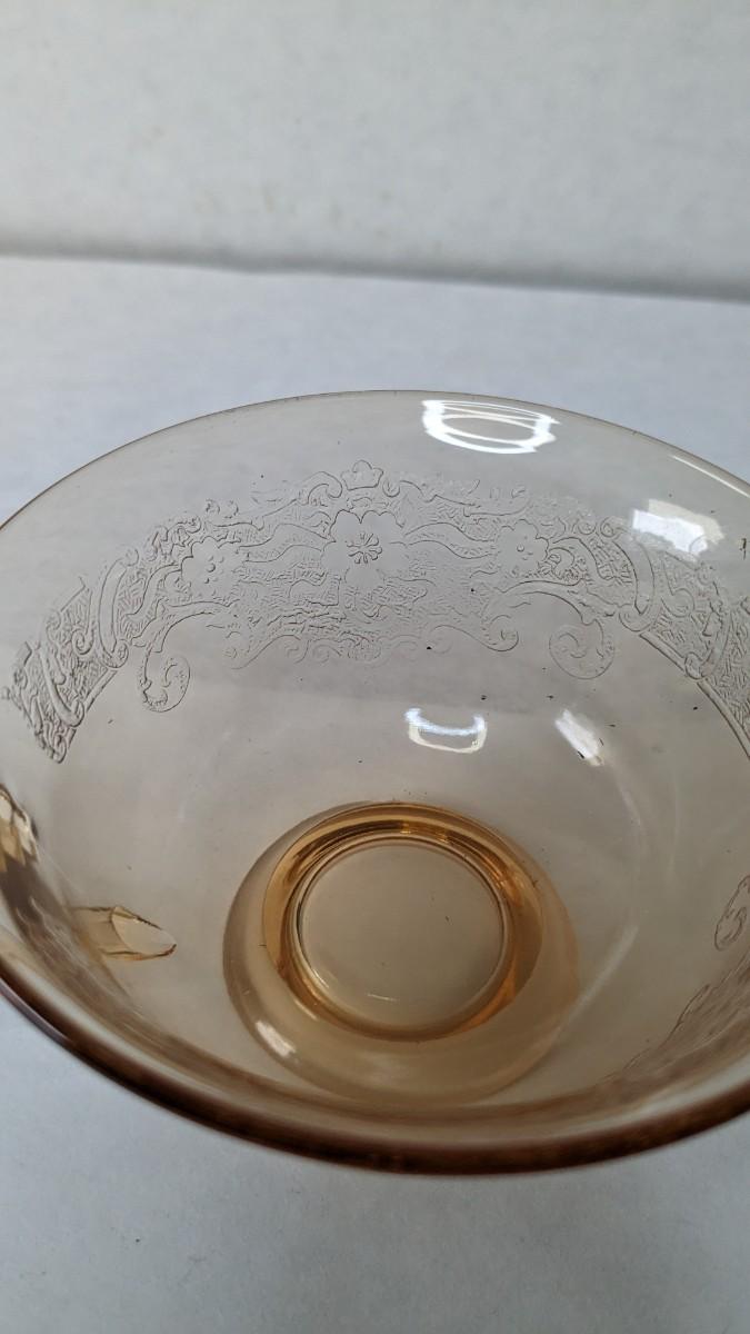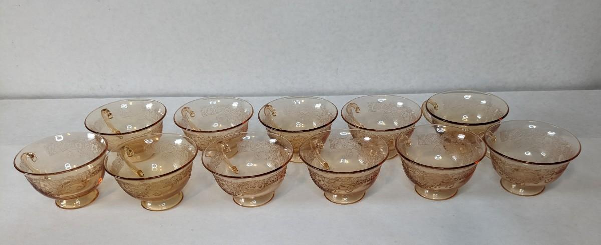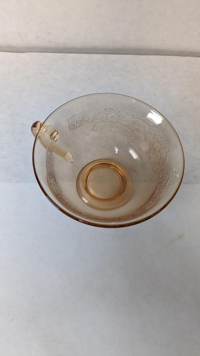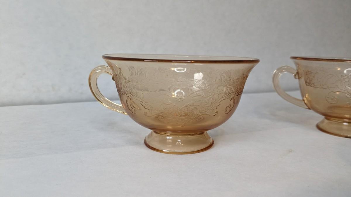 (11) Vesper Amber tea cups by Fostoria. These beautiful late 1920's-early 30's cups feature timeless depression around rim with elegant cherry blossoms intentionally placed. Each piece is in wonderful condition for age with no chips or cracks present and with exceptionally little wear. A fantastic set with saucers found in lots 69 and 78.