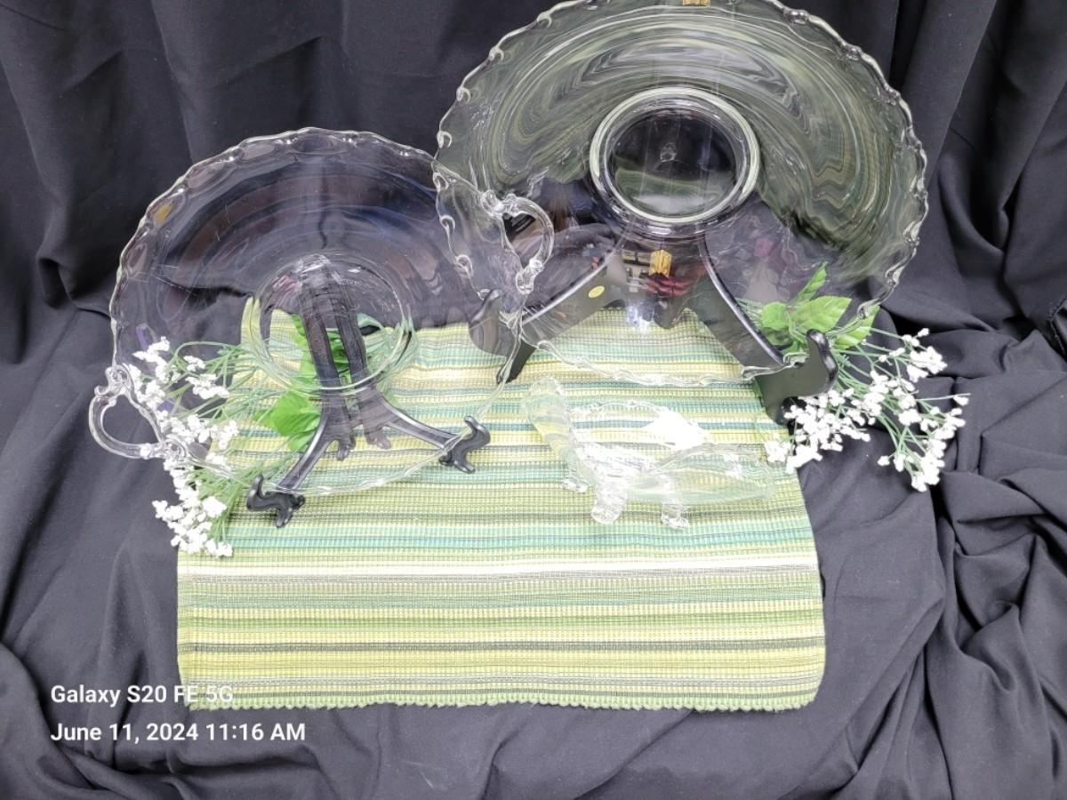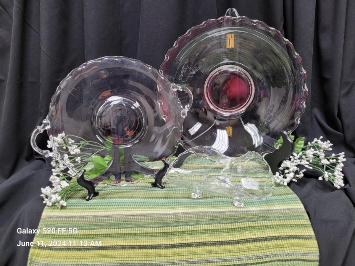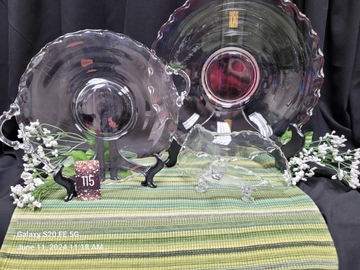Century Pattern. Flared round bowl 12 inch diameter, handled cake plate 12 inch diameter, 3 toed tricorn dish 7 inches, One photo shows the true clear glass, 2 of the photos show a reflection from the photographers shirt, a pink hue. The pieces are clear glass