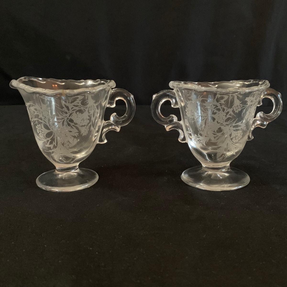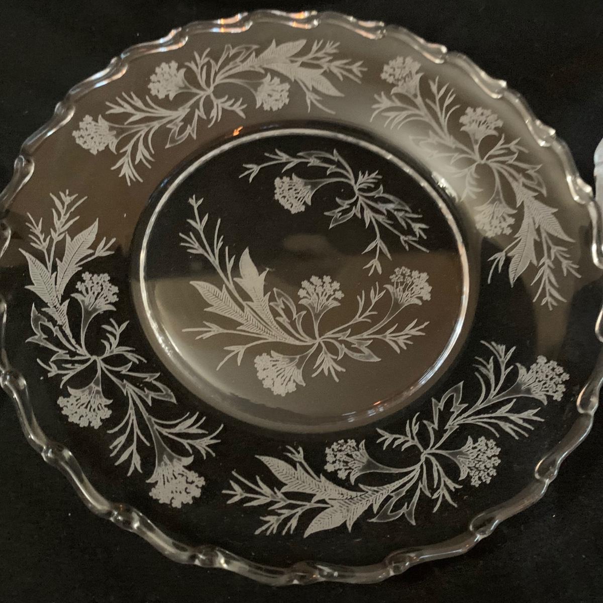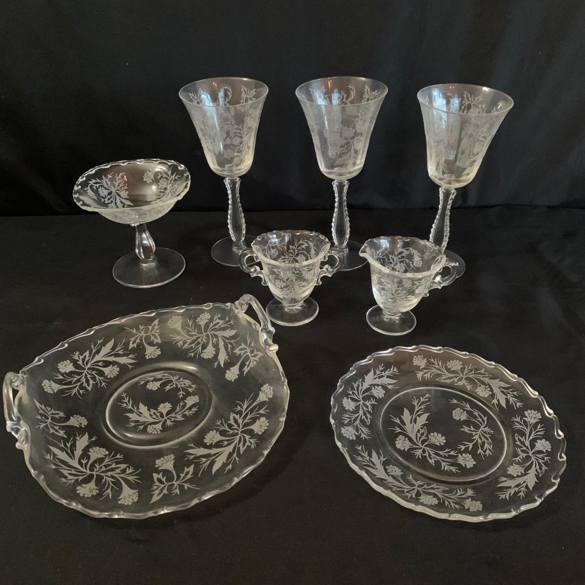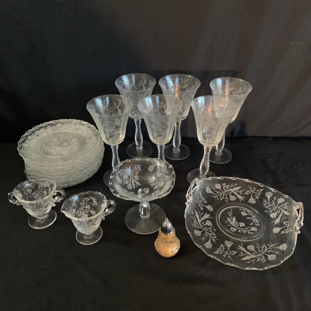 A gorgeous set of Fostoria glass dishes in their Heather Etch pattern. There are six goblets, twelve 7.5”D plates, a pedestal dish, a curved handled dish, a cream and sugar set, and a pepper shaker. Two of the goblets have small chips in the rims. The pepper shaker has pepper residue inside. Everything else appears to be pristine and just needs to be washed.