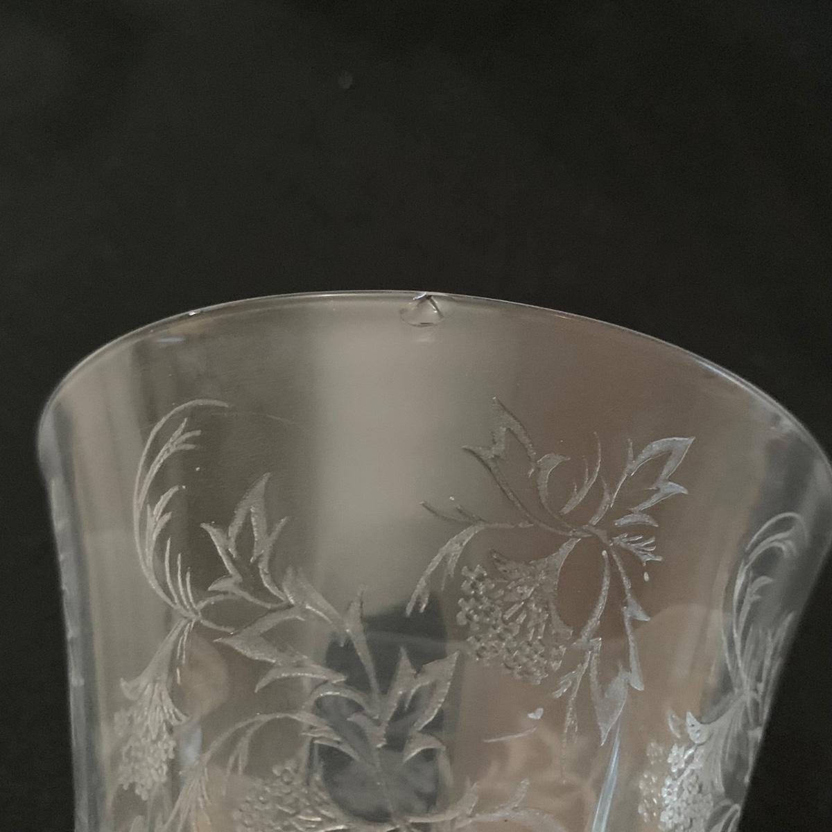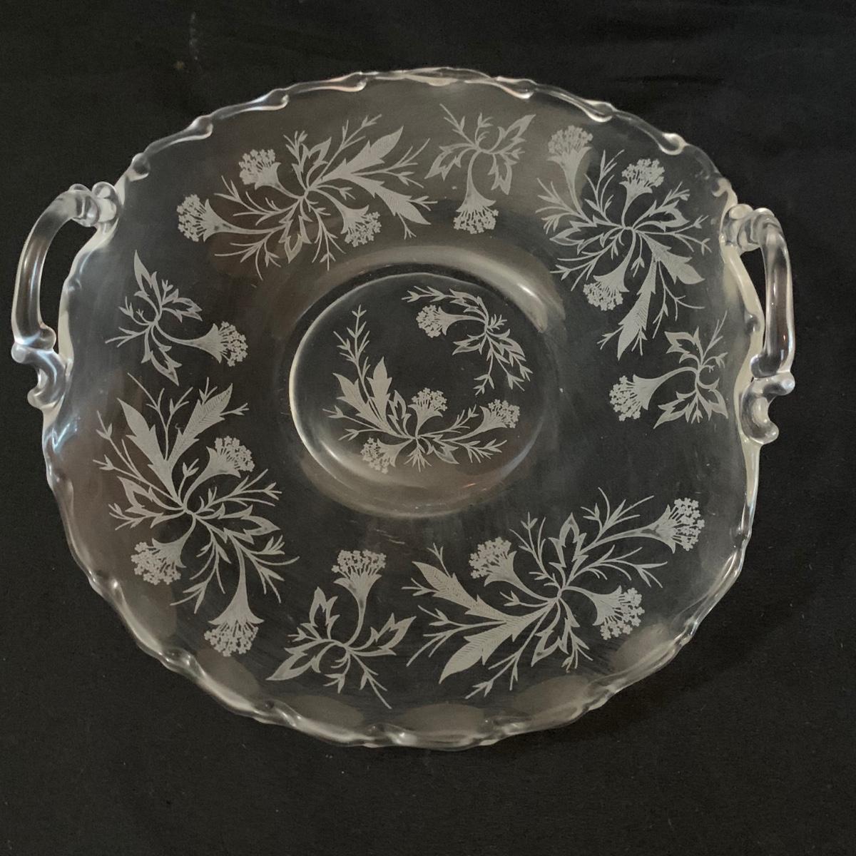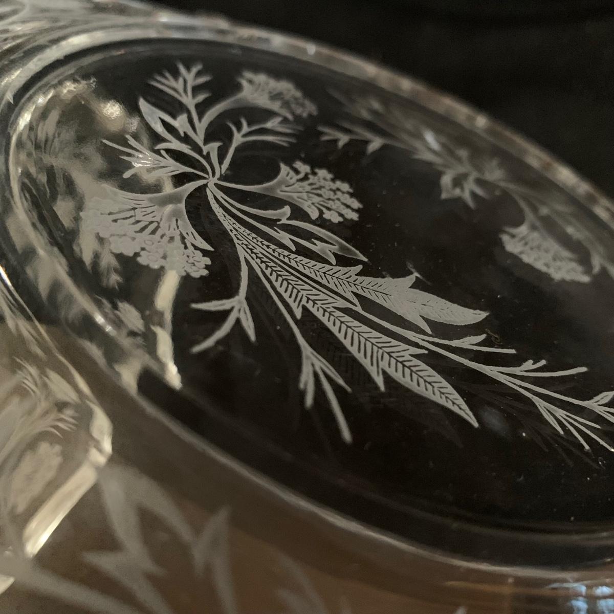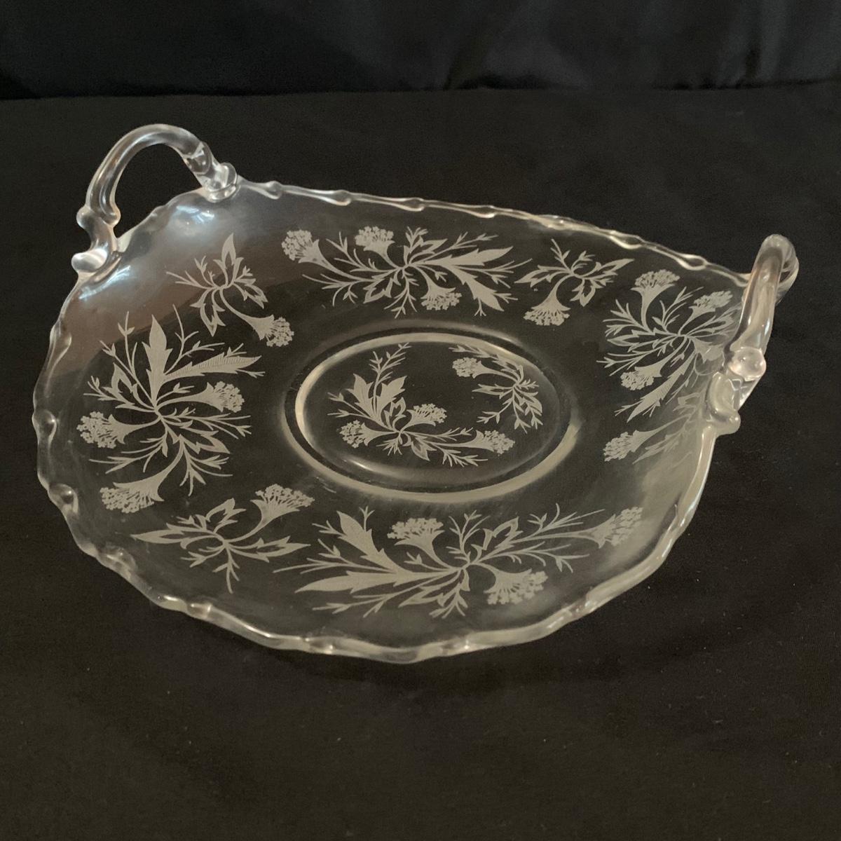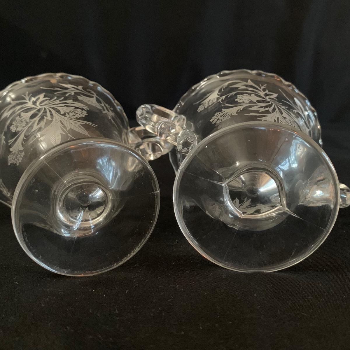 A gorgeous set of Fostoria glass dishes in their Heather Etch pattern. There are six goblets, twelve 7.5”D plates, a pedestal dish, a curved handled dish, a cream and sugar set, and a pepper shaker. Two of the goblets have small chips in the rims. The pepper shaker has pepper residue inside. Everything else appears to be pristine and just needs to be washed.