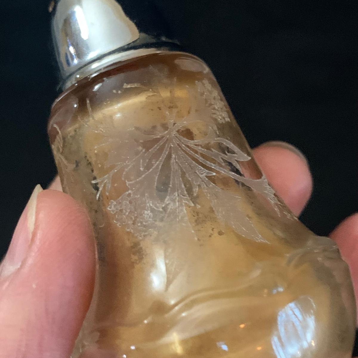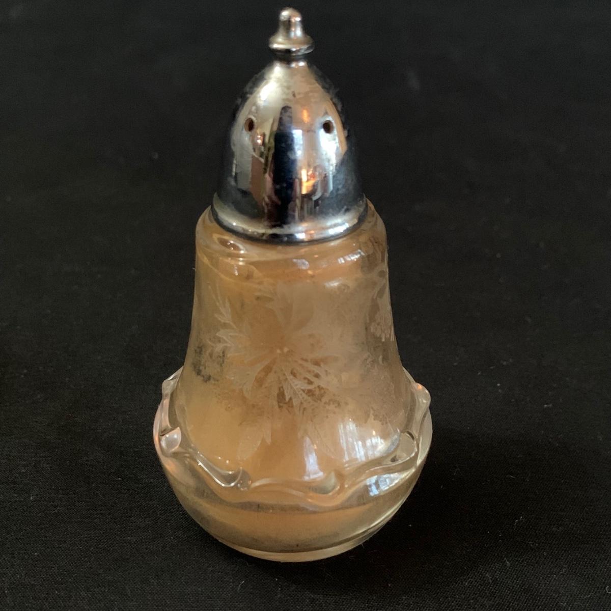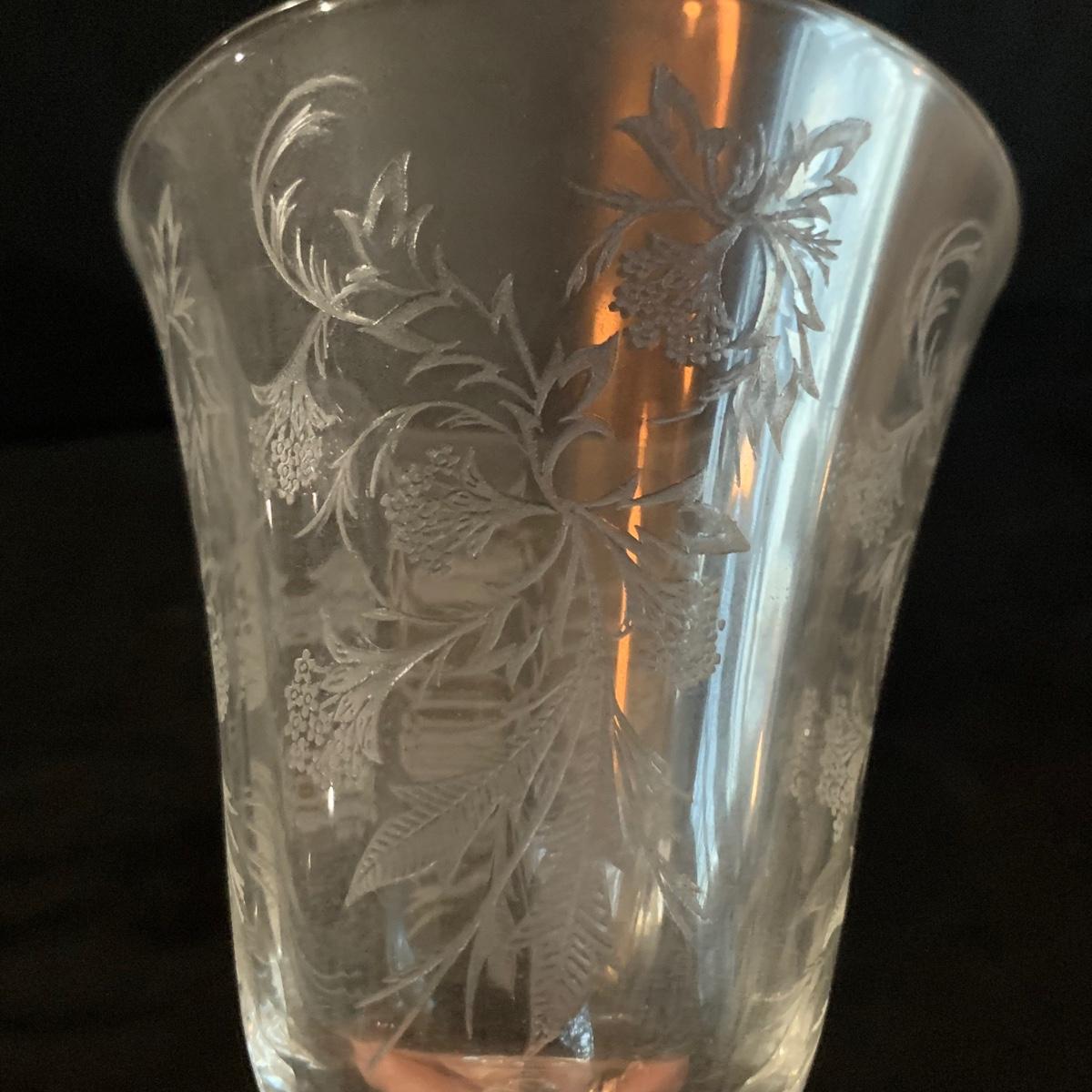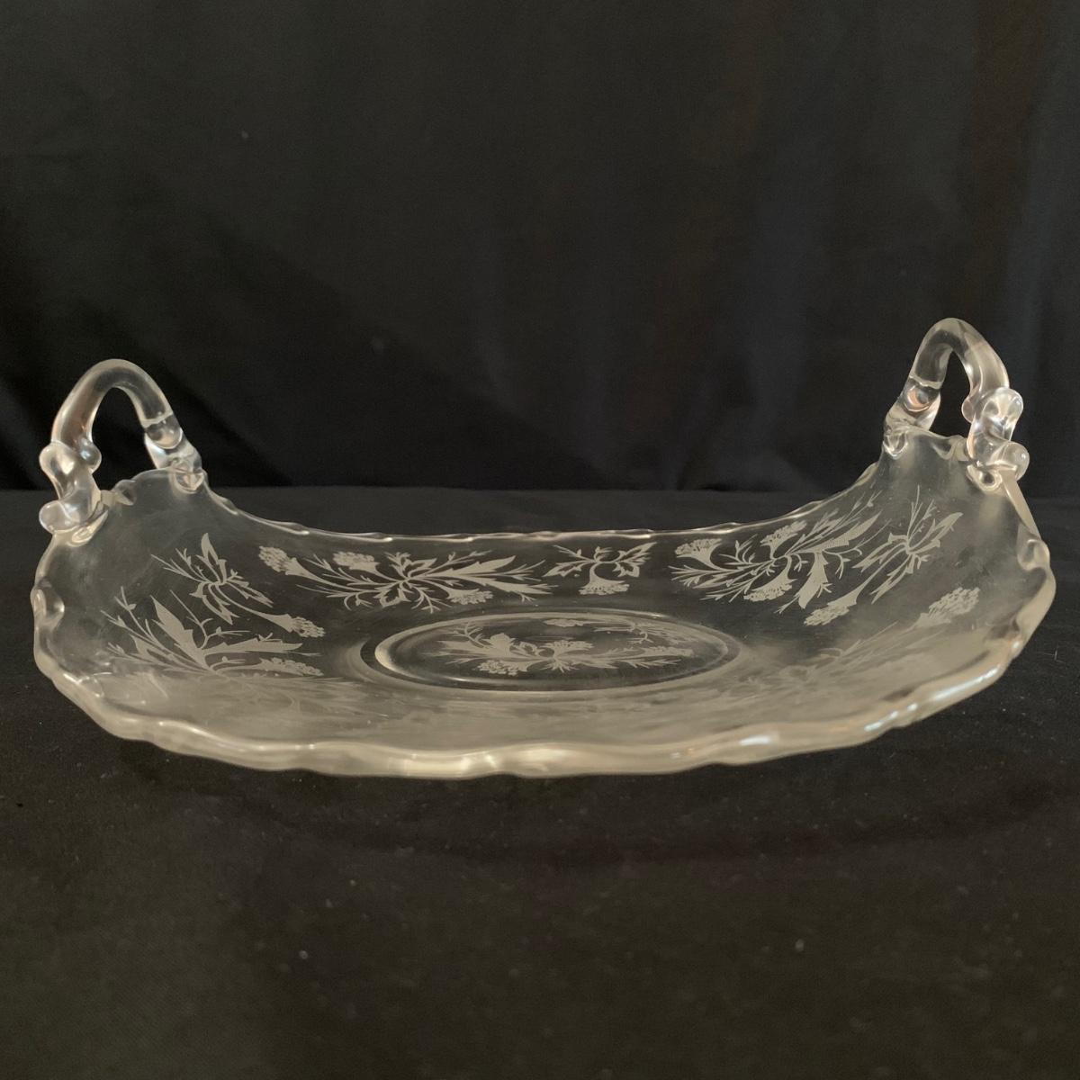 A gorgeous set of Fostoria glass dishes in their Heather Etch pattern. There are six goblets, twelve 7.5”D plates, a pedestal dish, a curved handled dish, a cream and sugar set, and a pepper shaker. Two of the goblets have small chips in the rims. The pepper shaker has pepper residue inside. Everything else appears to be pristine and just needs to be washed.