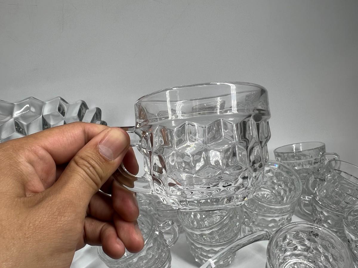 There is some light chipping on the punch bowl, but there is no other significant damage to the cups or ladle and is in overall good useable or collectible condition. Comes with 22 cups and serving ladle, check pictures for more details and for sizing.