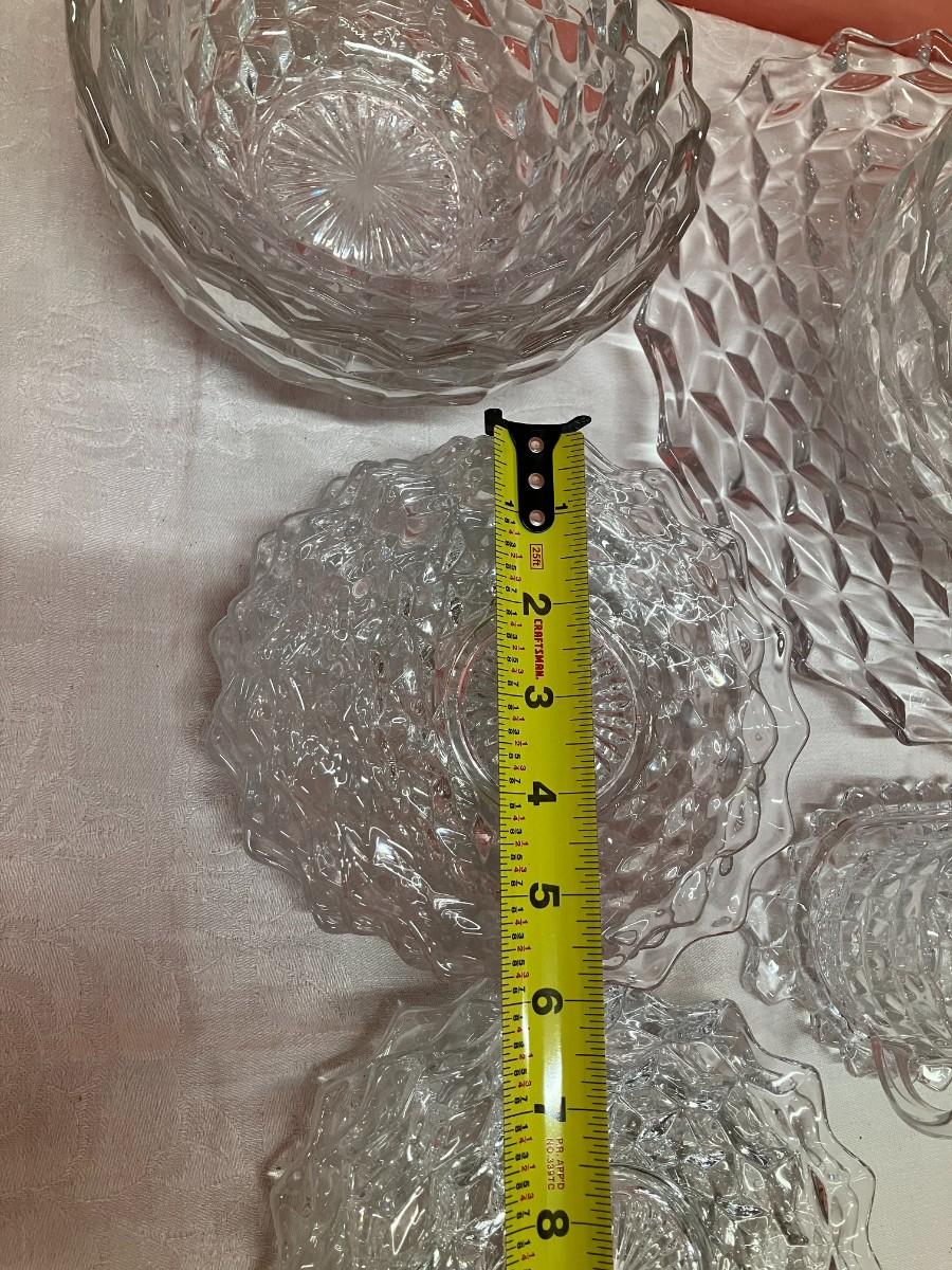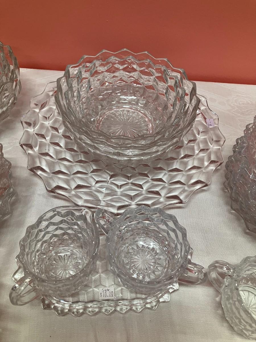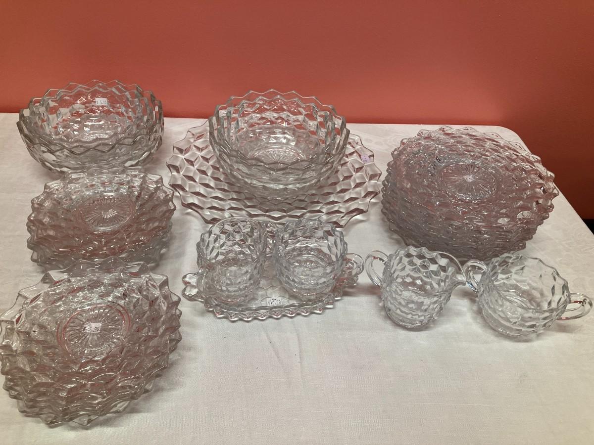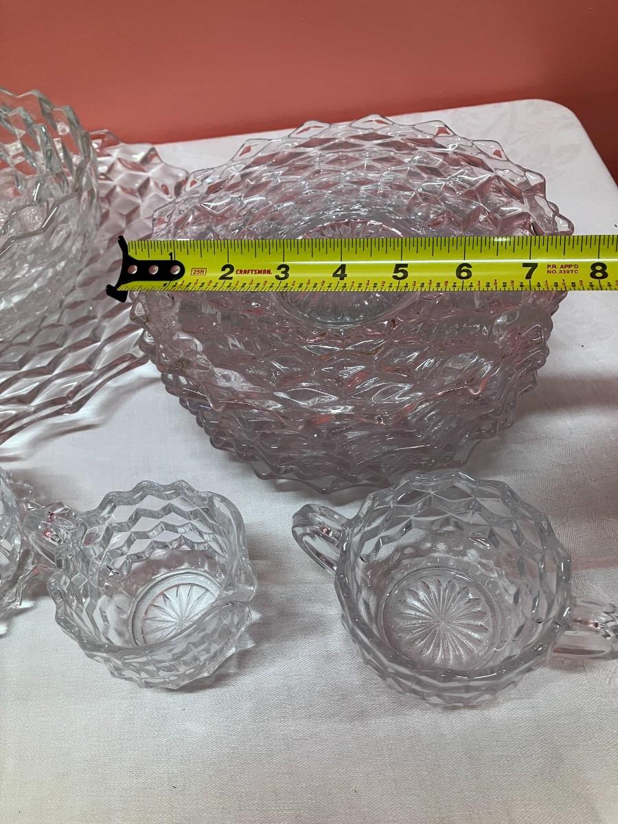 Lot of Fostoria dishes including: 2 creamer/sugar sets, 1 platter, 5 serving bowls, 9 - 8" plates and 11 - 6" plates. All in great condition!