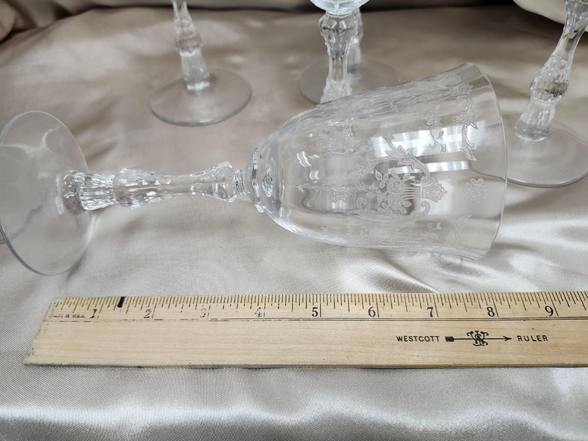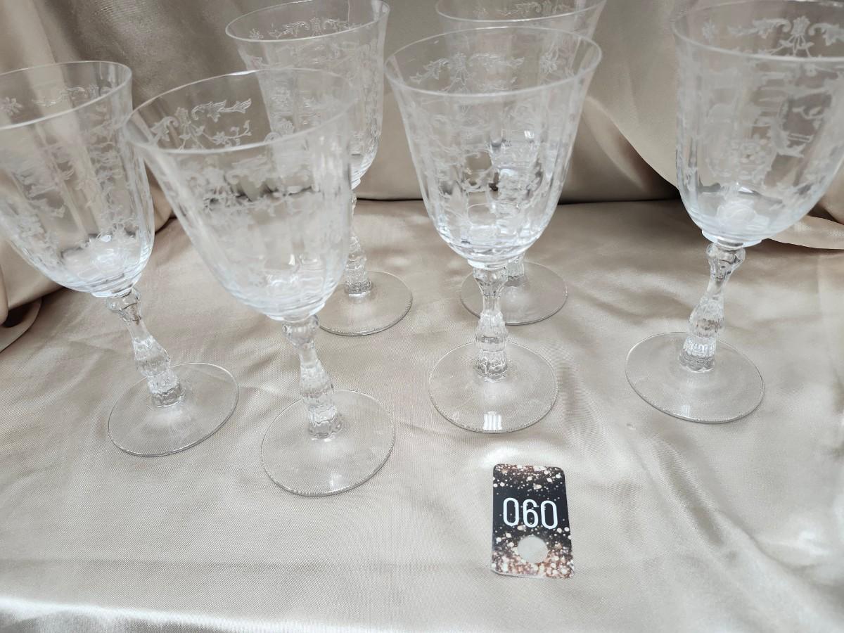 6 wine glasses, 8 inches tall. One stem has the tiniest flea bite chip on the rim. It could be smoothed out.