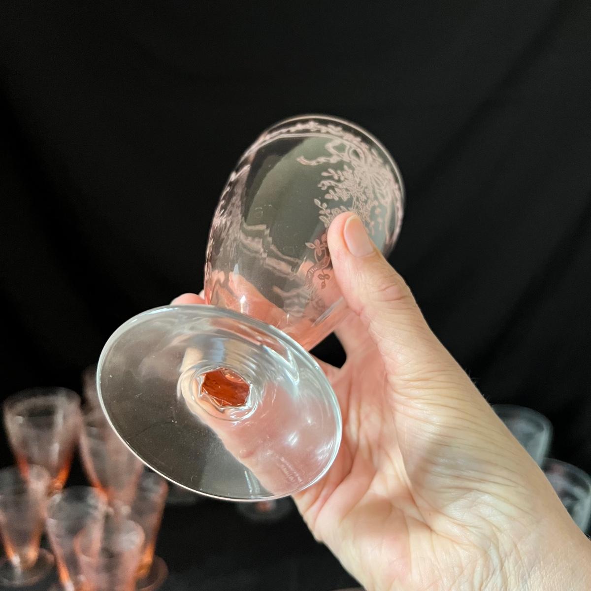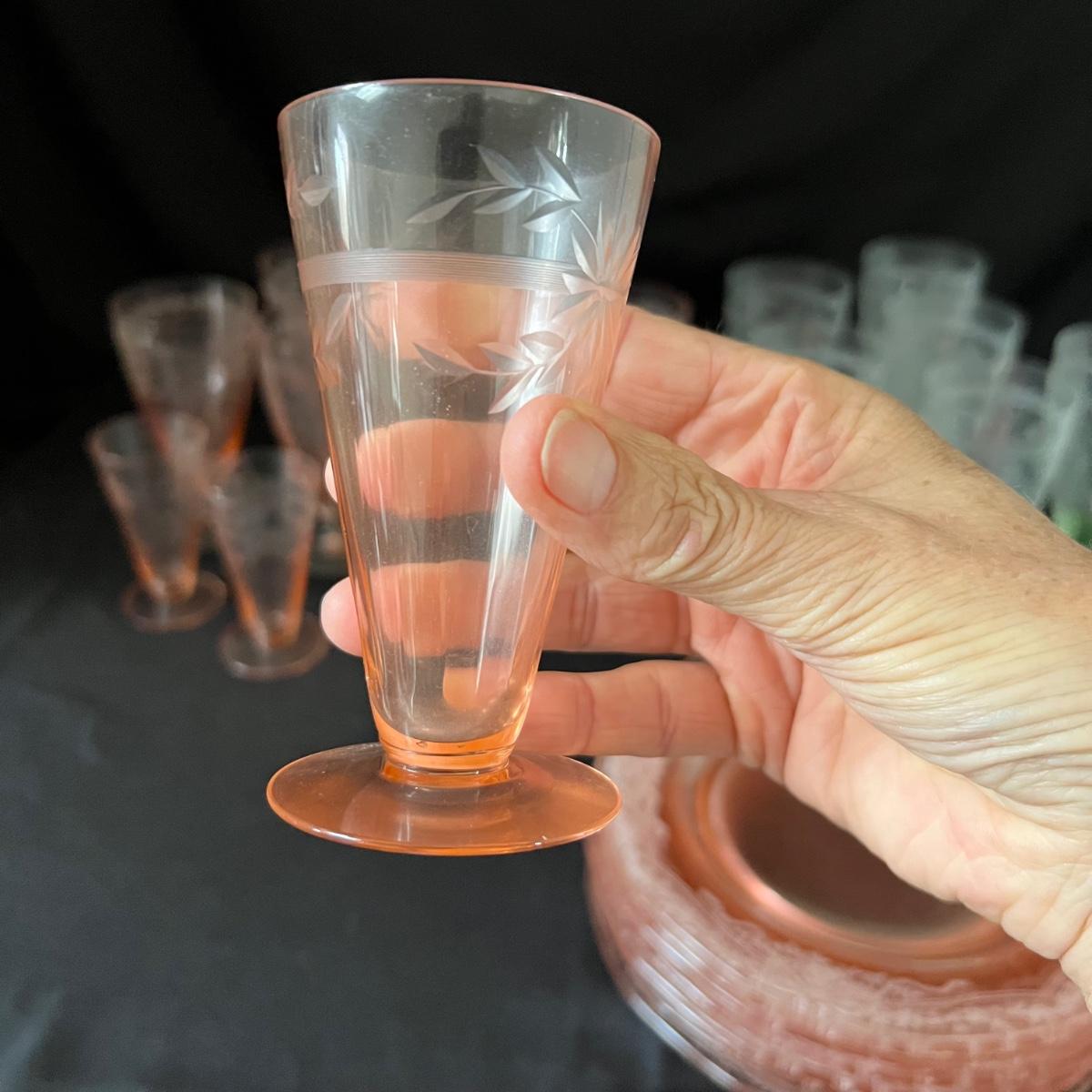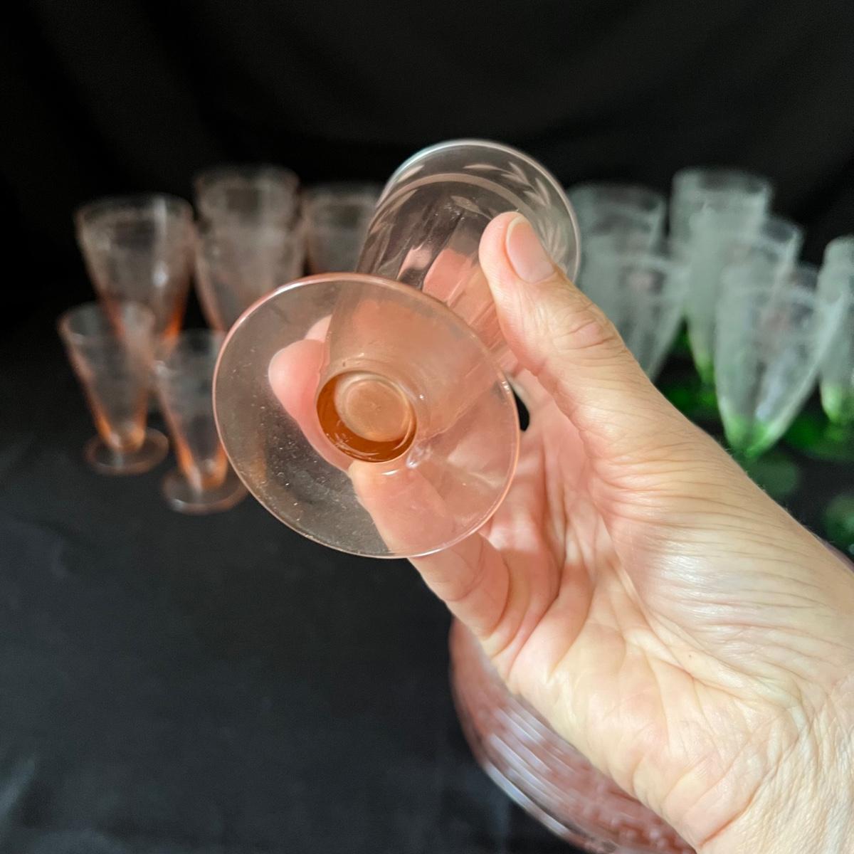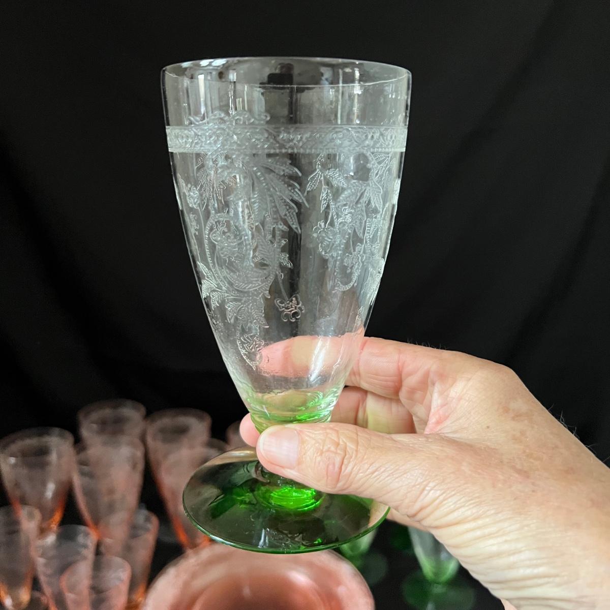 A beautiful assortment of etched colored glass that appear to be Fostoria but we cannot make any guarantees. There are eight 9”D light pink dessert plates. For the pink stemware there are six tall and four smaller glasses and seven green/clear glasses. See photos for measurements.