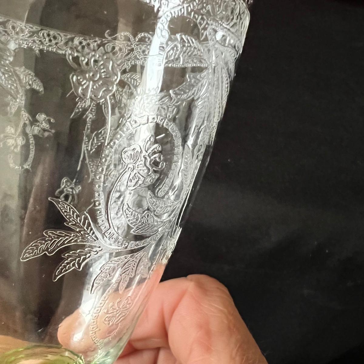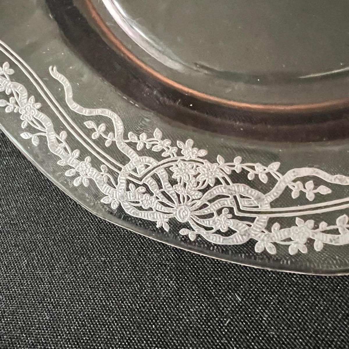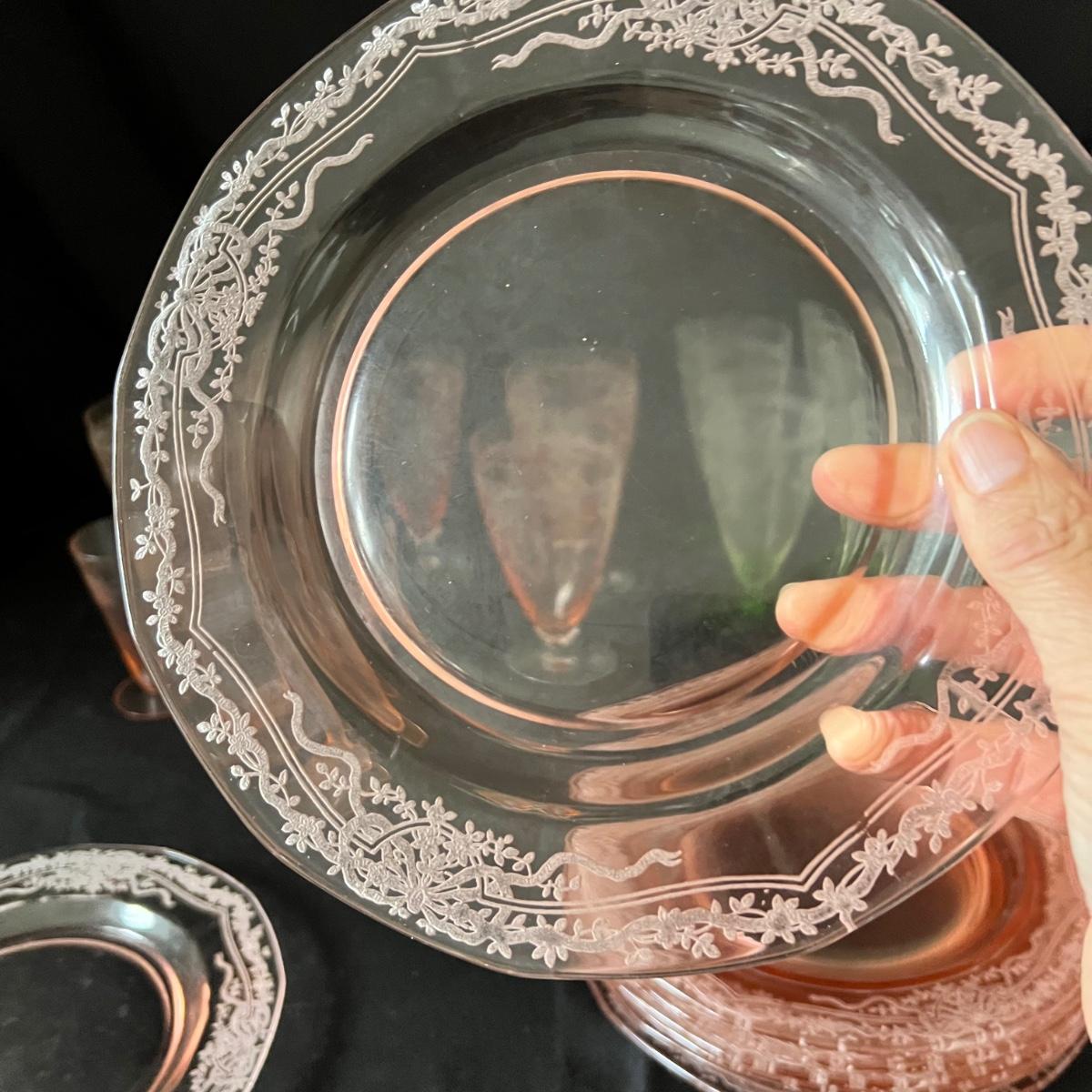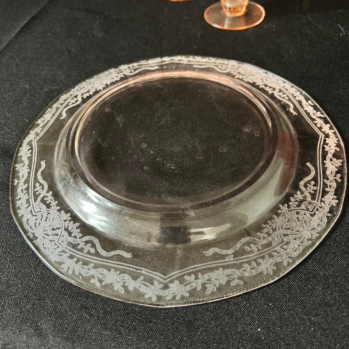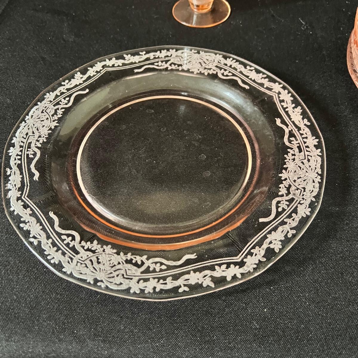 A beautiful assortment of etched colored glass that appear to be Fostoria but we cannot make any guarantees. There are eight 9”D light pink dessert plates. For the pink stemware there are six tall and four smaller glasses and seven green/clear glasses. See photos for measurements.