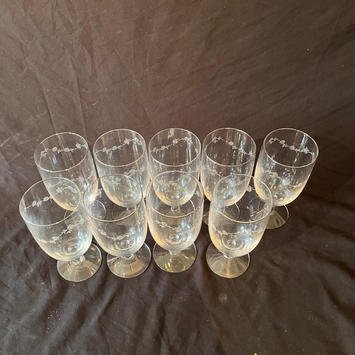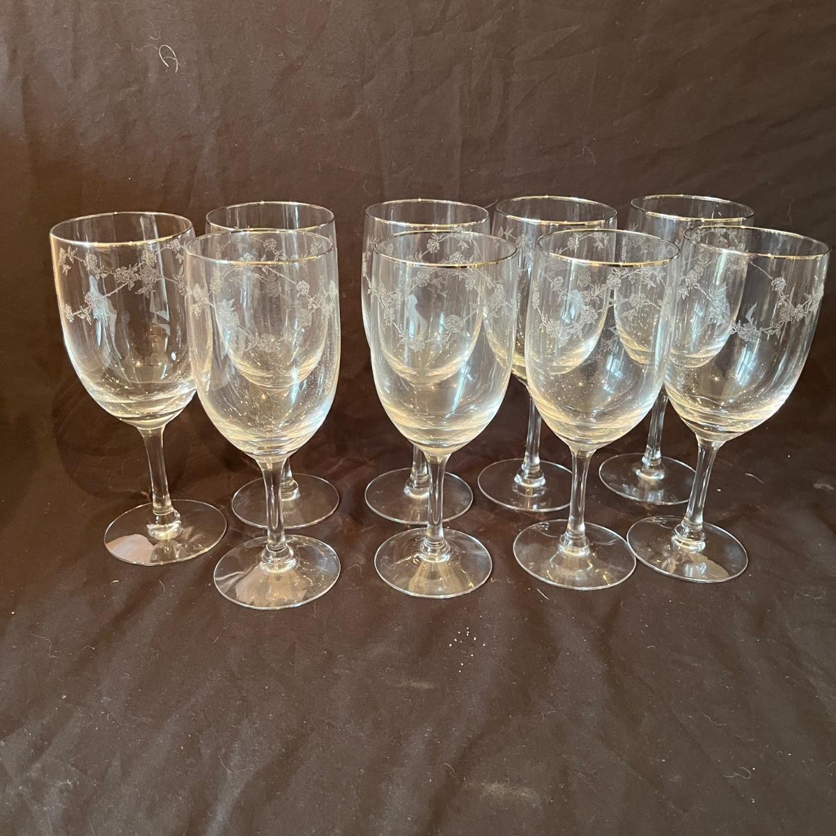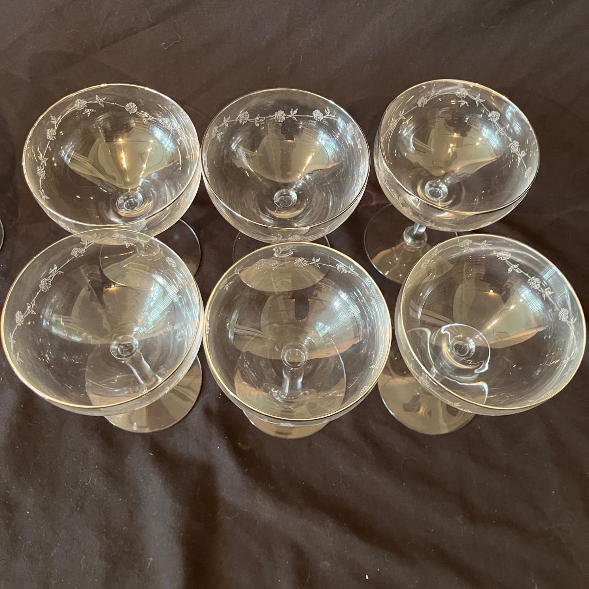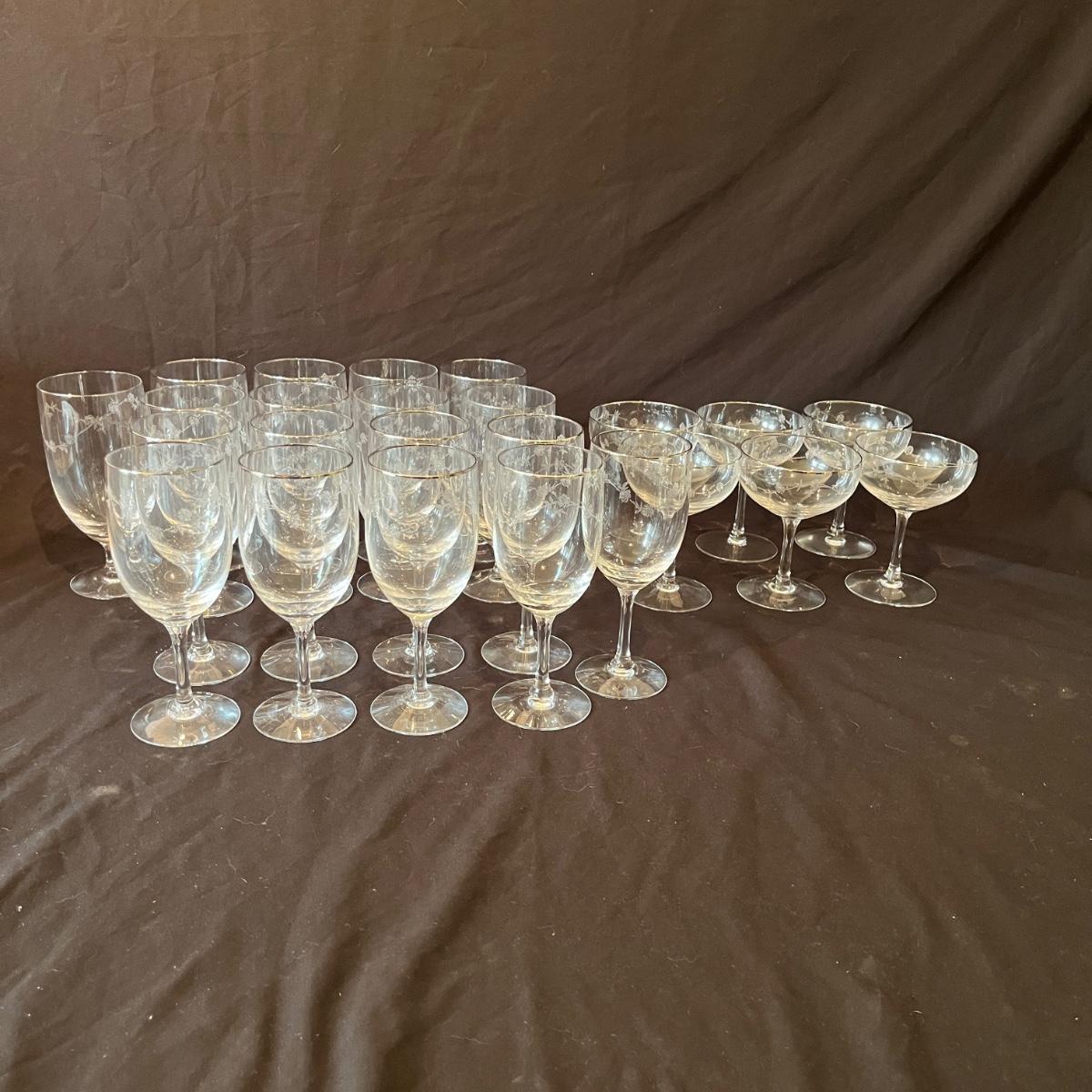 Lot contains three sets of etched Fostoria stemware that includes six champagne glasses and two different styles of wine glasses that have nine in each. Tallest glass measures 2.75”D x 7.75”H.
