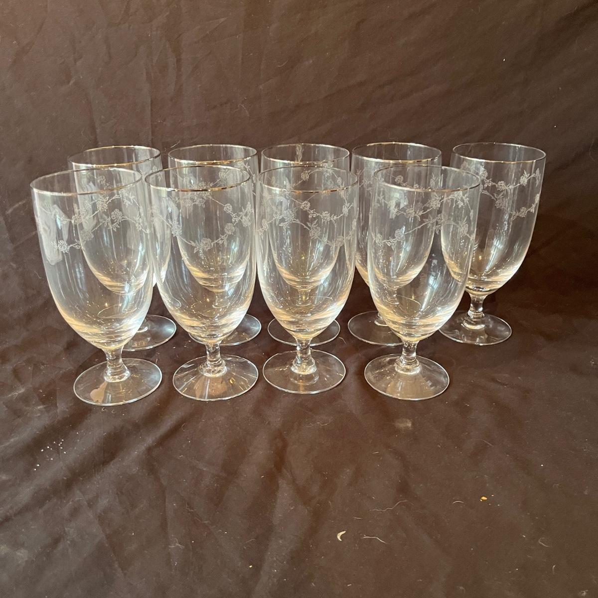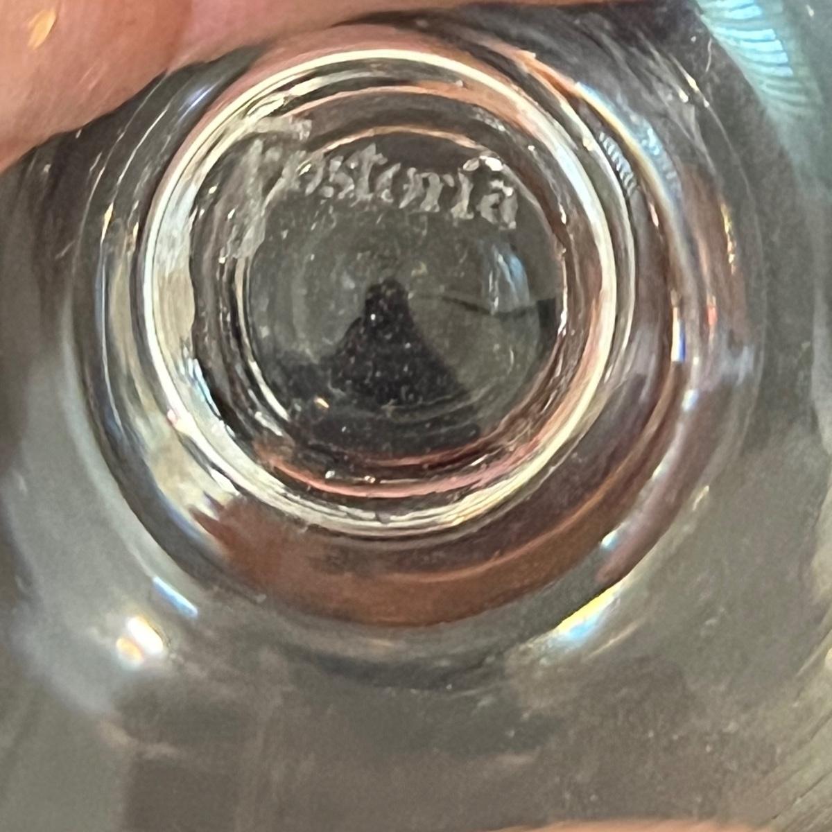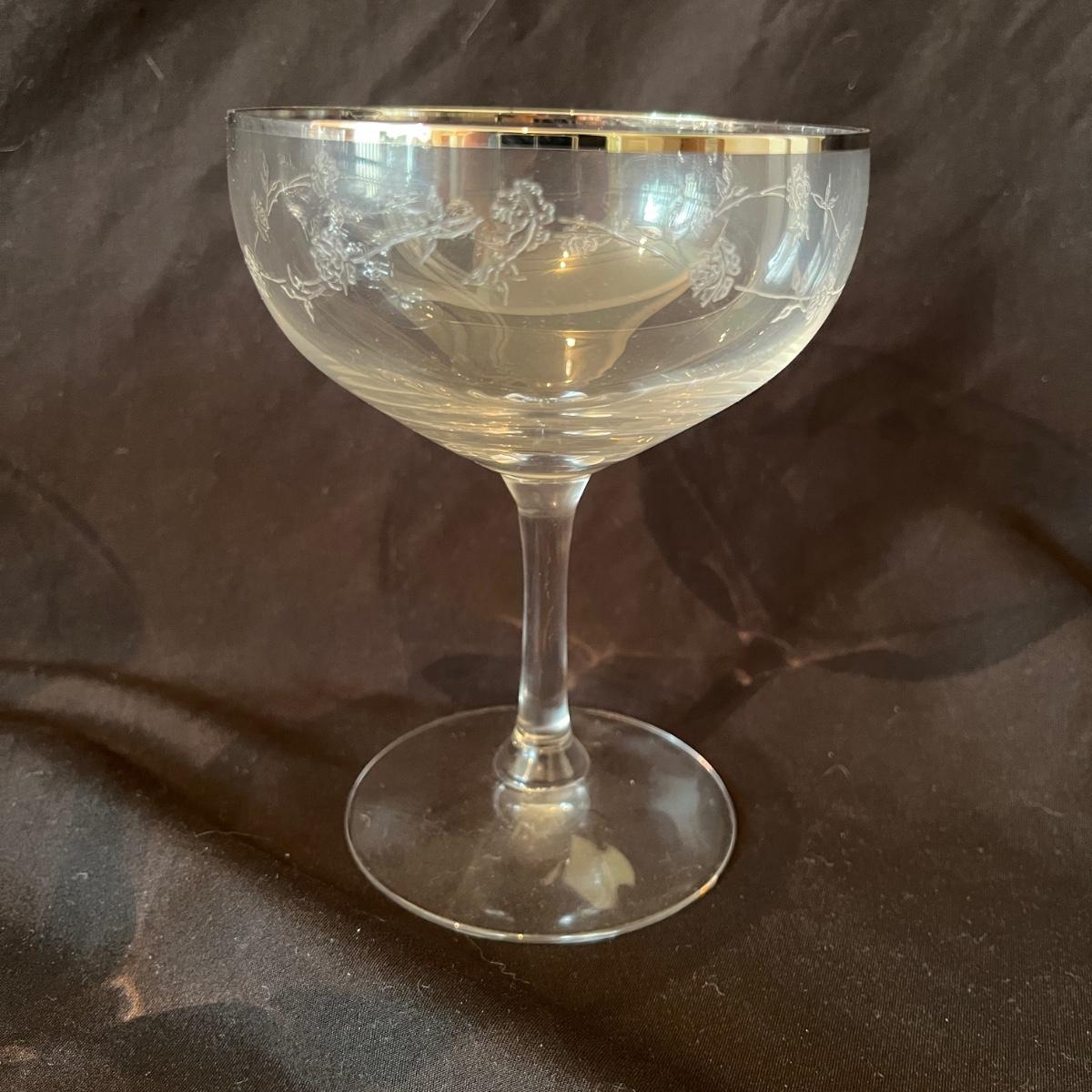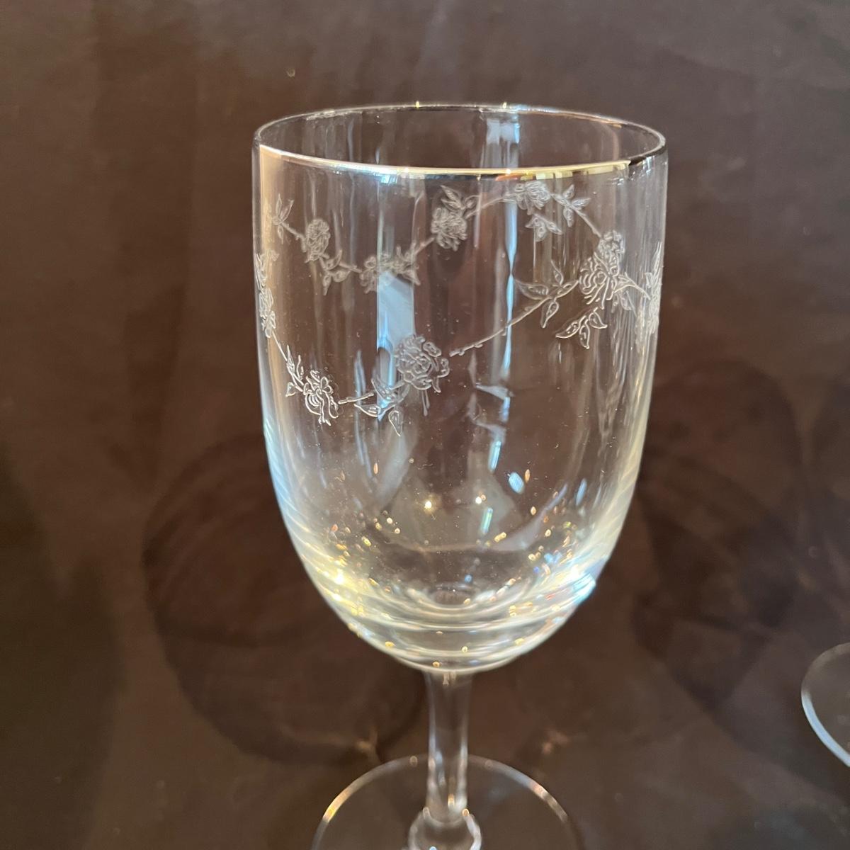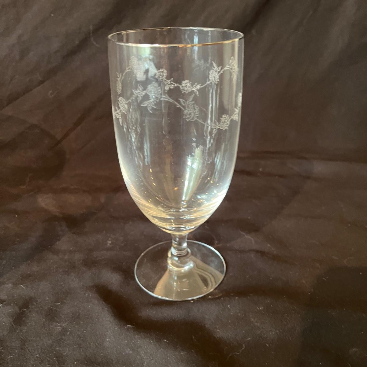 Lot contains three sets of etched Fostoria stemware that includes six champagne glasses and two different styles of wine glasses that have nine in each. Tallest glass measures 2.75”D x 7.75”H.
