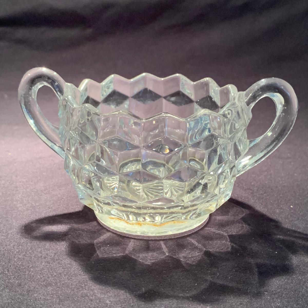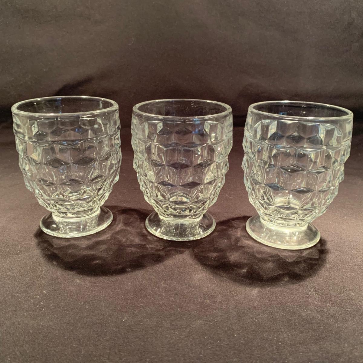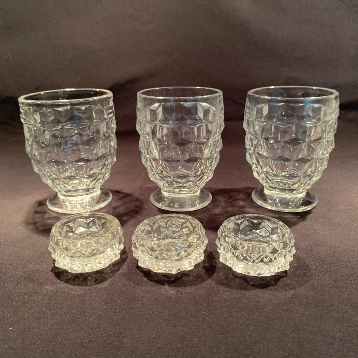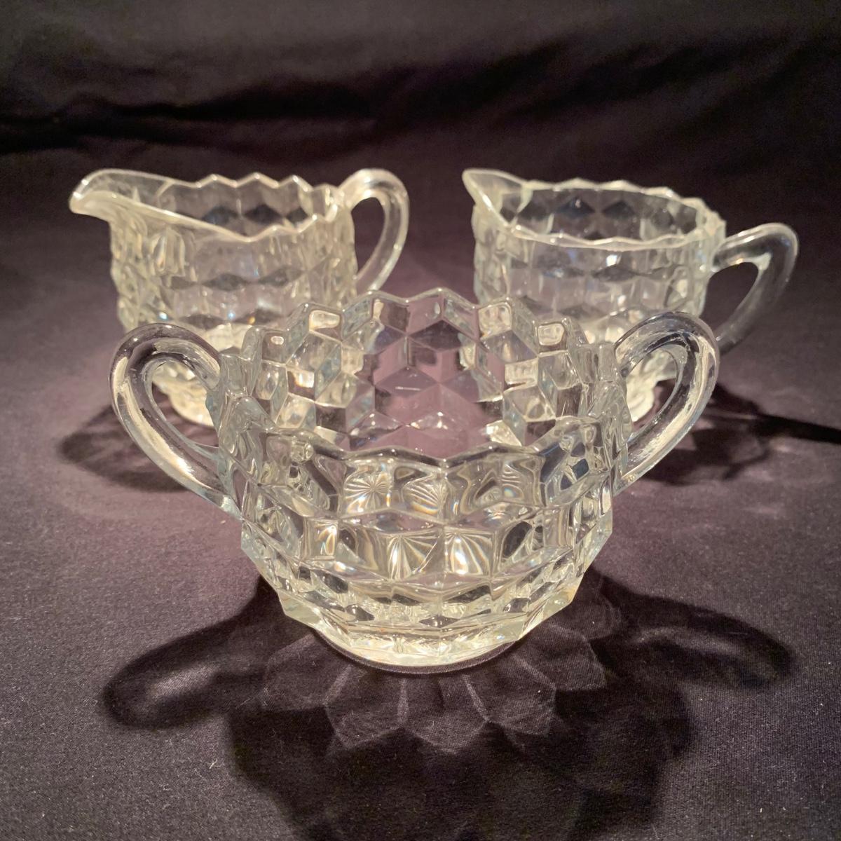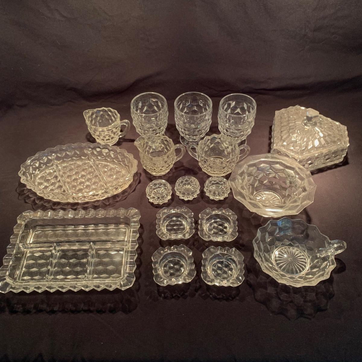 18 Fostoria style glass items. Set includes some glasses, votive candle holders, candy and nut dishes, small pitchers, a bowl, and a triangular lidded dish. Most items are in good condition. One of the square shaped votive holders has a crack. All items are a bit dusty and could use a good cleaning. The rectangular dish measures 9.25” x 6.5” x 1.75”. The three glasses are 4.25” tall. Shipping available.