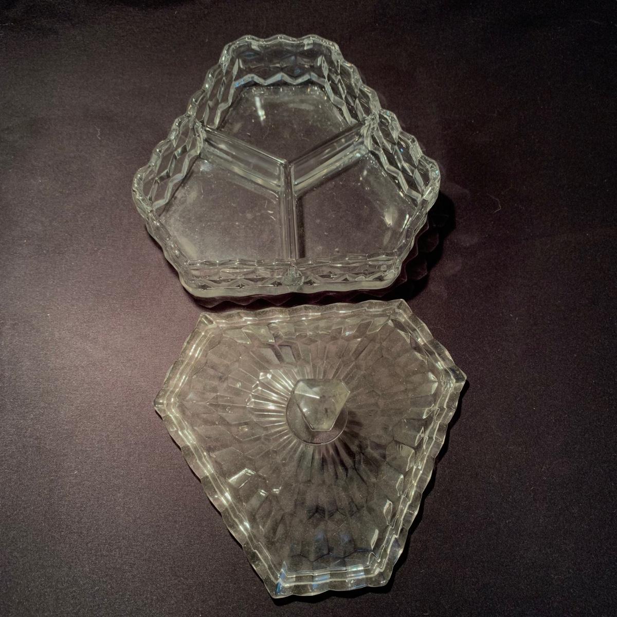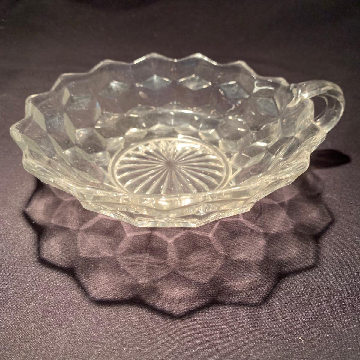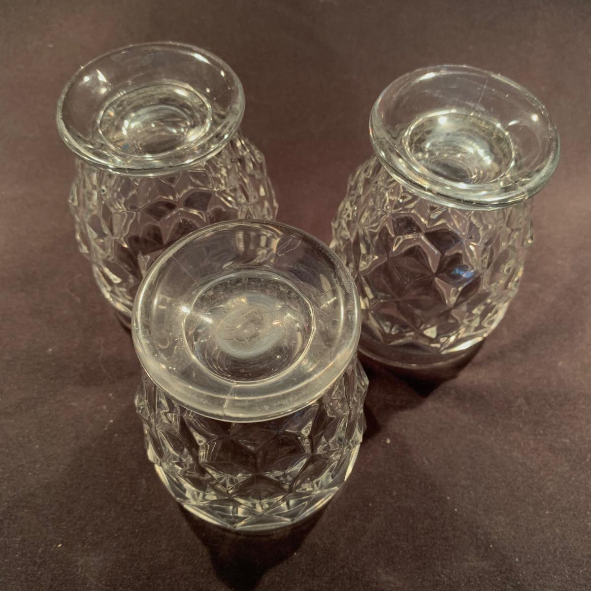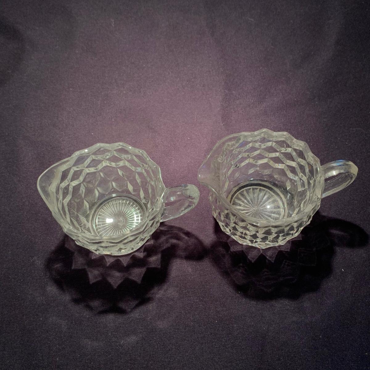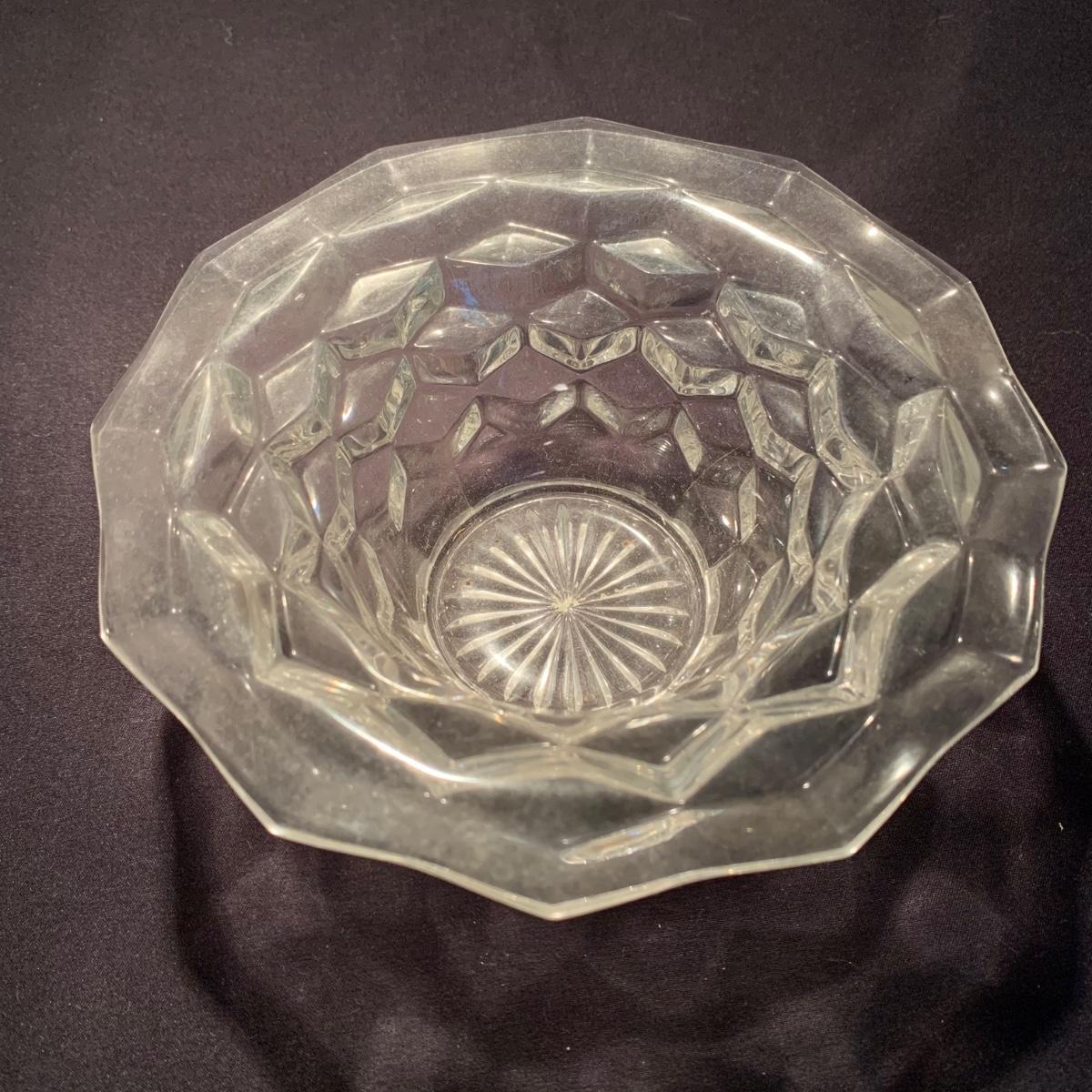18 Fostoria style glass items. Set includes some glasses, votive candle holders, candy and nut dishes, small pitchers, a bowl, and a triangular lidded dish. Most items are in good condition. One of the square shaped votive holders has a crack. All items are a bit dusty and could use a good cleaning. The rectangular dish measures 9.25” x 6.5” x 1.75”. The three glasses are 4.25” tall. Shipping available.