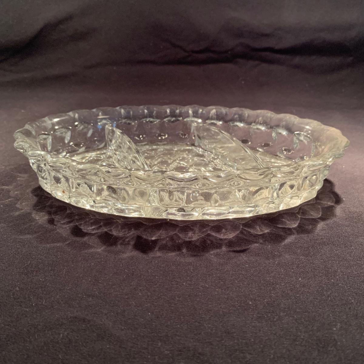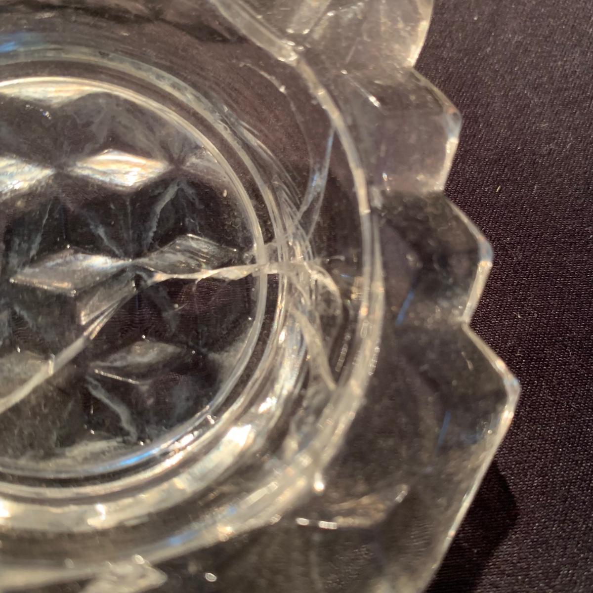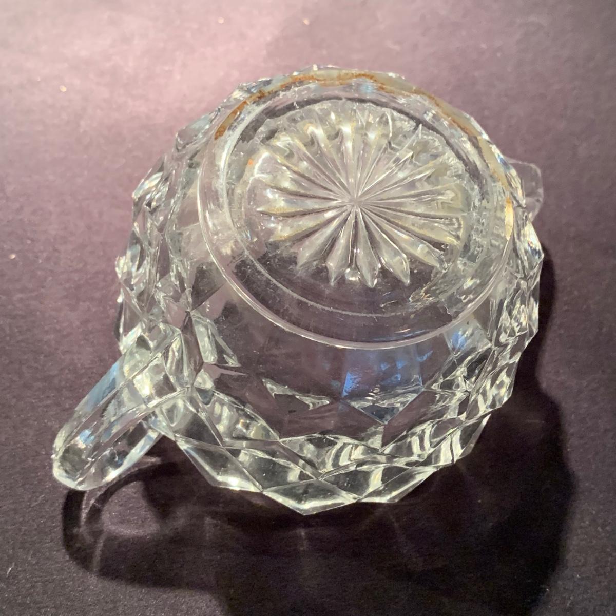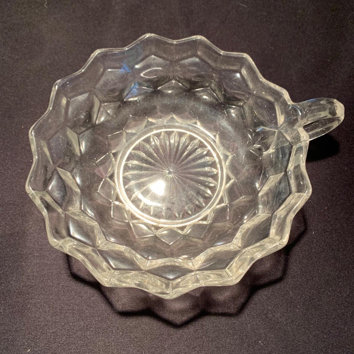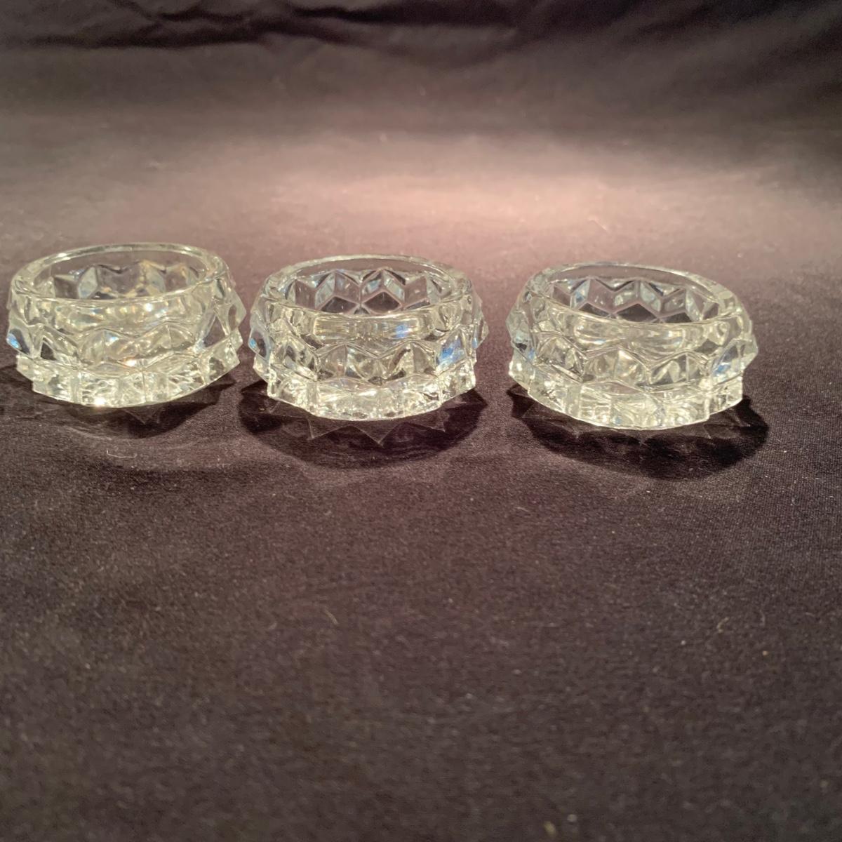 18 Fostoria style glass items. Set includes some glasses, votive candle holders, candy and nut dishes, small pitchers, a bowl, and a triangular lidded dish. Most items are in good condition. One of the square shaped votive holders has a crack. All items are a bit dusty and could use a good cleaning. The rectangular dish measures 9.25” x 6.5” x 1.75”. The three glasses are 4.25” tall. Shipping available.