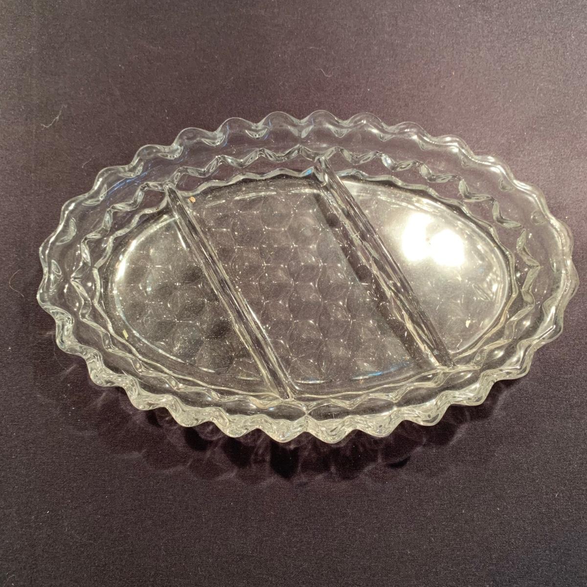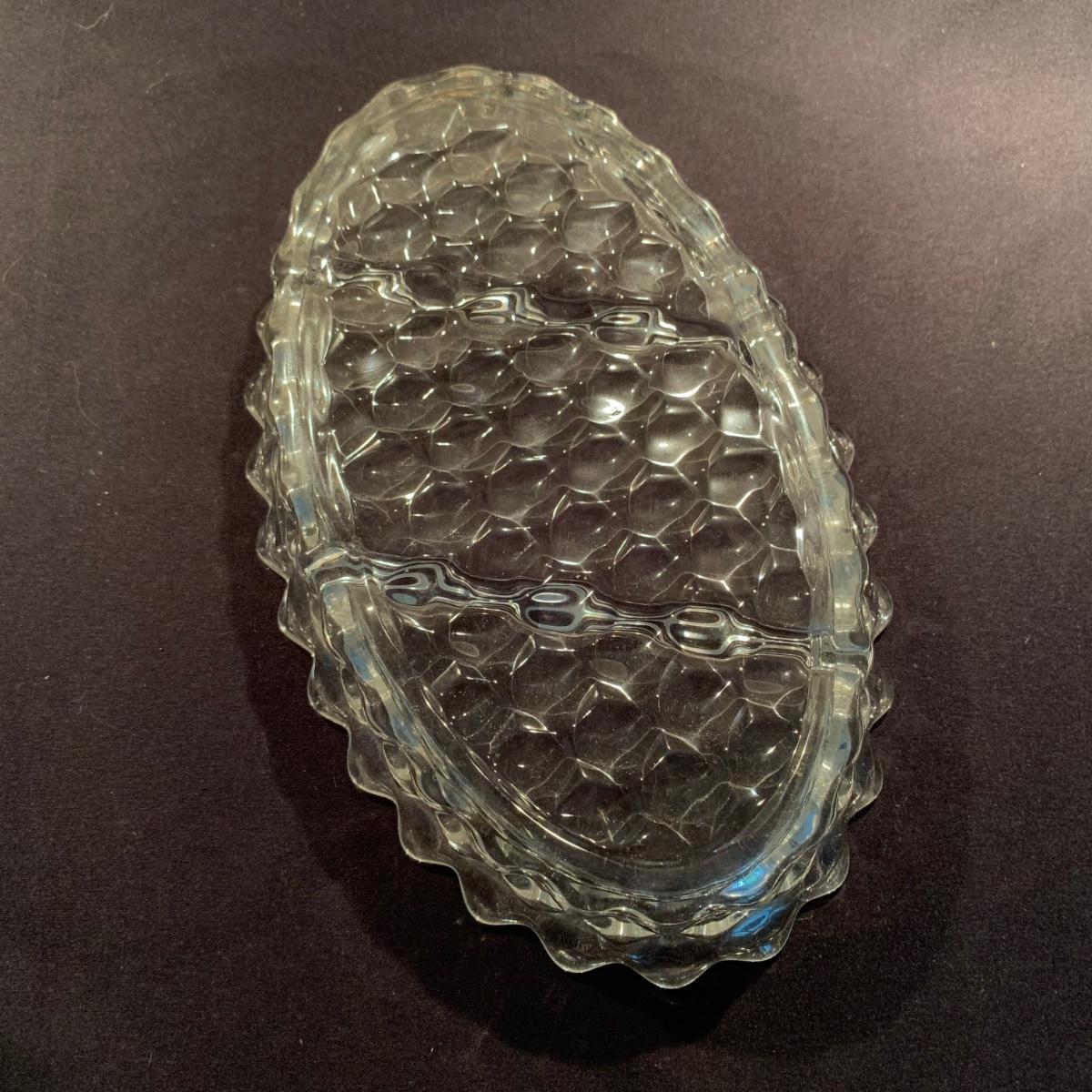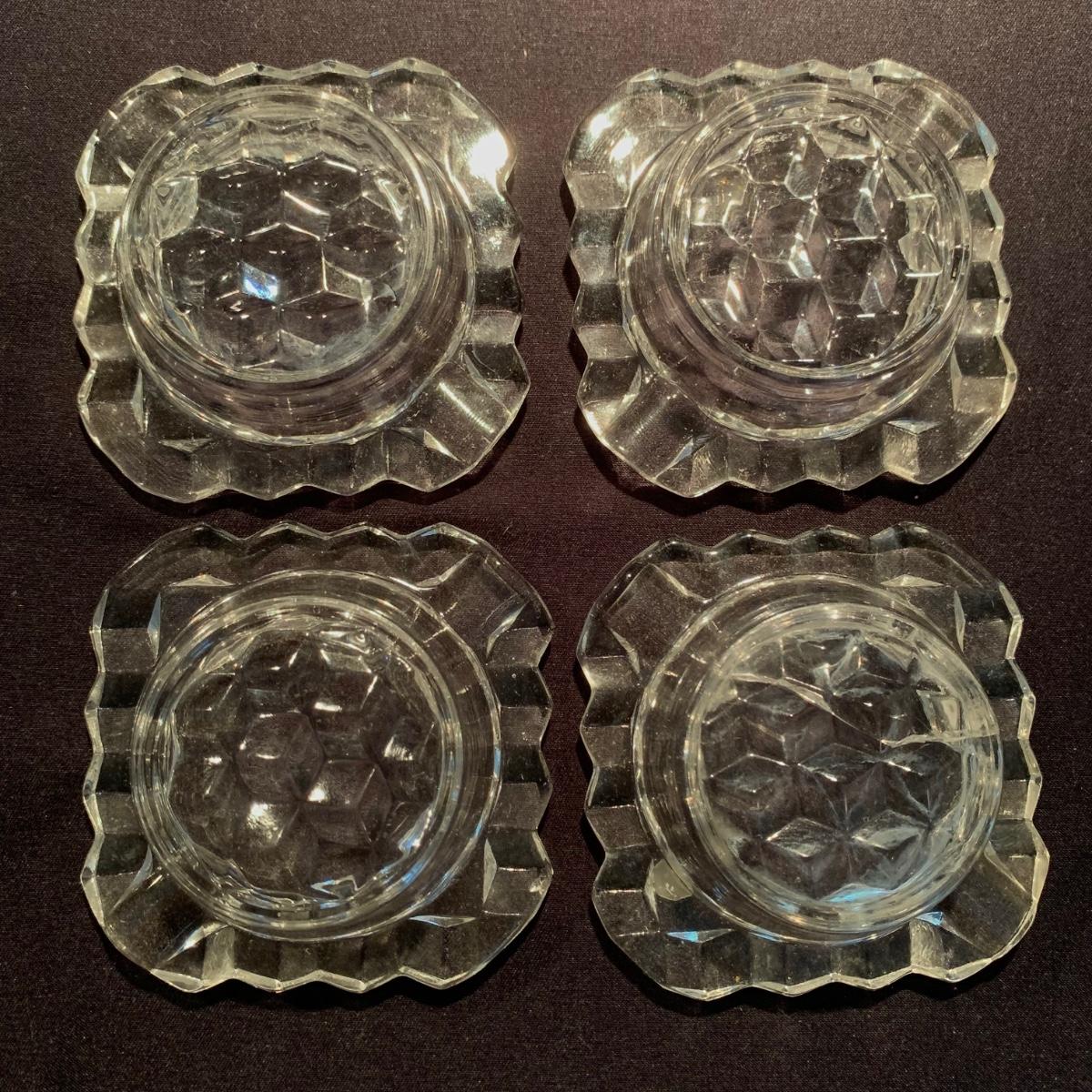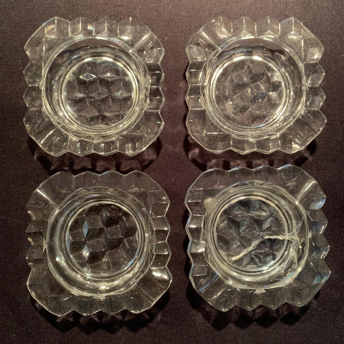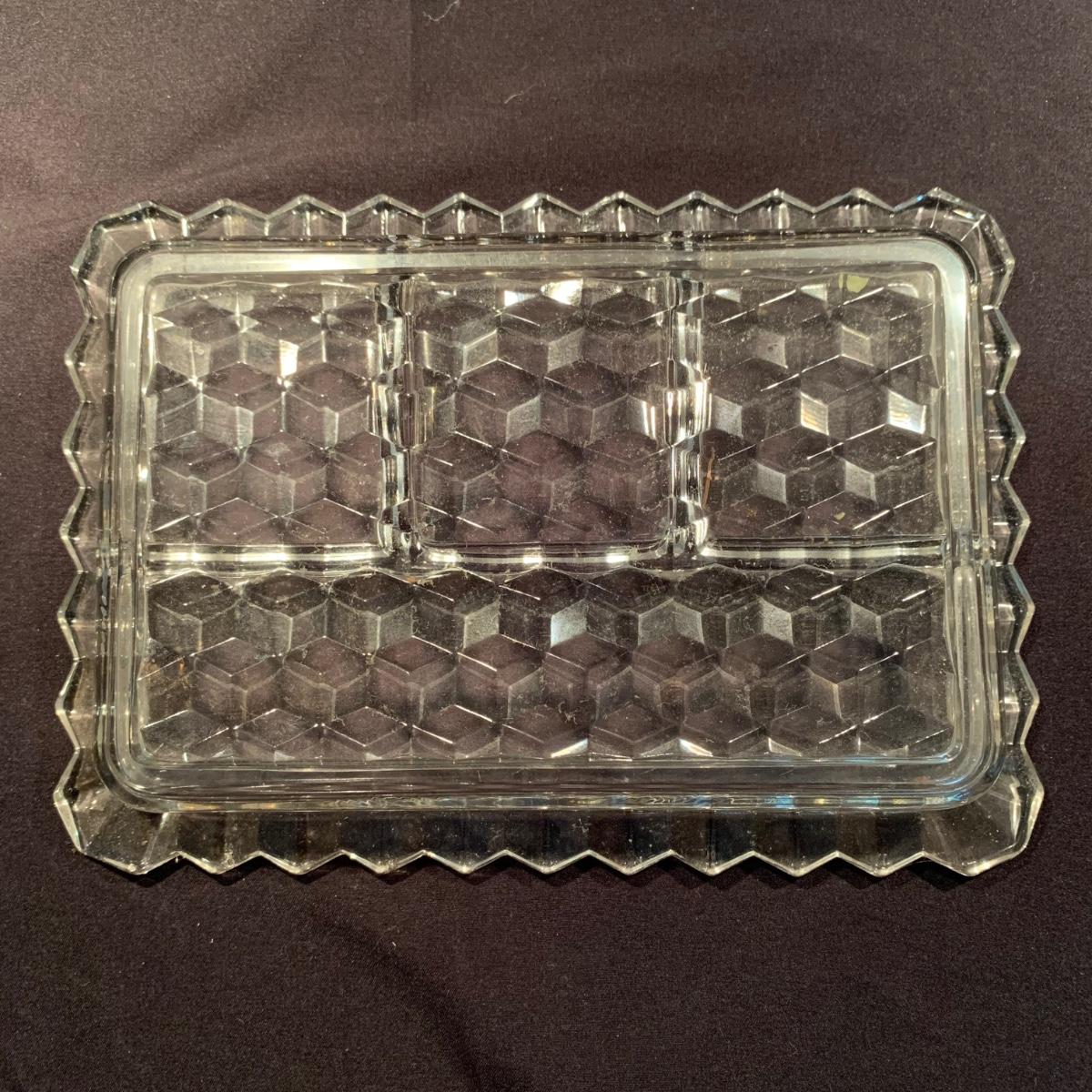 18 Fostoria style glass items. Set includes some glasses, votive candle holders, candy and nut dishes, small pitchers, a bowl, and a triangular lidded dish. Most items are in good condition. One of the square shaped votive holders has a crack. All items are a bit dusty and could use a good cleaning. The rectangular dish measures 9.25” x 6.5” x 1.75”. The three glasses are 4.25” tall. Shipping available.