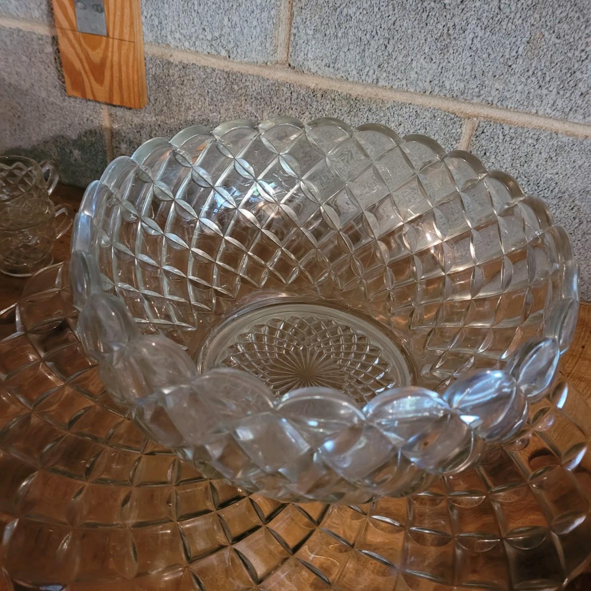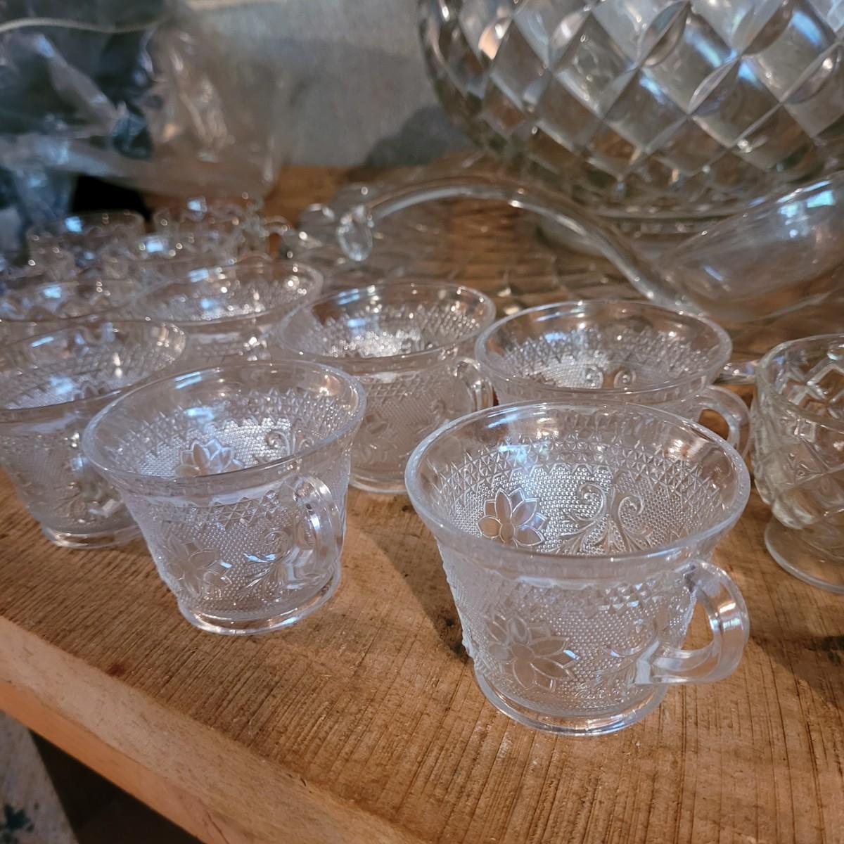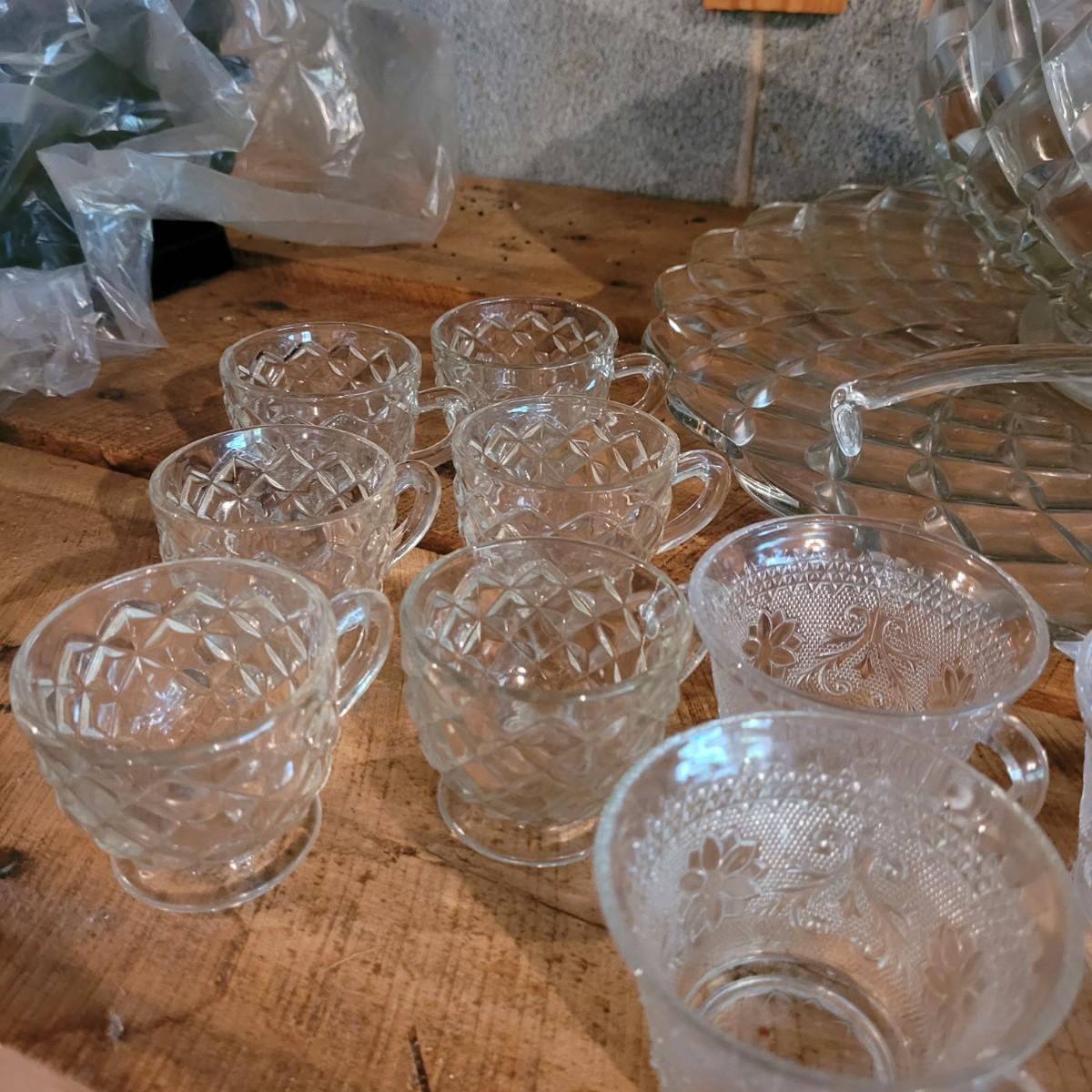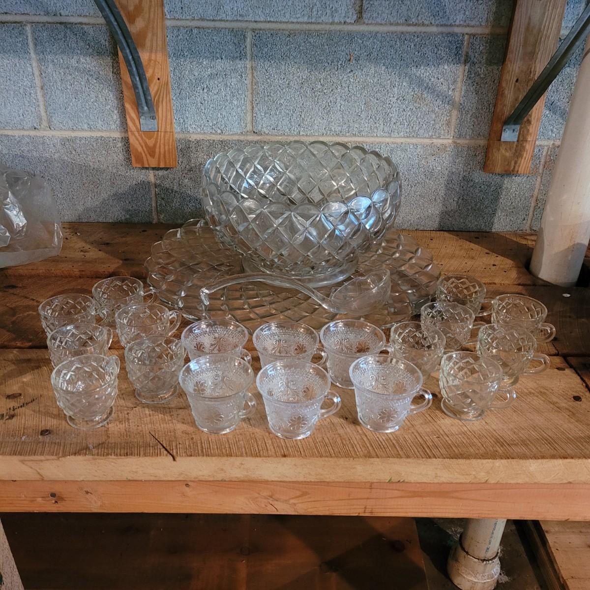 Large glass punch bowl with serving dish, glass ladle and 18 cups. 12 cups match the punch bowl and another set of six is included. Dish measures approximately 20.5"D. Shipping available.
