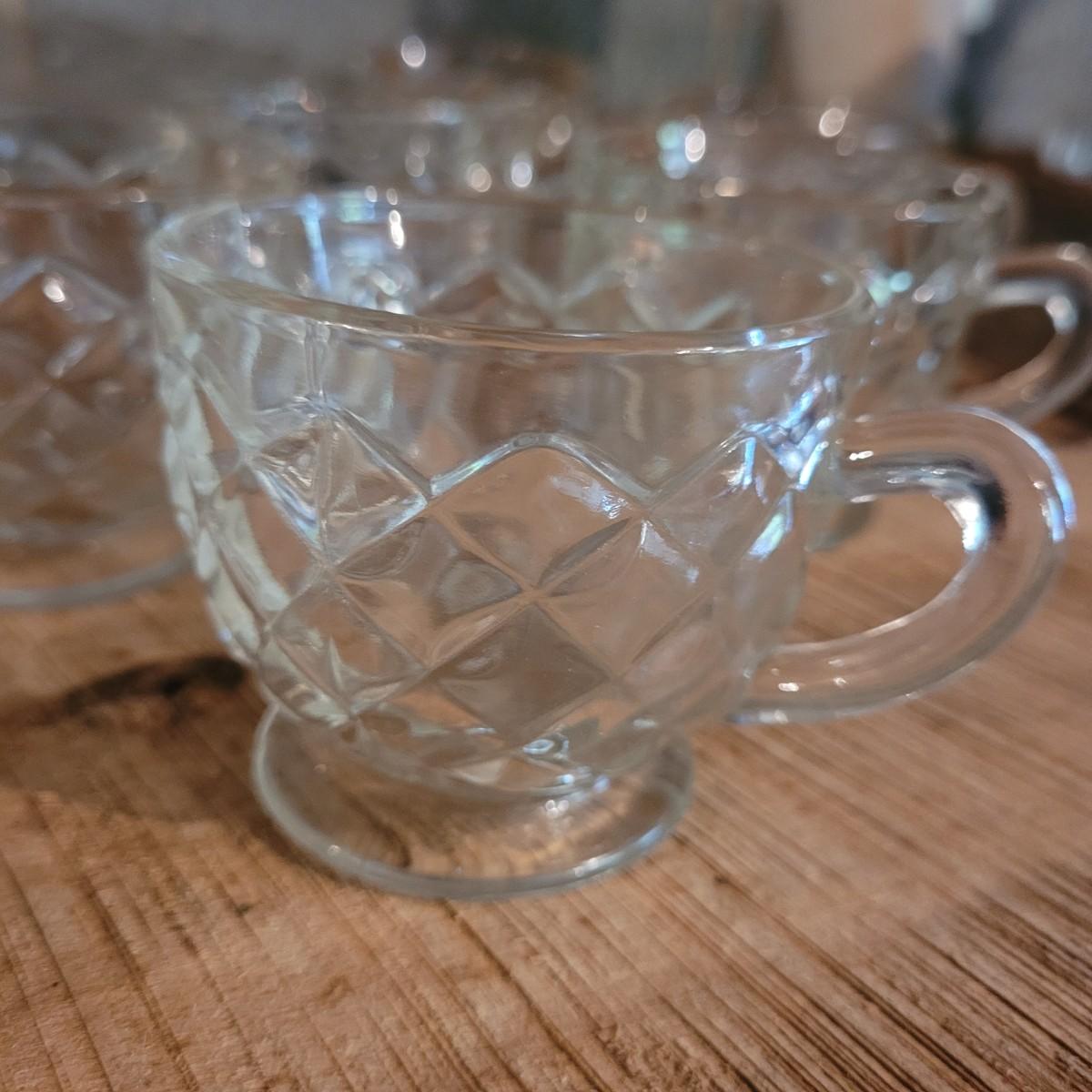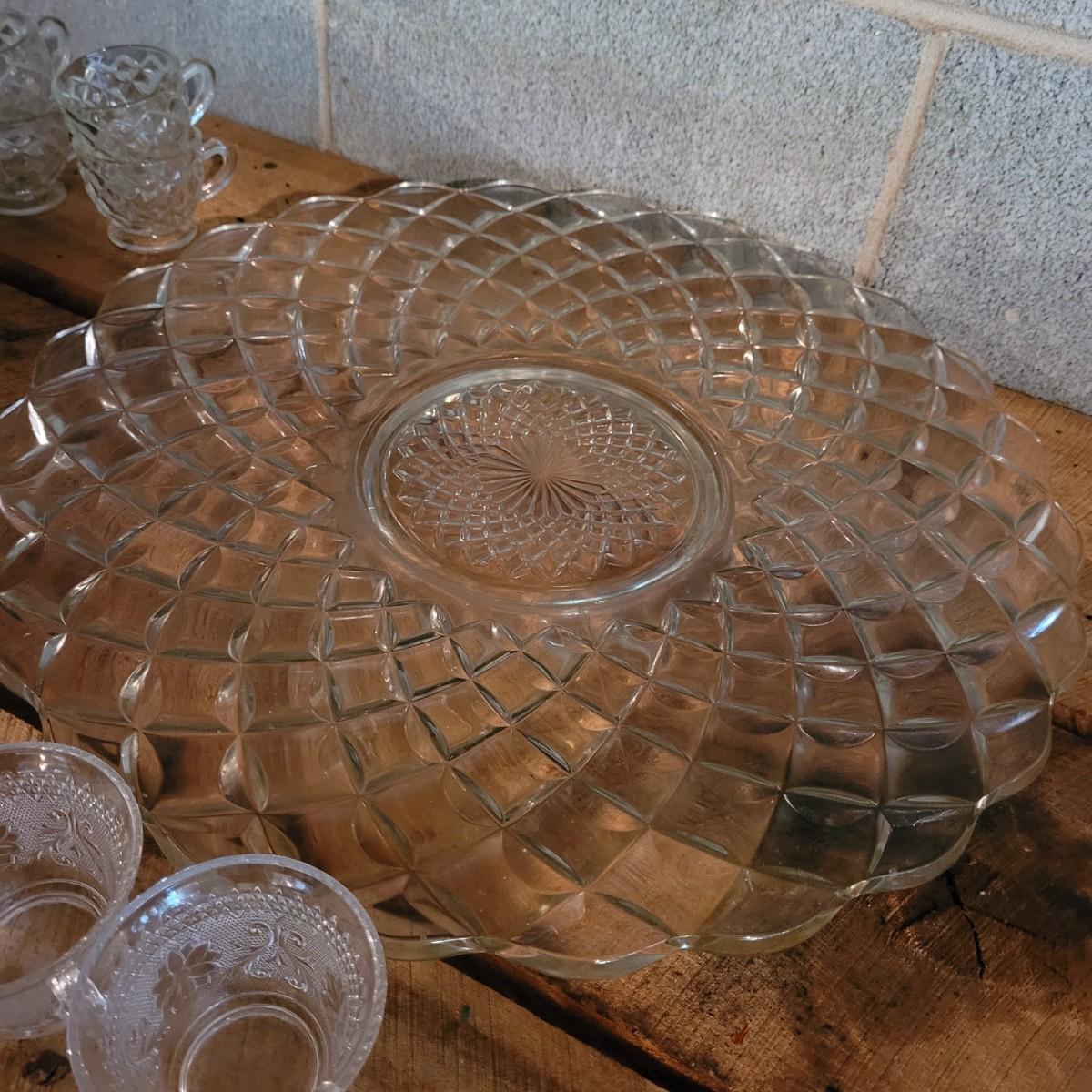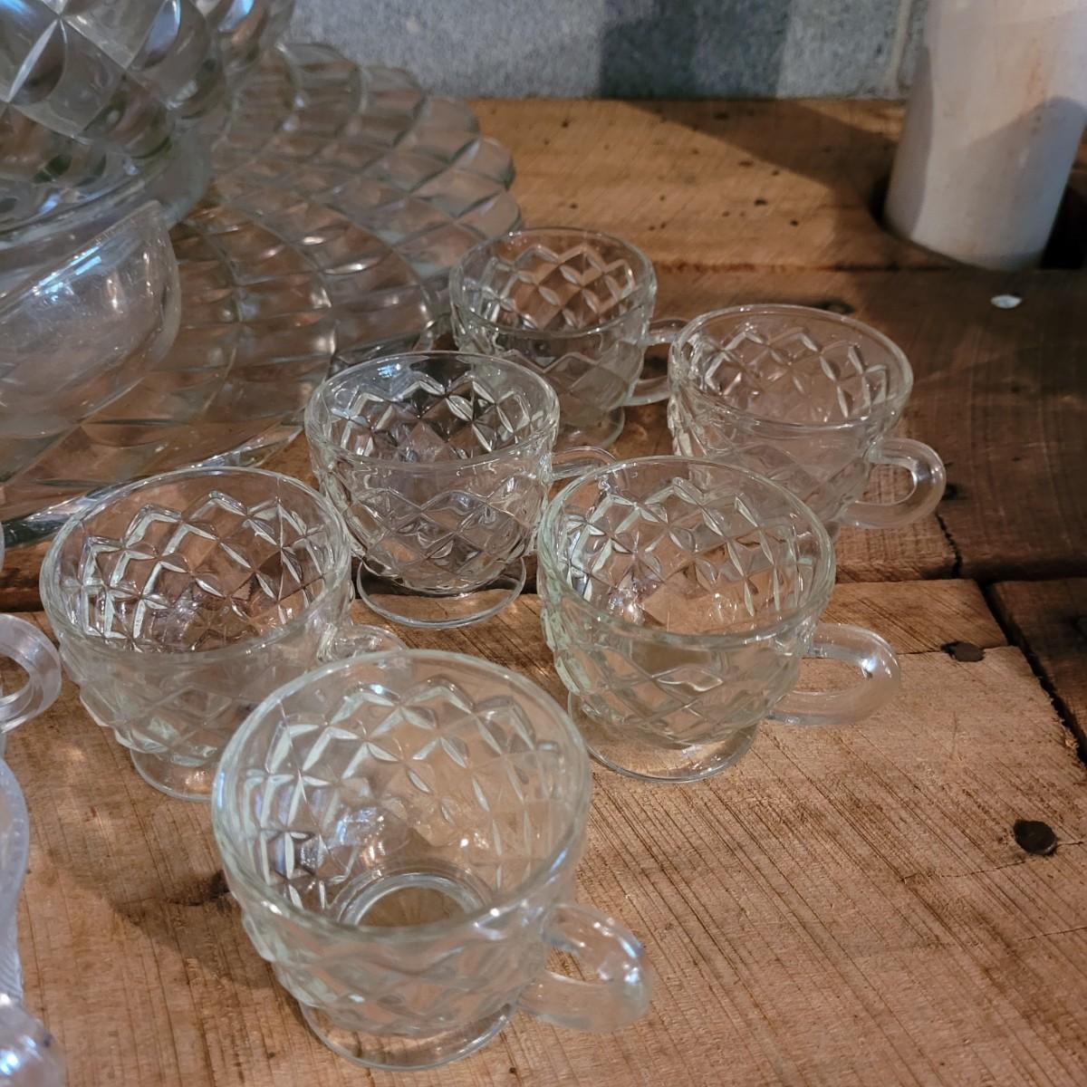 Large glass punch bowl with serving dish, glass ladle and 18 cups. 12 cups match the punch bowl and another set of six is included. Dish measures approximately 20.5"D. Shipping available.