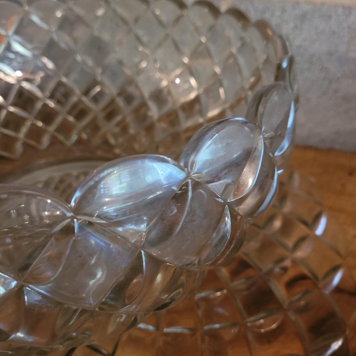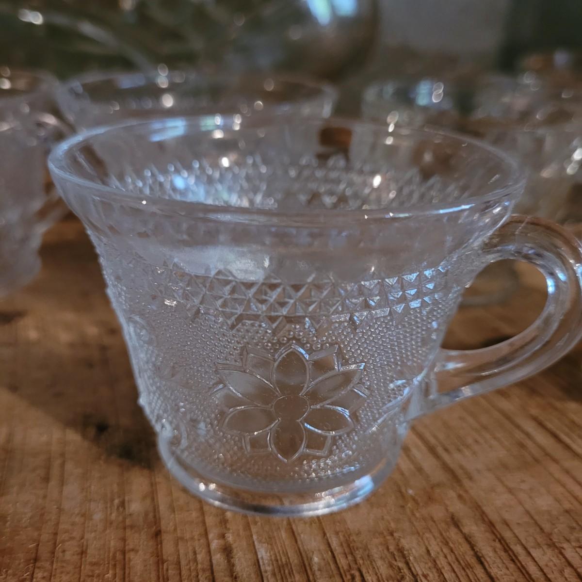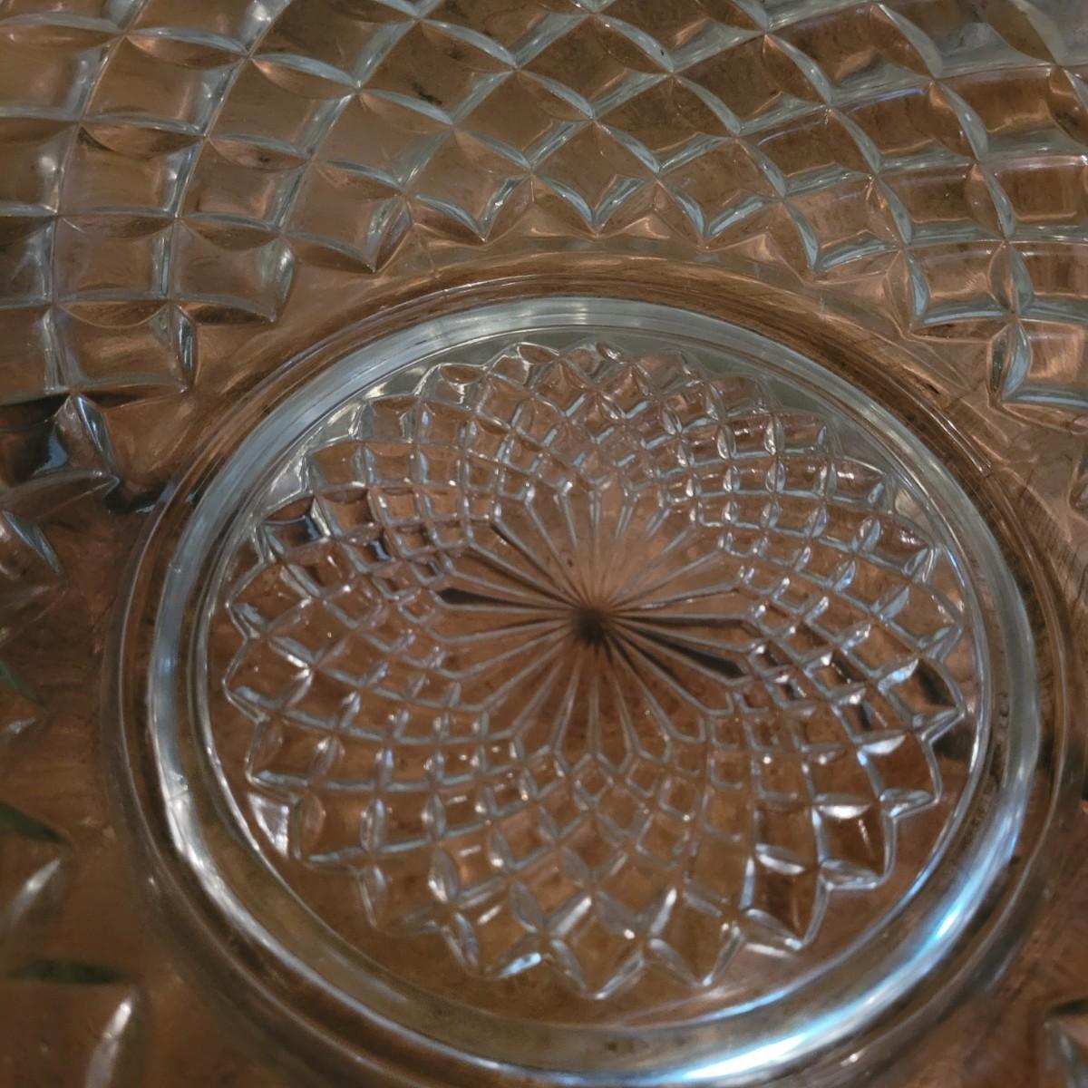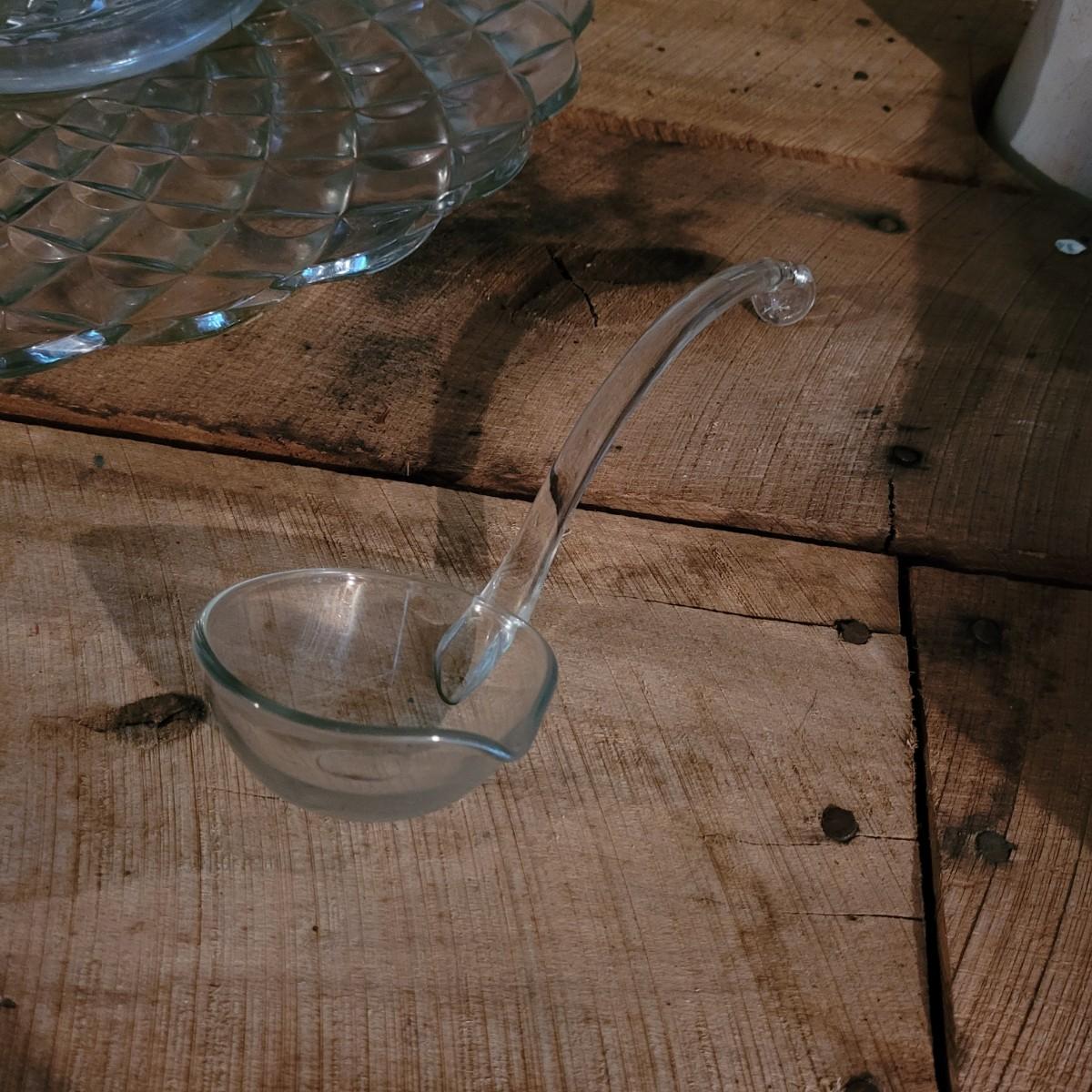 Large glass punch bowl with serving dish, glass ladle and 18 cups. 12 cups match the punch bowl and another set of six is included. Dish measures approximately 20.5"D. Shipping available.