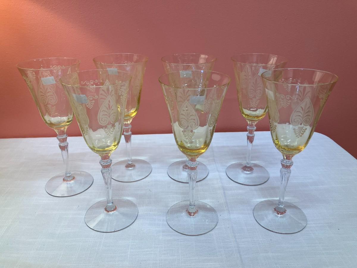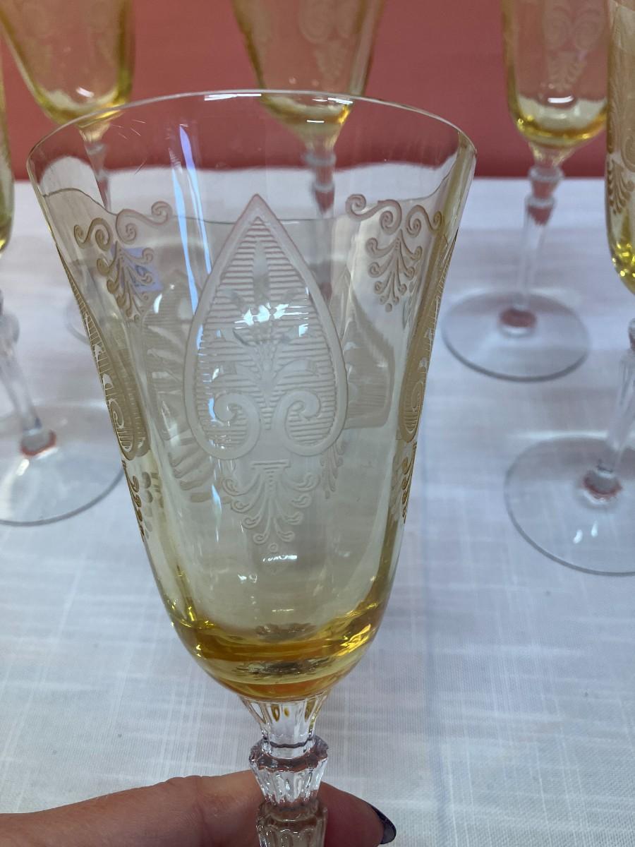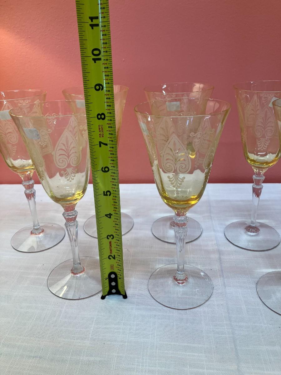 Amazing pieces of Trojan Topaz designed Fostoria glassware, produced 1929-1936. Gorgeous yellow topaz color and clarity. Some pieces may have minor chips due to age. Gorgeous etched design.