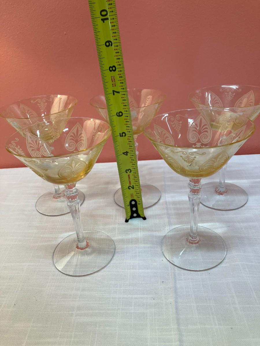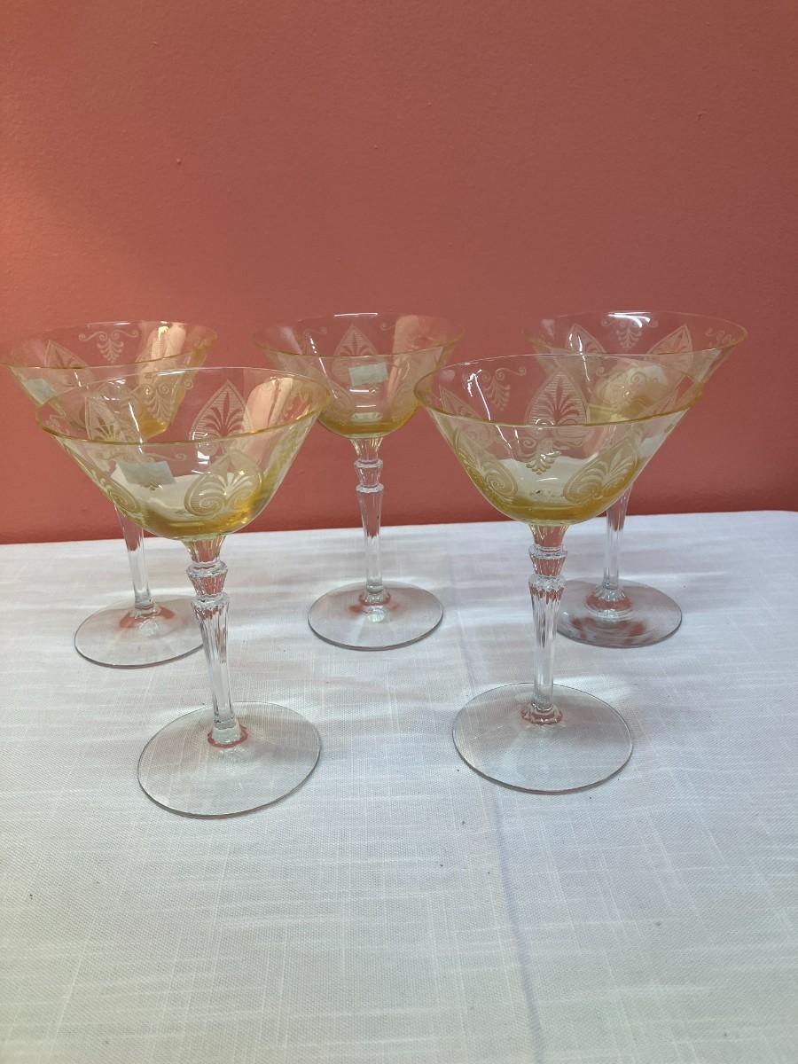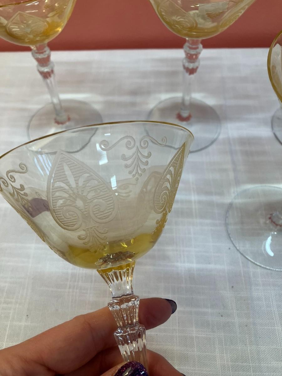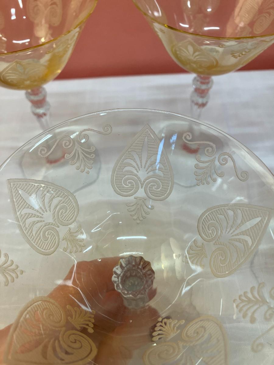 Amazing pieces of Trojan Topaz designed Fostoria glassware, produced 1929-1936. Gorgeous yellow topaz color and clarity. Some pieces may have minor chips due to age. Gorgeous etched design.