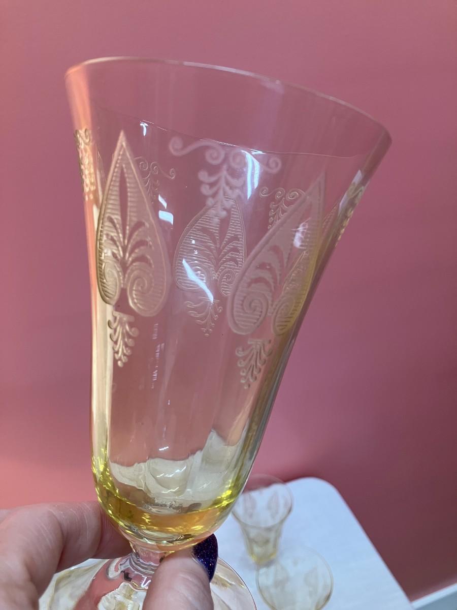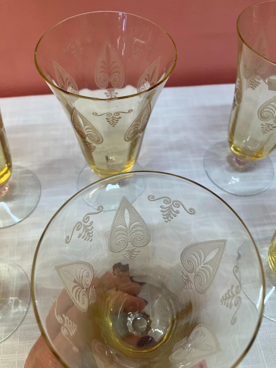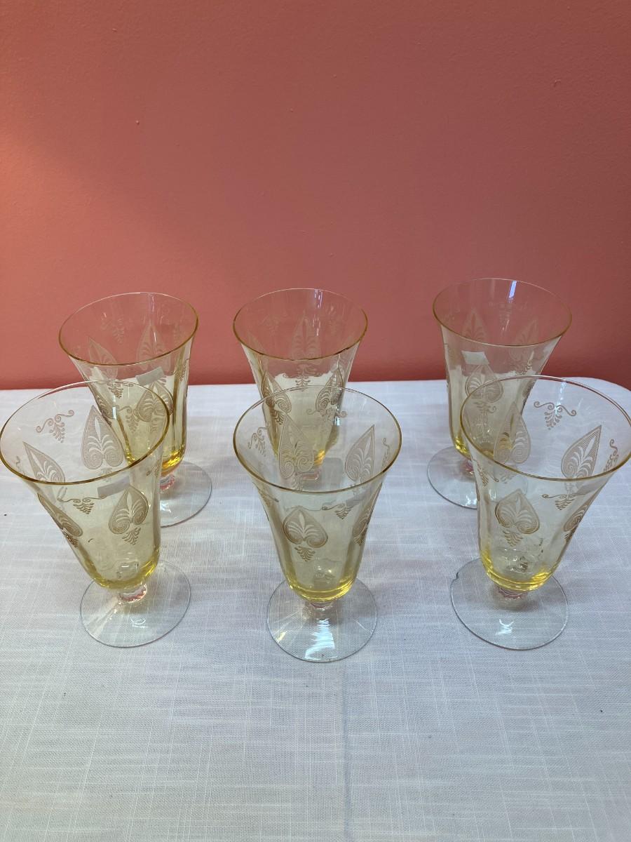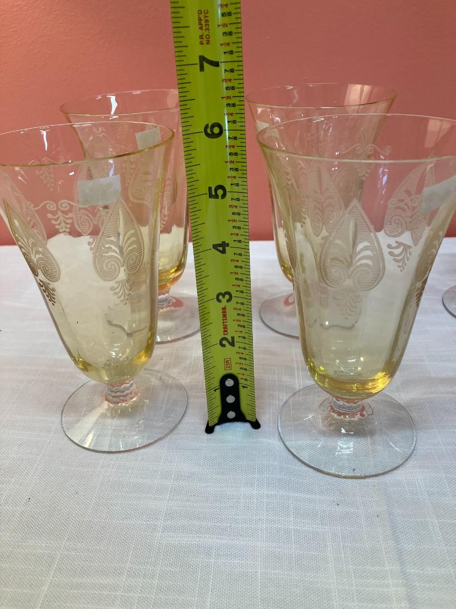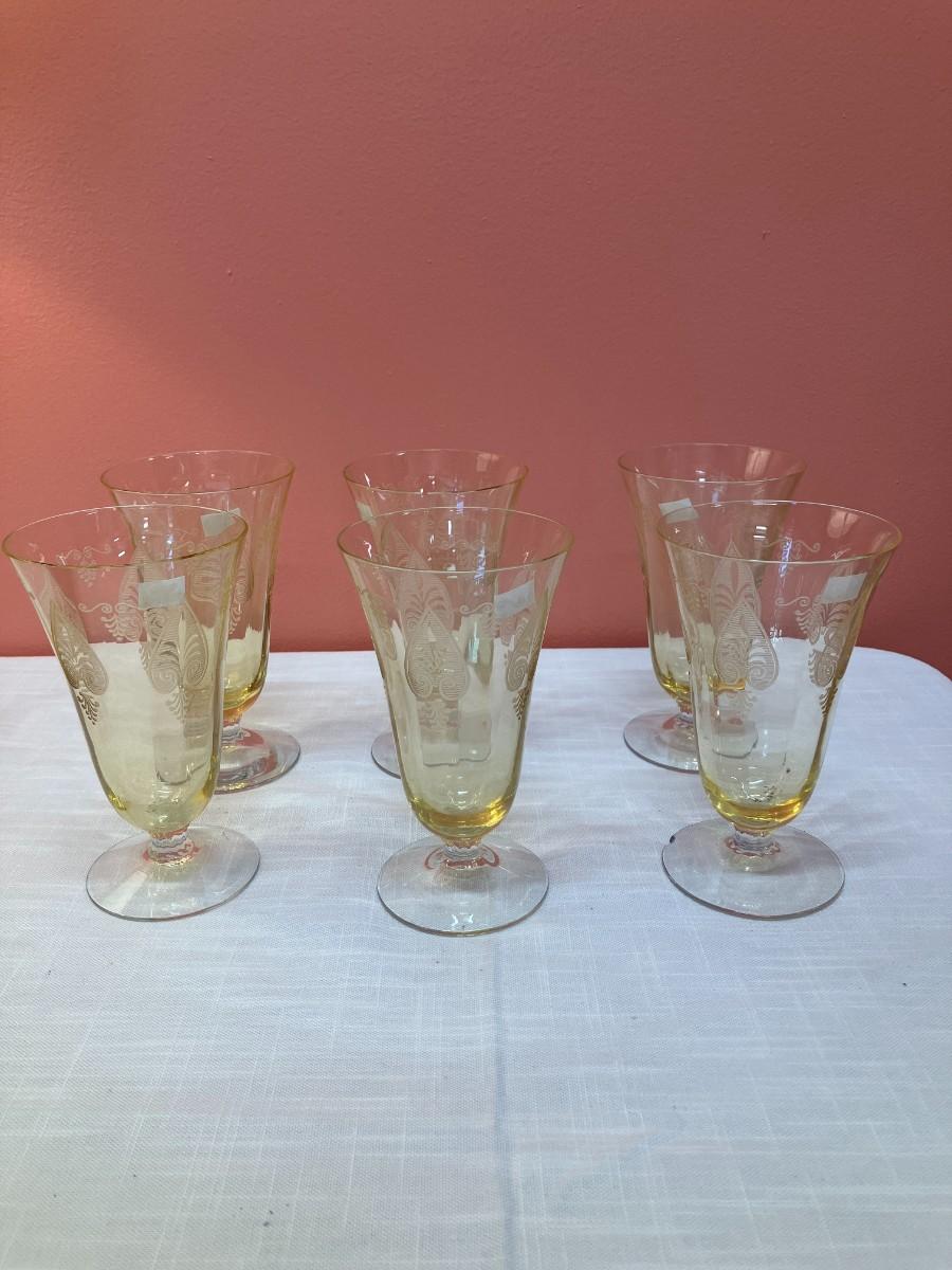 Amazing pieces of Trojan Topaz designed Fostoria glassware, produced 1929-1936. Gorgeous yellow topaz color and clarity. Some pieces may have minor chips due to age. Gorgeous etched design.