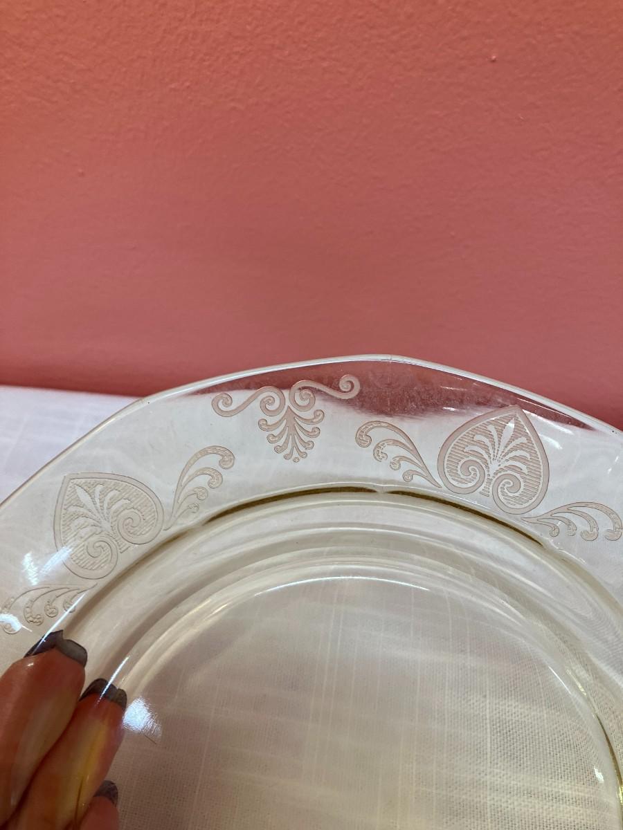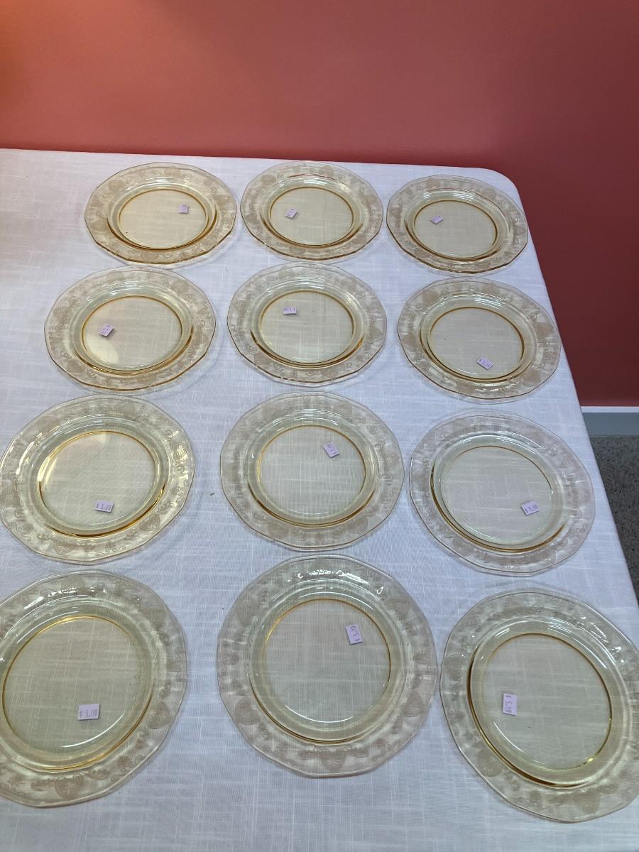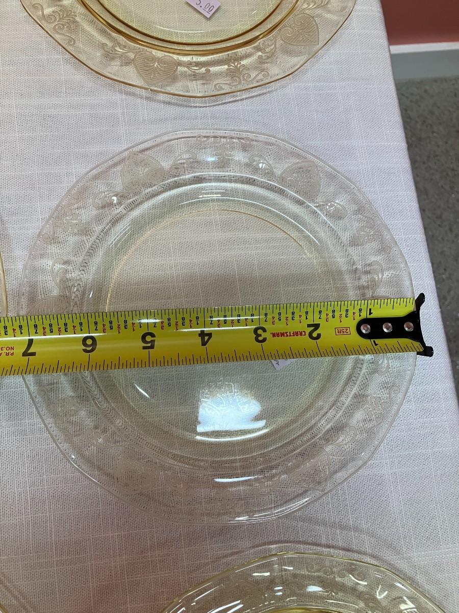 Amazing pieces of Trojan Topaz designed Fostoria glassware, produced 1929-1936. Gorgeous yellow topaz color and clarity. Some pieces may have minor chips due to age. Gorgeous etched design.