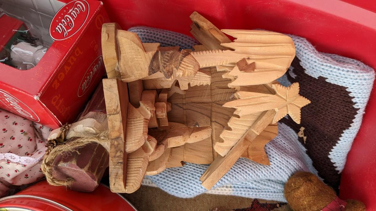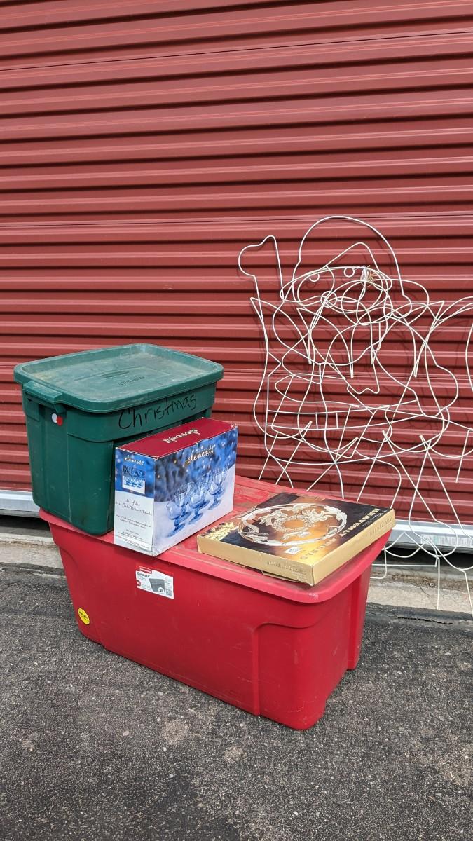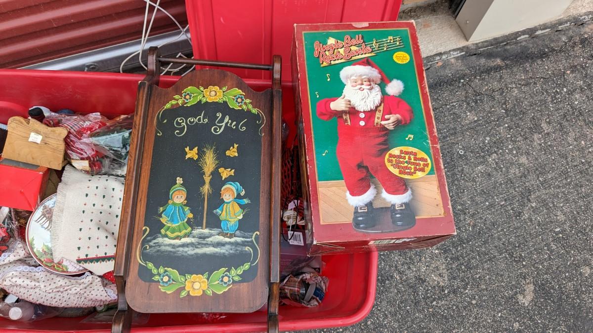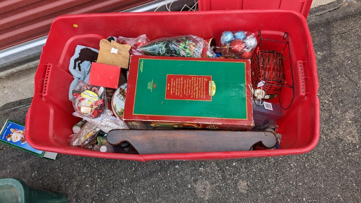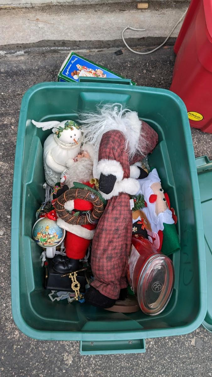 the last of what we could find in this liquidation. 2 totes full of Christmas goodies including a super cute folk art sled, yard ornaments, santa's, dishes and more! No shipping 2604