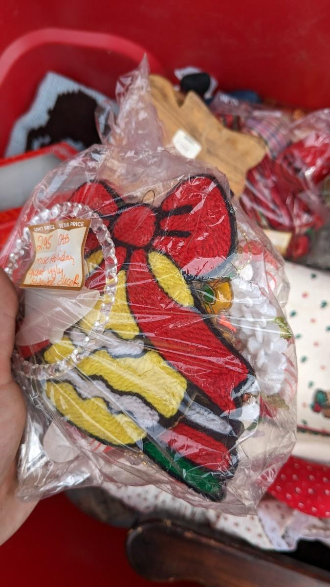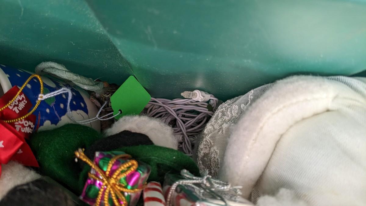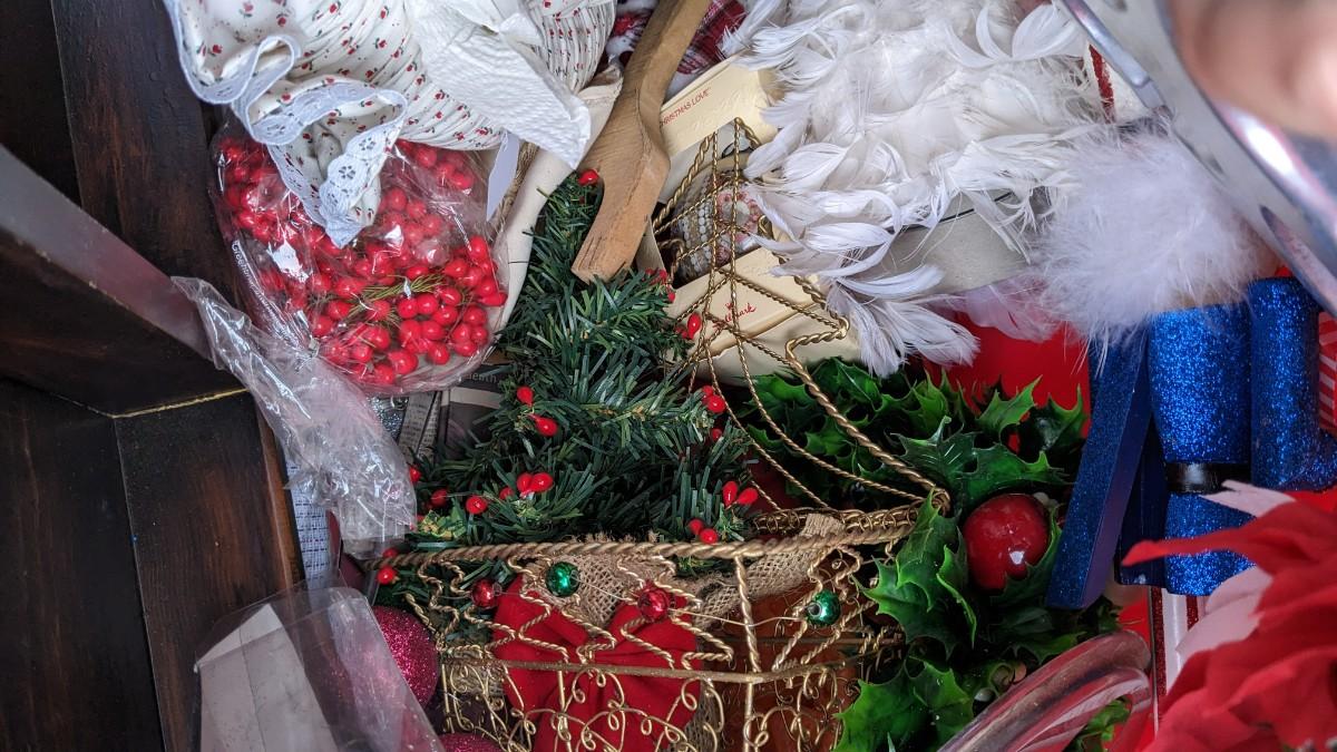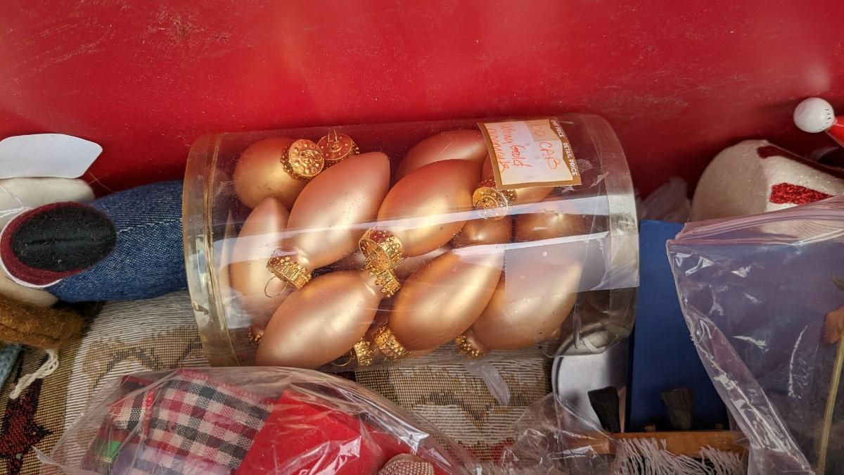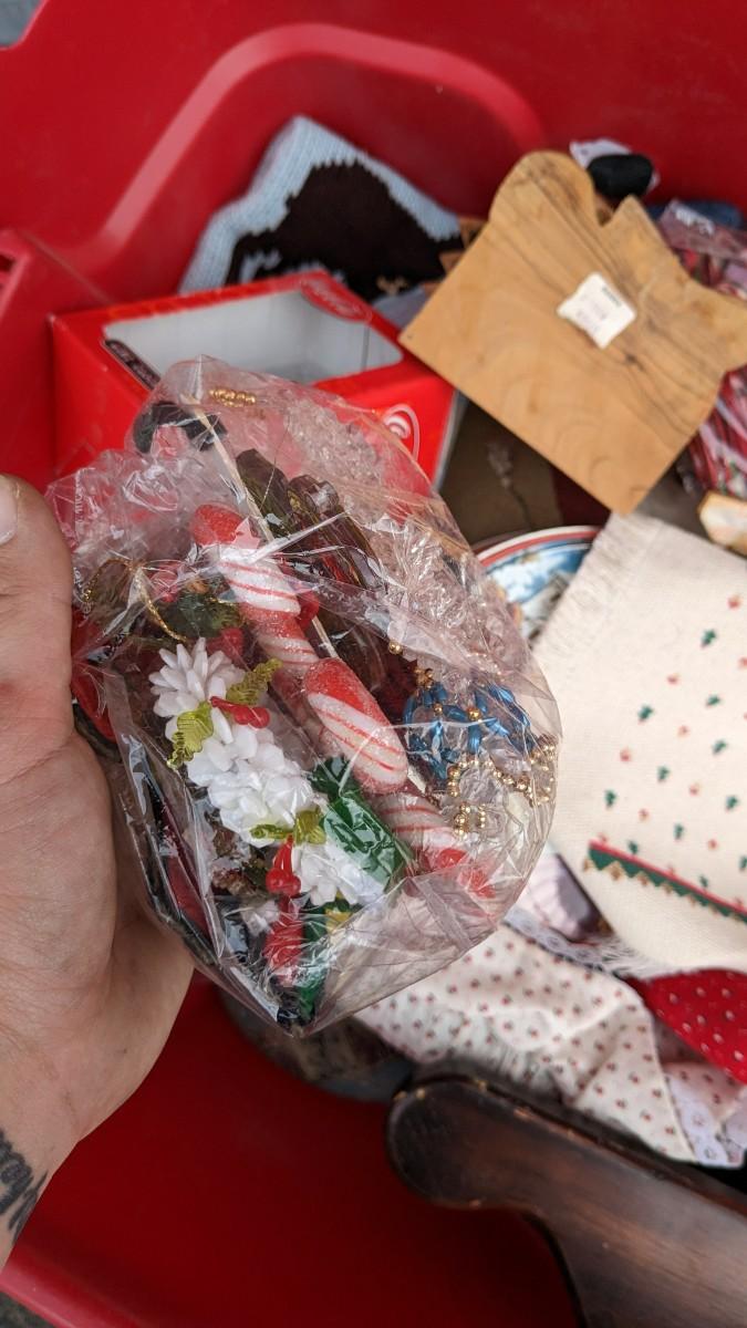 the last of what we could find in this liquidation. 2 totes full of Christmas goodies including a super cute folk art sled, yard ornaments, santa's, dishes and more! No shipping 2604