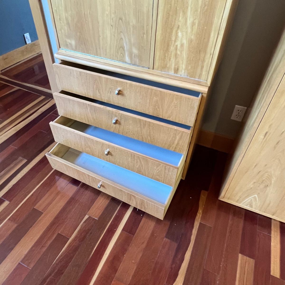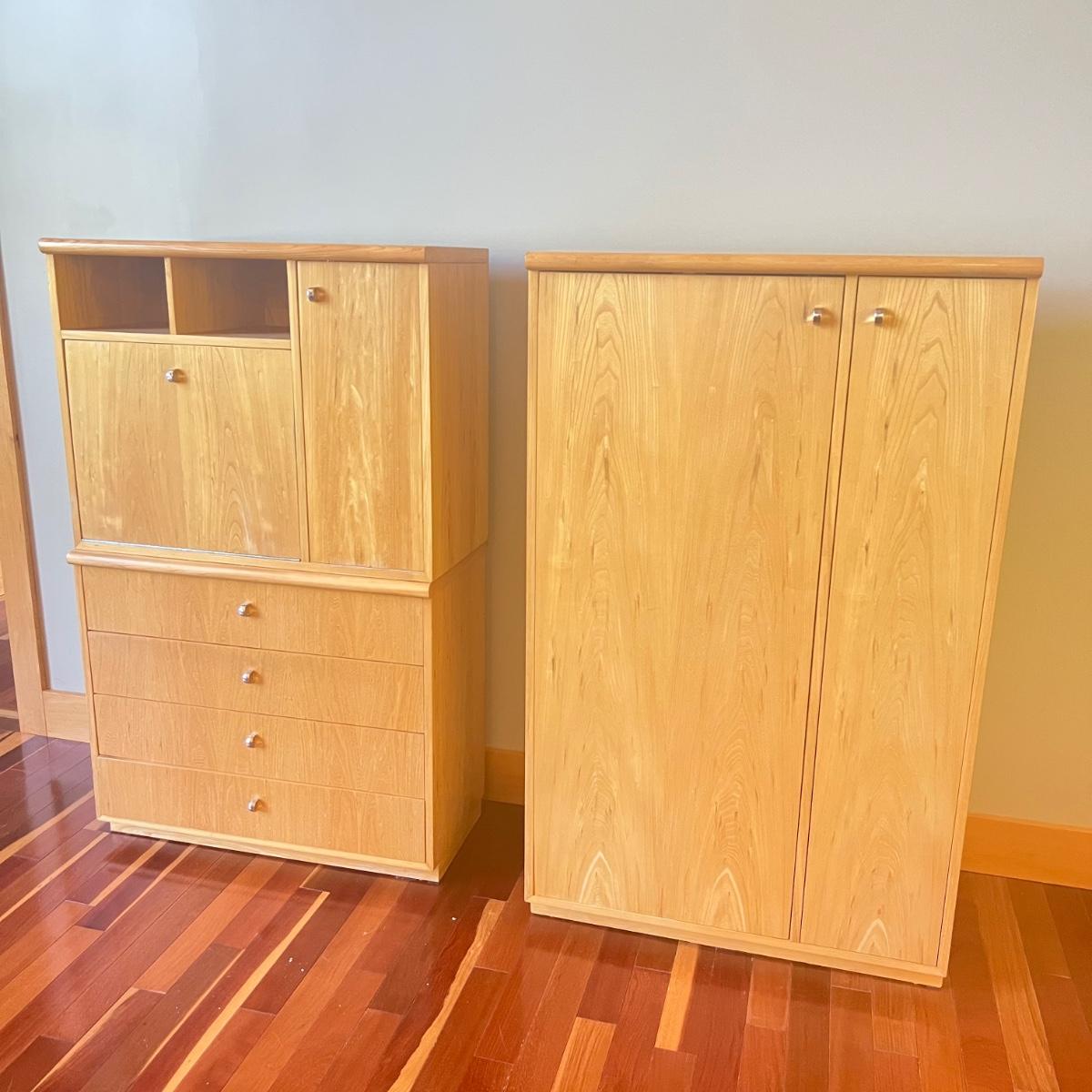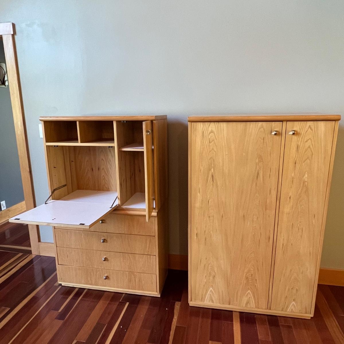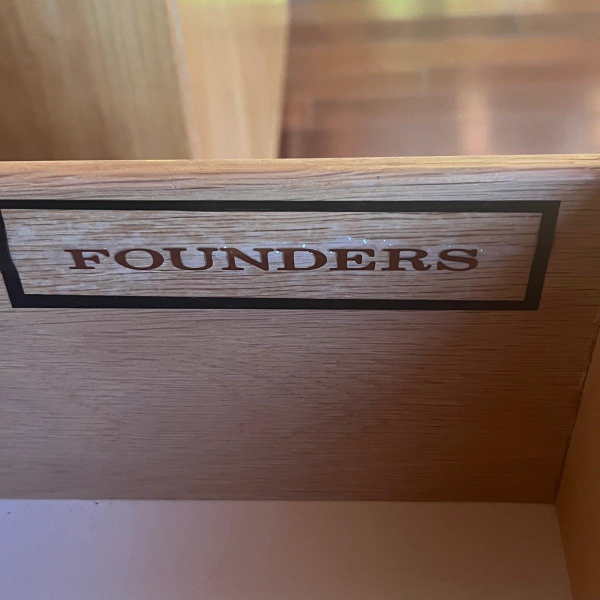 Three pieces of Founders wooden furniture includes a four drawer dresser, office unit with built in desk and a small wardrobe. The dresser and desk are currently stacked. There are a few minor nicks shown in images. Note the makers mark was found on just one unit but the other two appear to match and have identical hardware. Wardrobe measures 33” x 15” x 55.5”H.